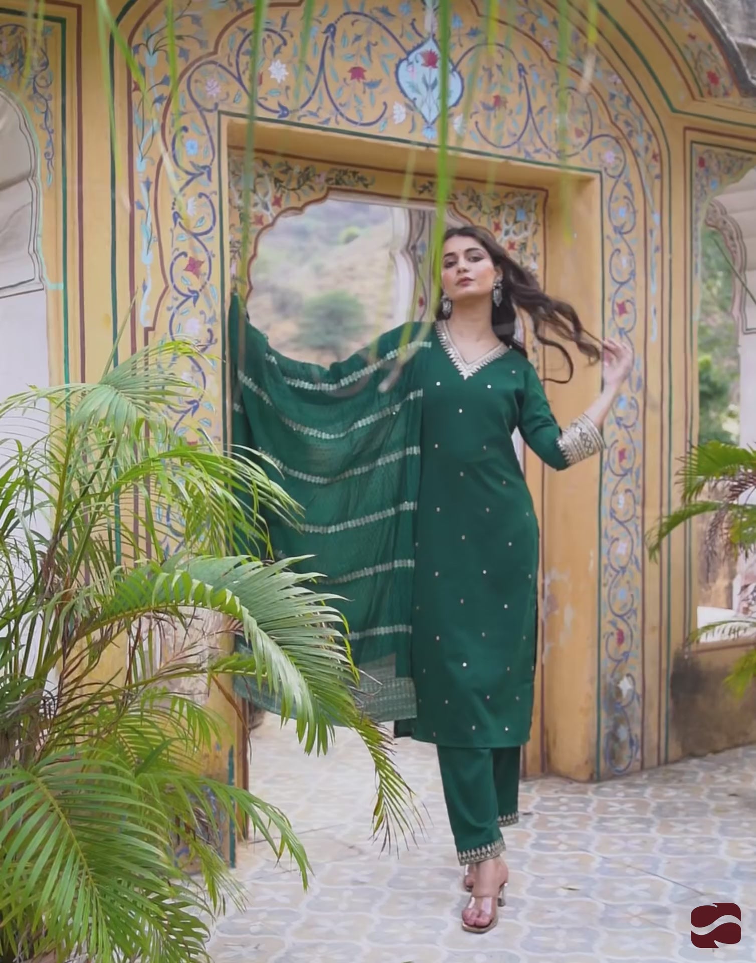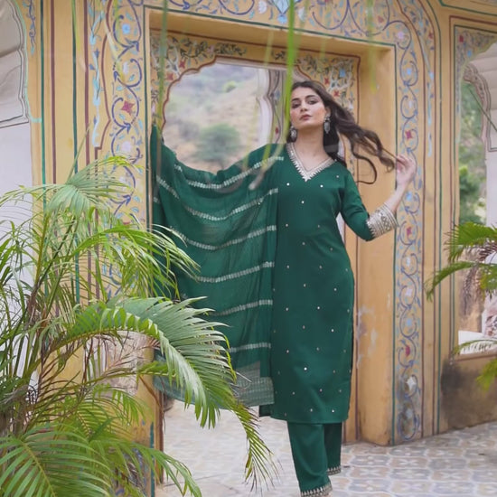 Dark Green Silk Sequence V Neck 3/4 Sleeve Straight Kurta Set With Pant & Dupatta
