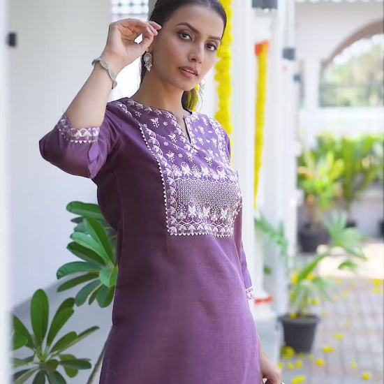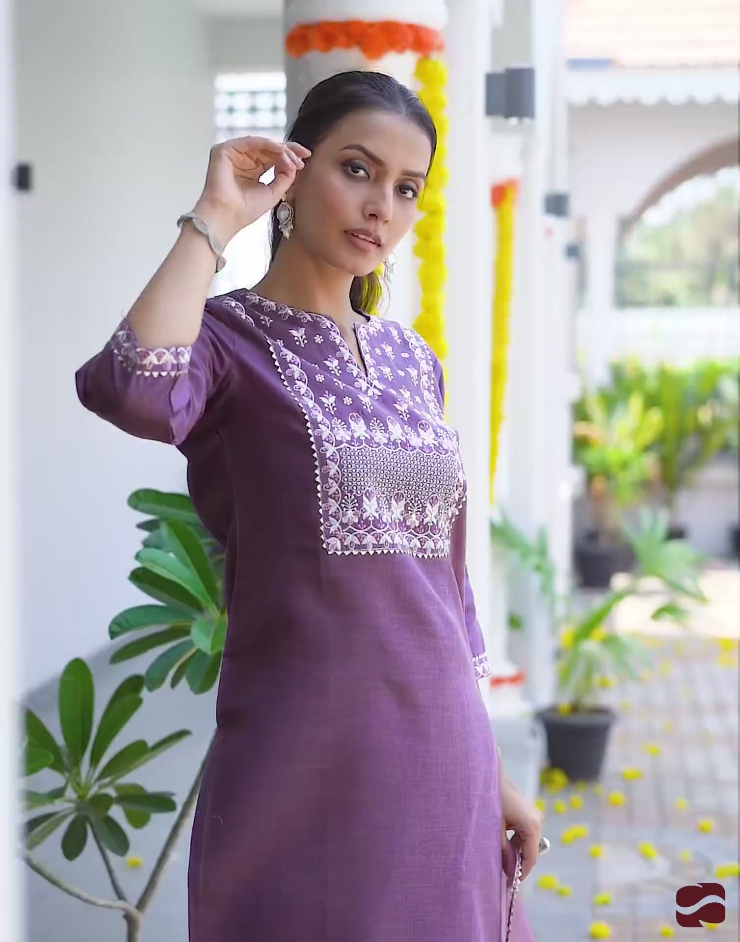 This Dark Lavender Cotton Blend kurta set is beautifully designed with Plain. The kurta features a V Neck and a graceful silhouette for an elegant appeal. It is paired with Pant With Pocket and a matching dupatta, making it a complete kurta set. Perfect for Everyday Wear, this ethnic wear for women offers lightweight fabric, comfortable wear, and timeless charm. Elegant Dupatta, Everyday Wear, Comfortable Wear.