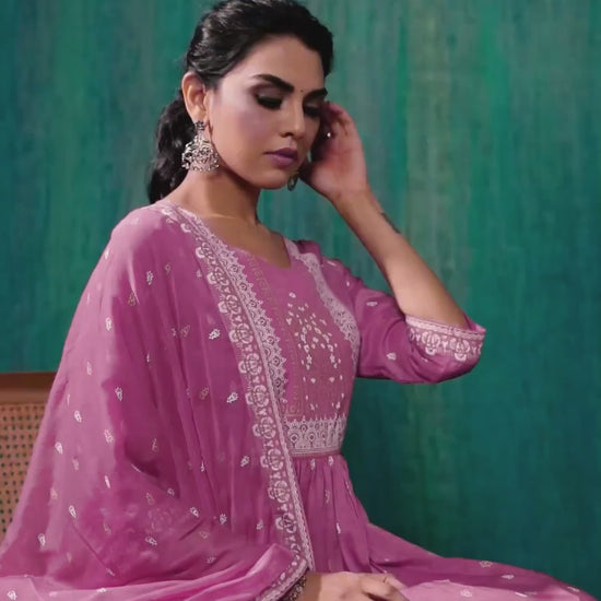 Dusty Pink Silk Pigment Print Round Neck 3/4 Sleeve Anarkali Kurta Set With Pant & Dupatta