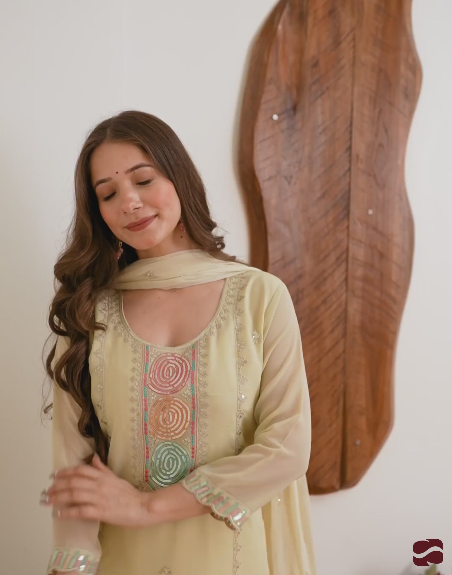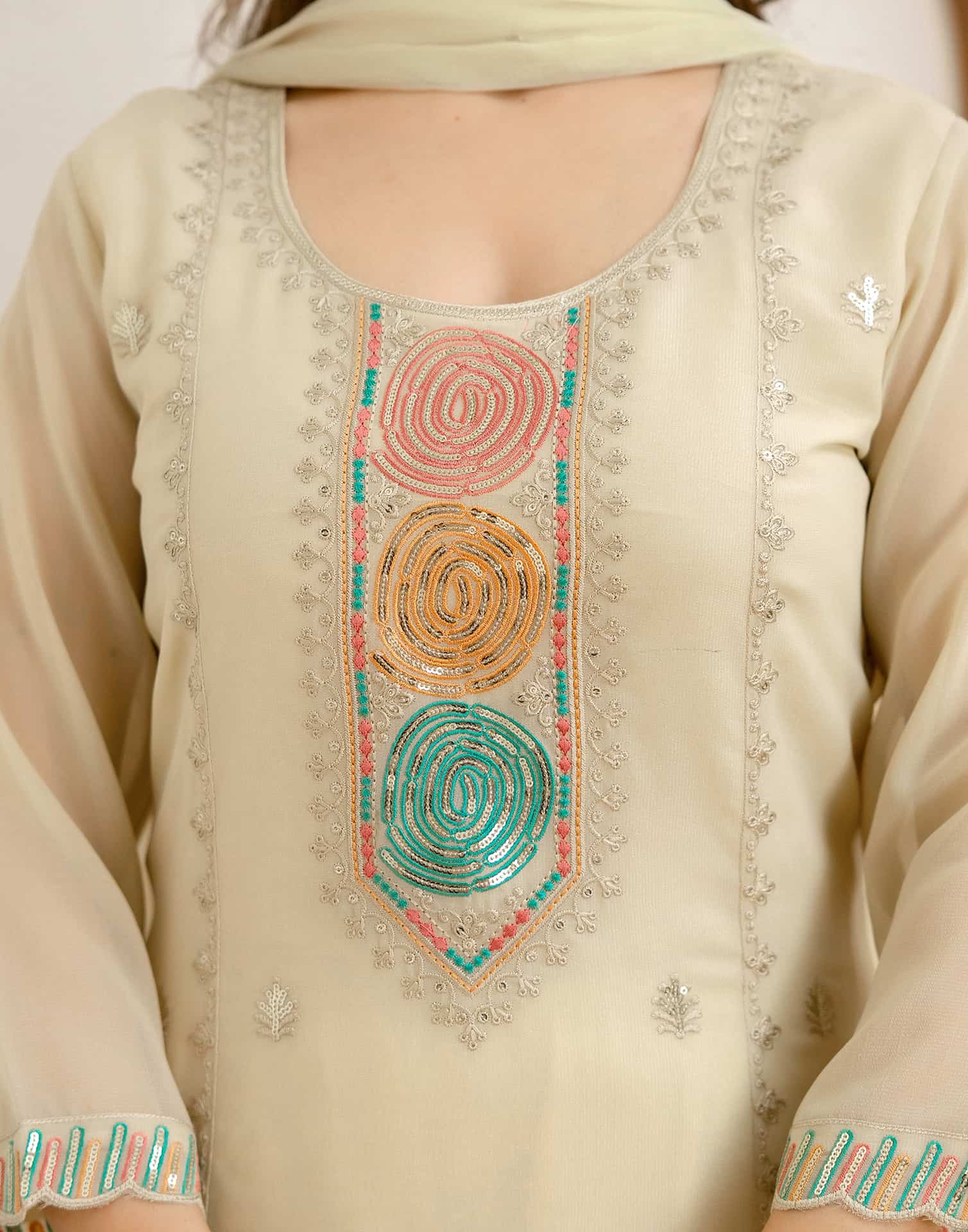 Bring elegance to every occasion with this Beige Georgette kurta set. Featuring Embroidery And Sequins Work on the kurta and a Round Neck, it radiates traditional charm. Styled with Pant and dupatta, this outfit is ideal for Festive Wear. Its soft & breathable fabric ensures breathability and ease of movement, while the dupatta adds a touch of grace. Casual Wear, Comfortable Fit, Soft & Breathable Fabric.