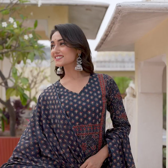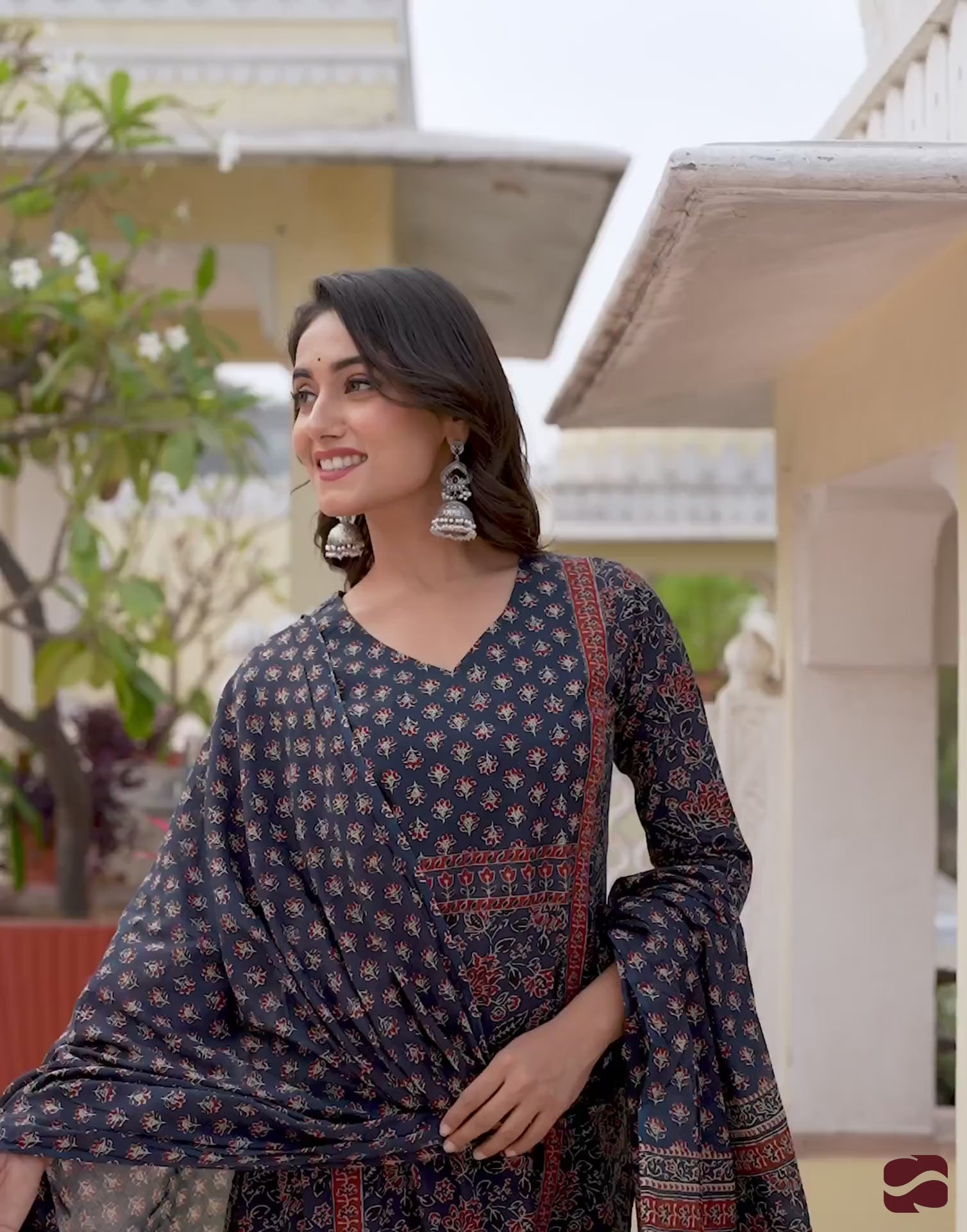 Bring elegance to every occasion with this Navy Blue Cotton kurta set. Featuring Printed on the kurta and a V Neck, it radiates traditional charm. Styled with Pant With Pocket and dupatta, this outfit is ideal for Casual Wear. Its premium fabric ensures breathability and ease of movement, while the dupatta adds a touch of grace. Graceful Silhouette, Soft & Breathable Fabric, Ease of Movement.