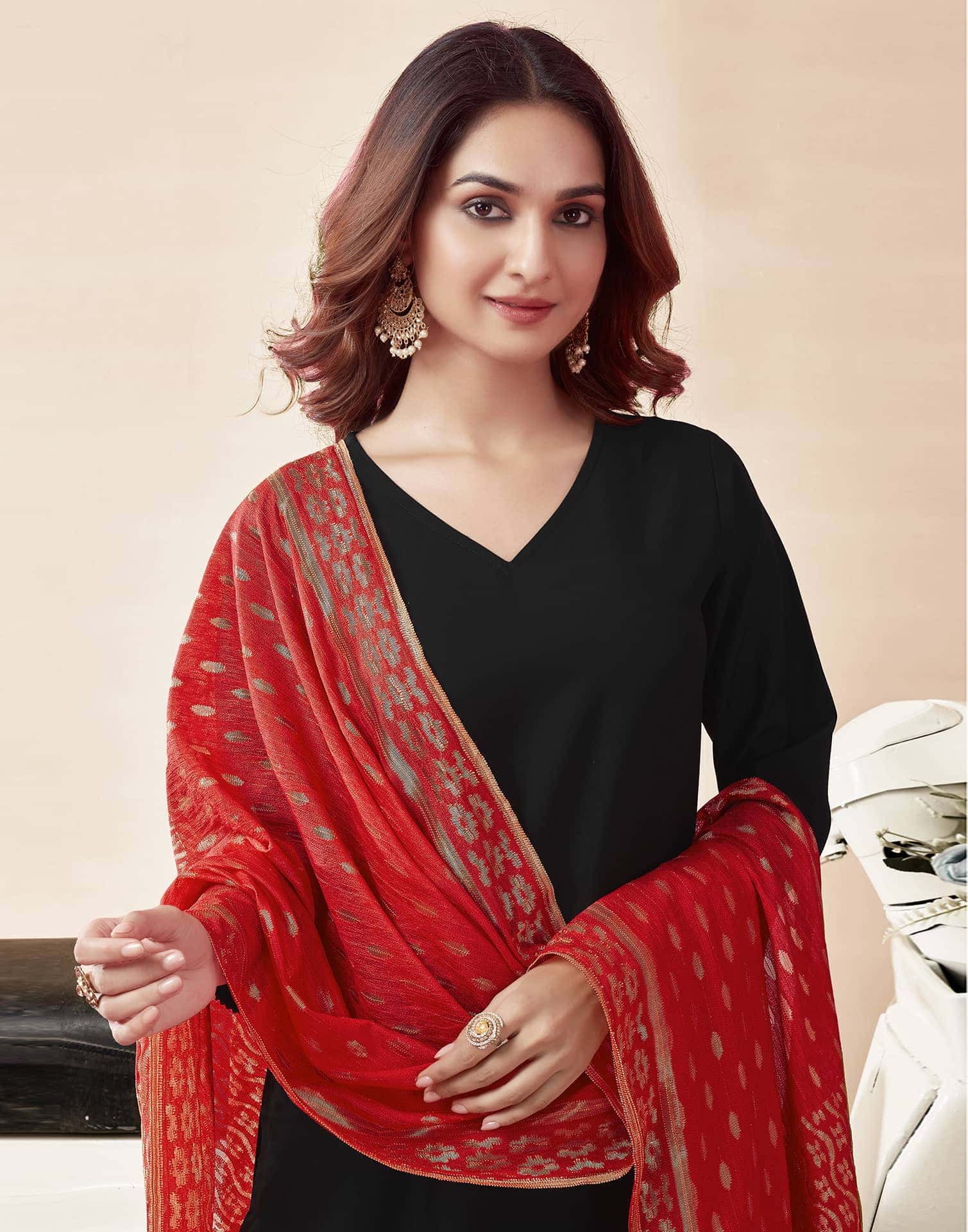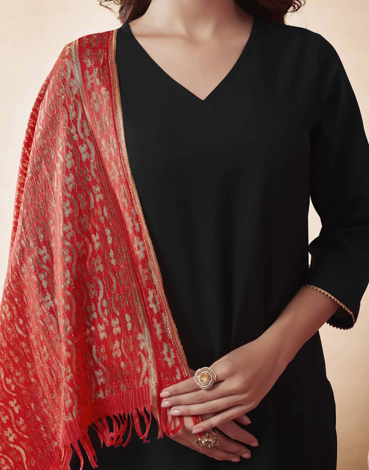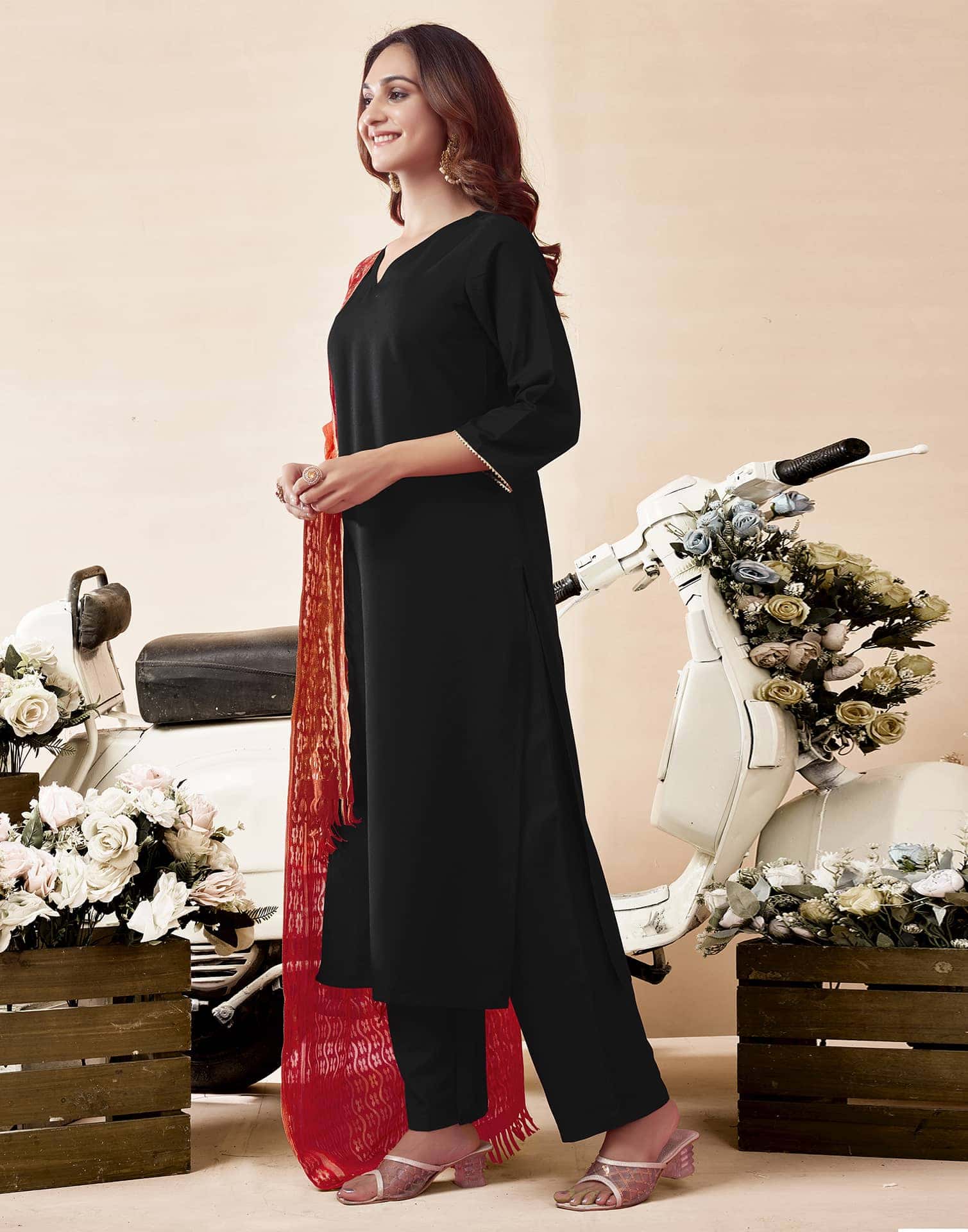 Crafted in Rayon Blend with exquisite Plain, this Black kurta set is an essential for your ethnic wardrobe. The kurta comes with a V Neck, paired with Pant and dupatta for a complete look. Ideal for Office Wear, it ensures ease of movement and high-quality fabric. A perfect choice for festive wear and traditional outfit lovers. Easy to Maintain, Matching Bottoms, Soft & Breathable Fabric.