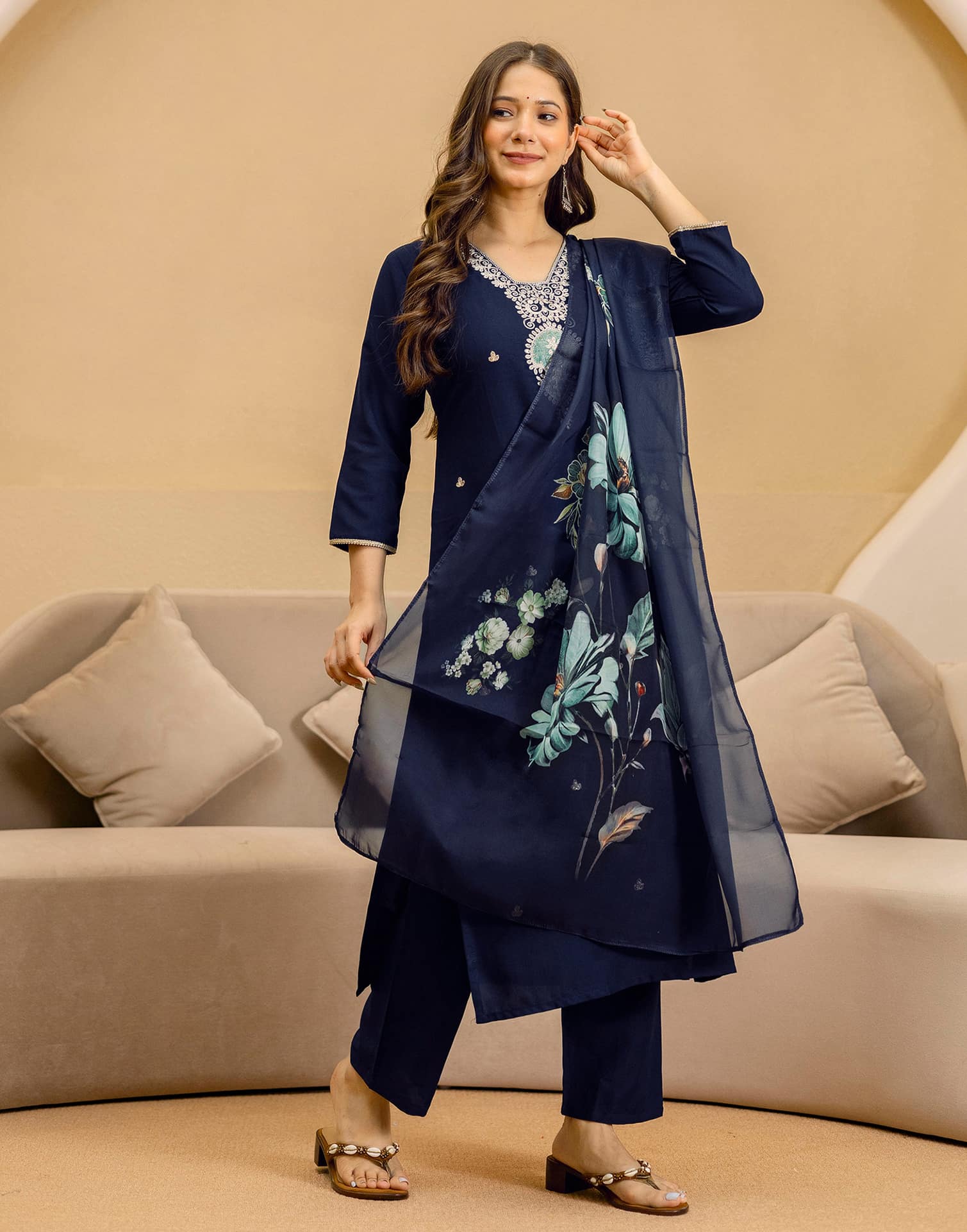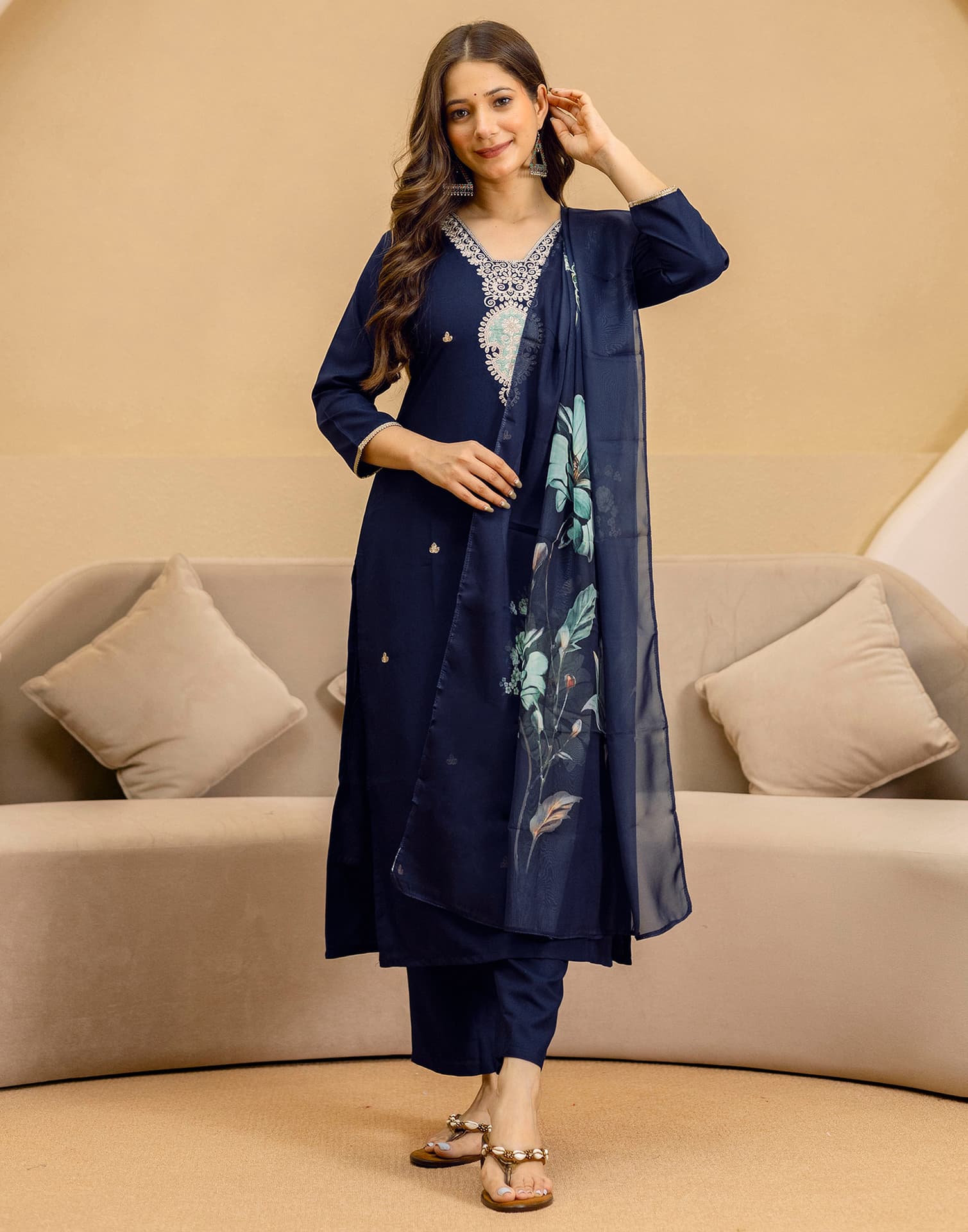Refresh your ethnic collection with this Rayon kurta set in Blue. Highlighted by Embroidery And Sequins Work and styled with a V-Neck, the kurta blends comfort with tradition. Teamed with Pant and dupatta, this outfit is perfect for Festive Wear. It guarantees all-day comfort, soft & breathable fabric, and the ease of an everyday ethnic wear. Matching Bottoms, Indian Wear, Family Function Wear.