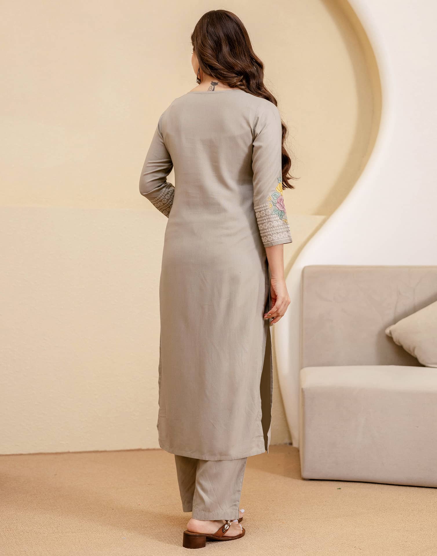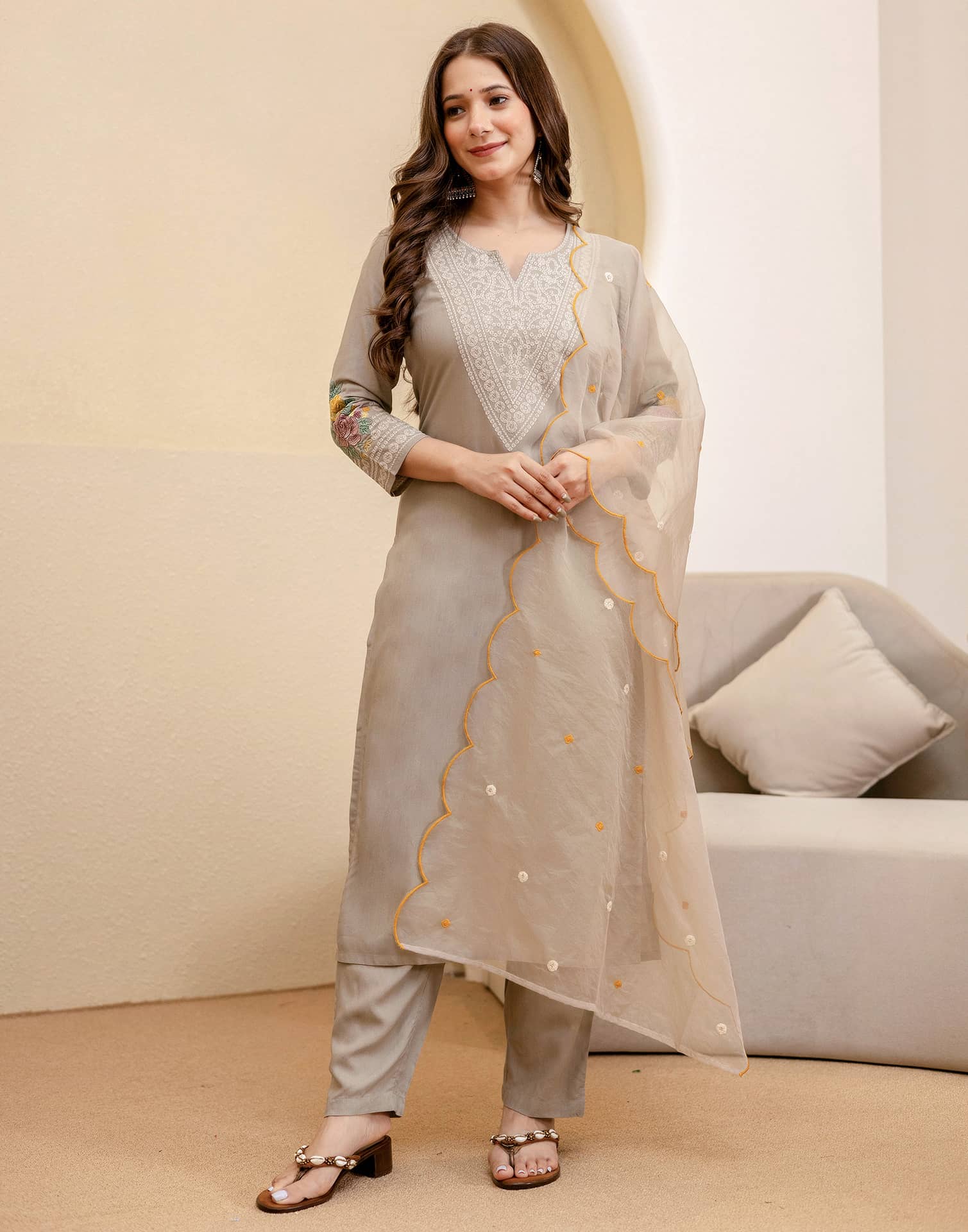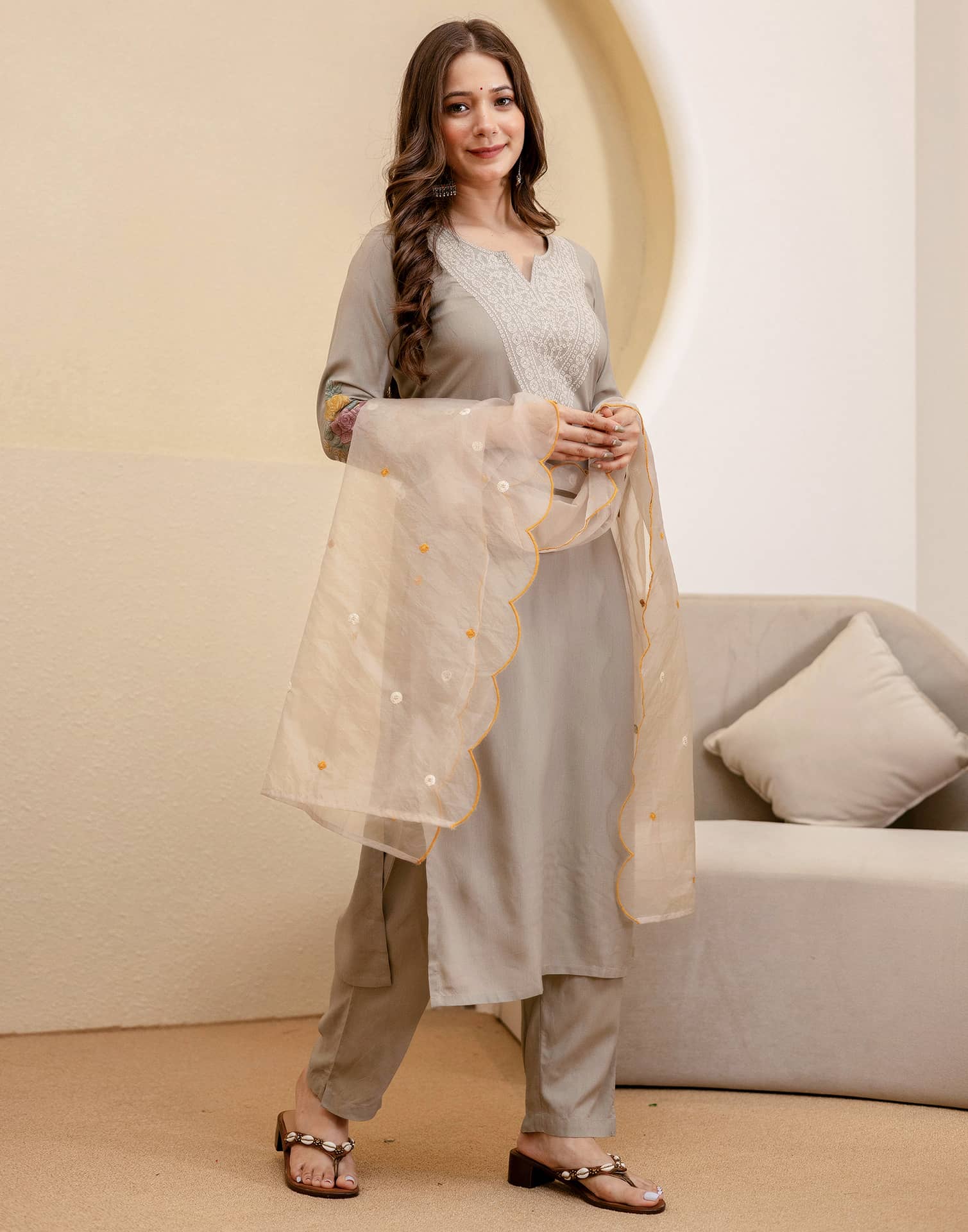 Elevate your ethnic wardrobe with this Rayon kurta set in Soft Grey. Designed with Embroidery And Sequins Work and a V Neck, the kurta offers a comfortable fit and stylish finish. The set includes Pant With Pocket and a dupatta, completing the look. Suitable for Festive Wear, it combines soft & breathable fabric, comfortable wear, and modern design. Complete Kurta Set, Everyday Wear, Festive Wear.
