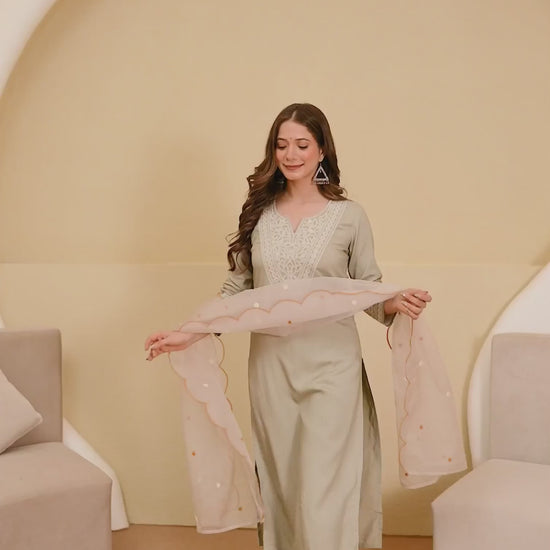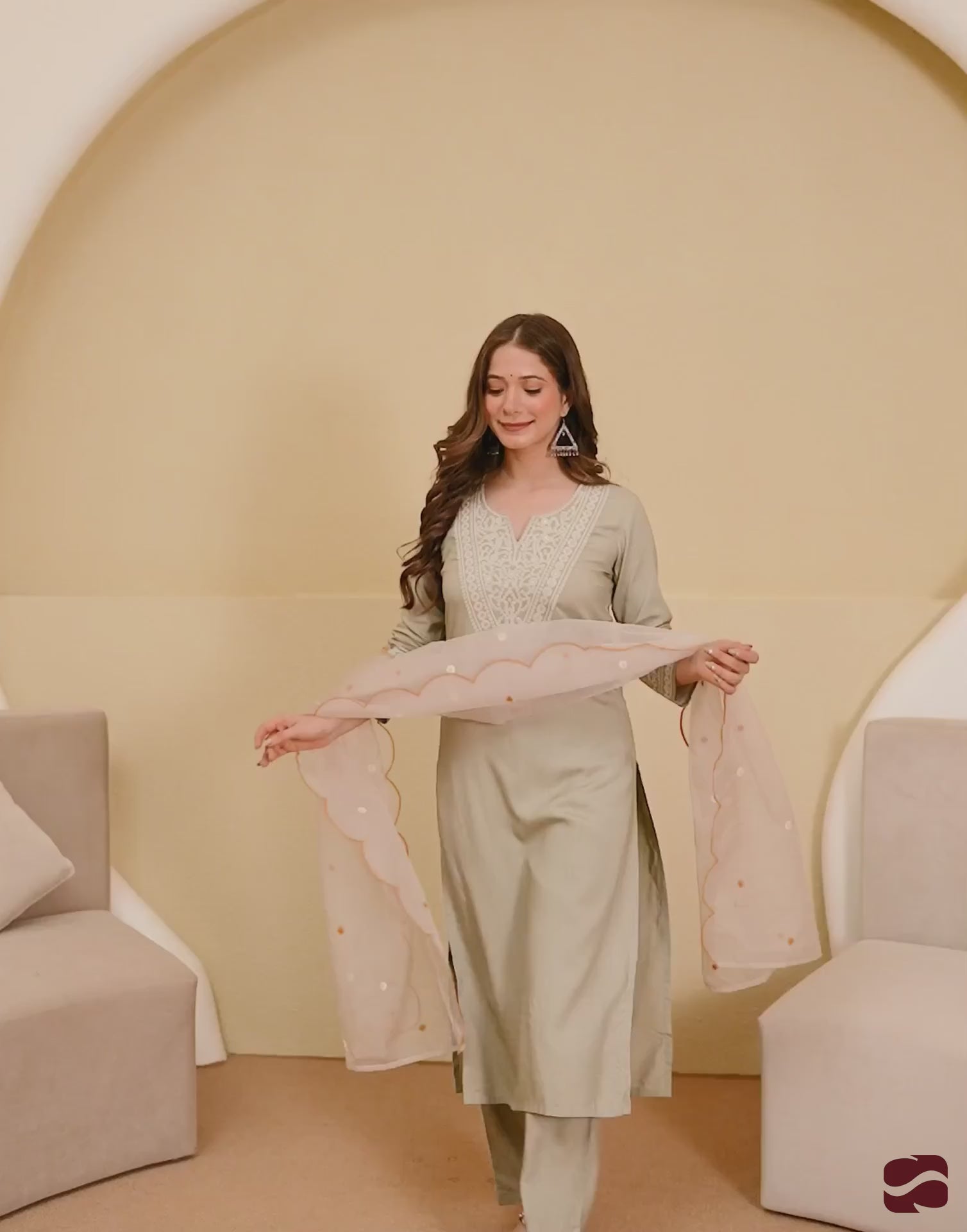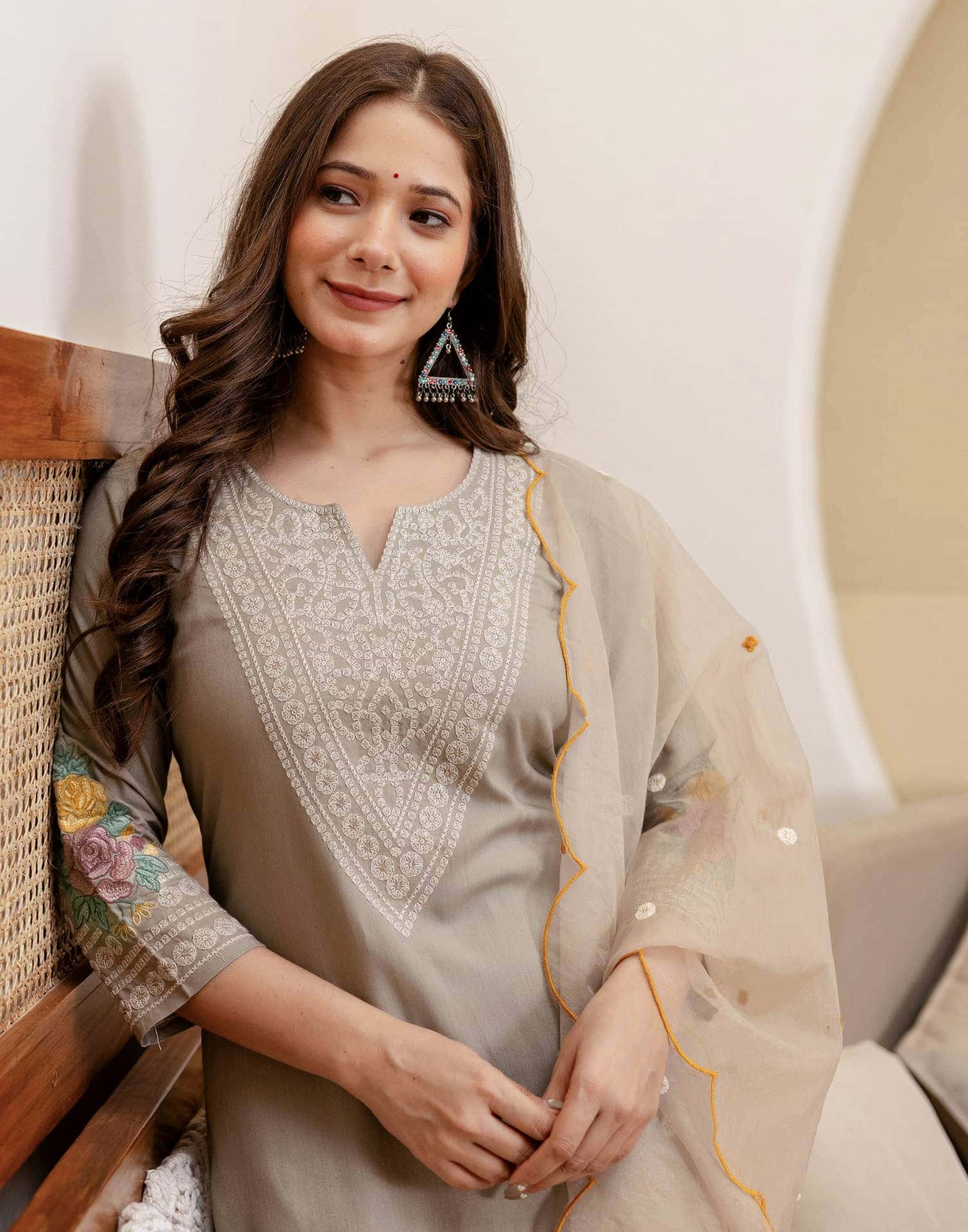Elevate your ethnic wardrobe with this Rayon kurta set in Soft Grey. Designed with Embroidery And Sequins Work and a V Neck, the kurta offers a comfortable fit and stylish finish. The set includes Pant With Pocket and a dupatta, completing the look. Suitable for Festive Wear, it combines soft & breathable fabric, comfortable wear, and modern design. Complete Kurta Set, Everyday Wear, Festive Wear.