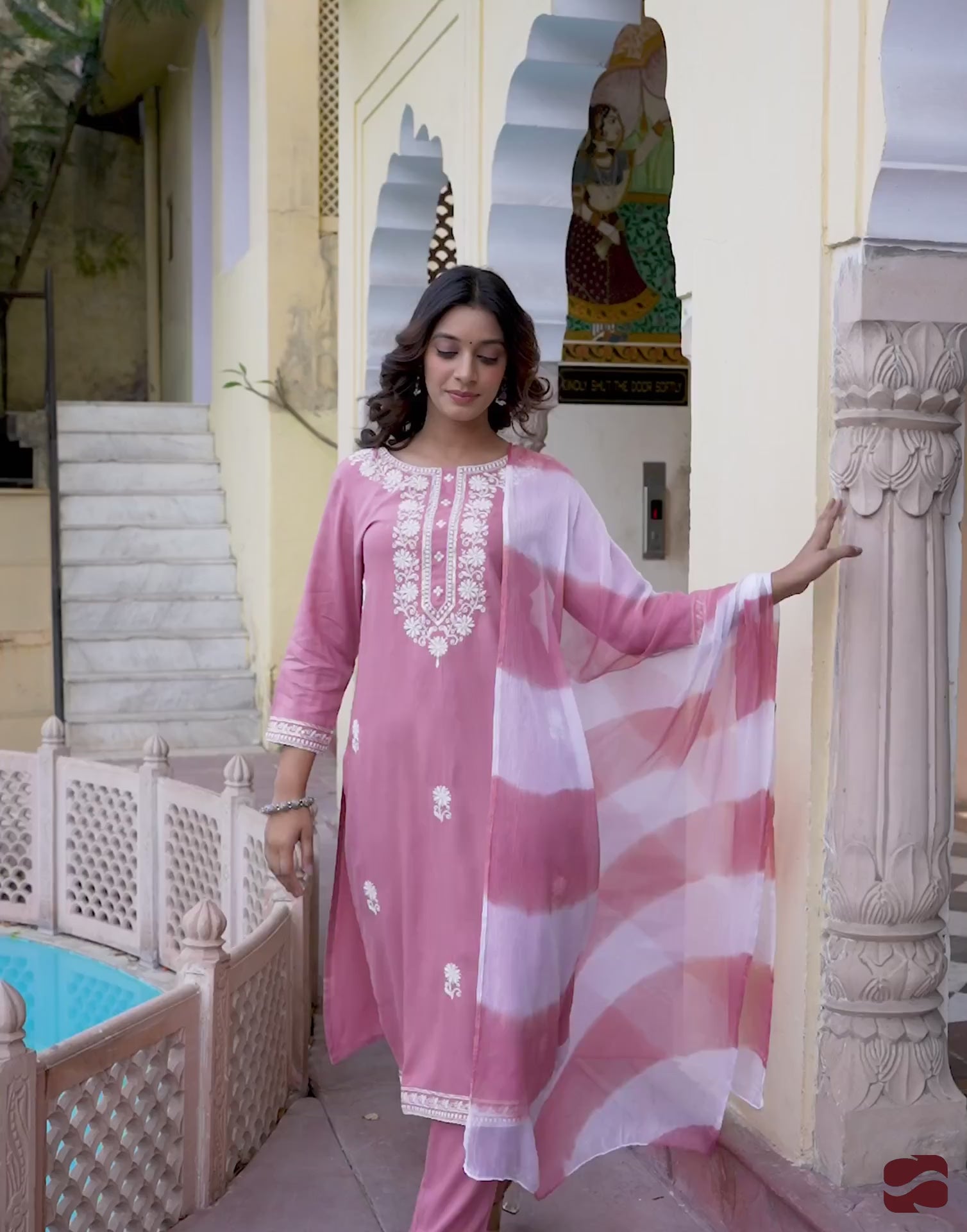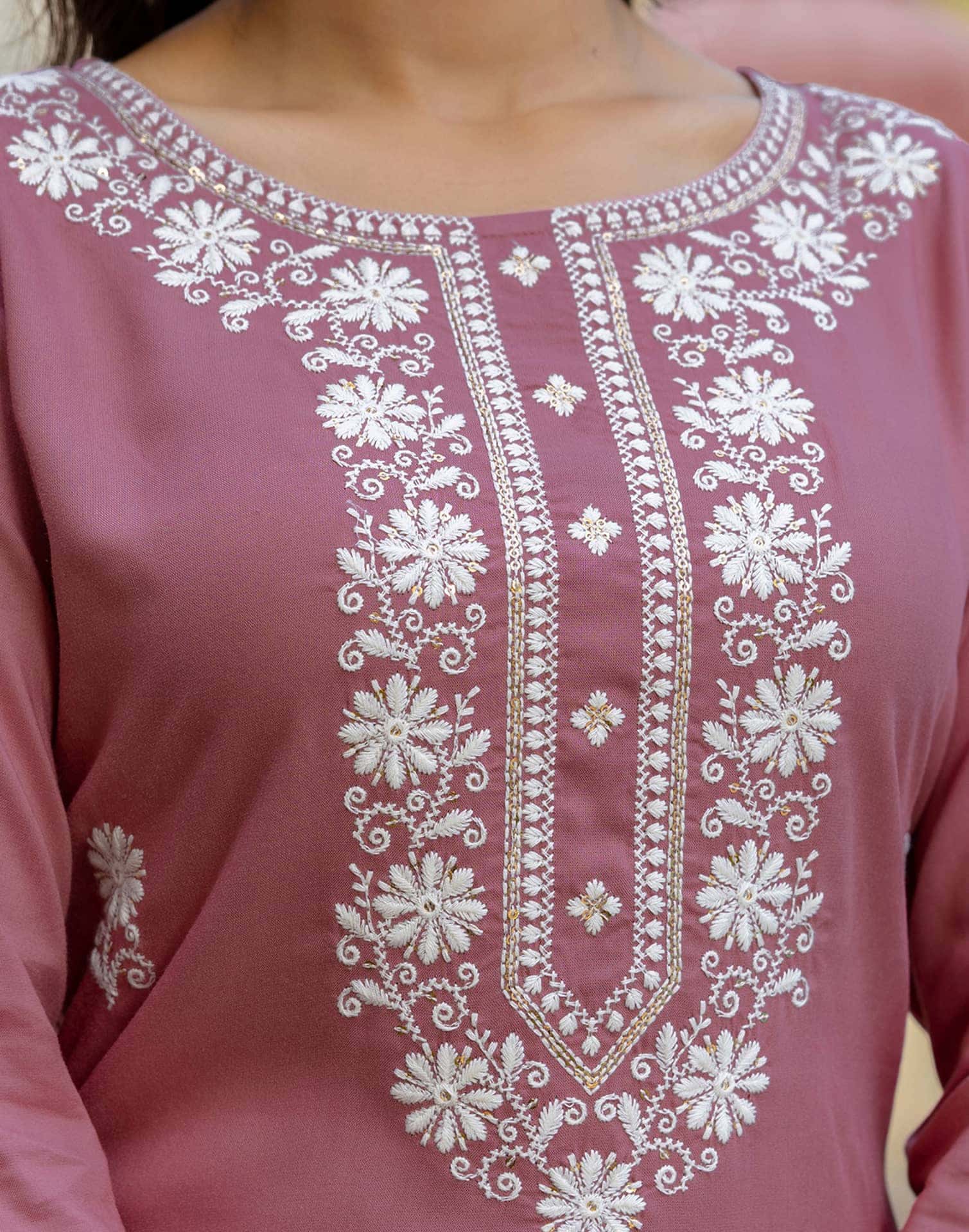 Crafted in Rayon with exquisite Embroidery And Sequins Work, this Dusty Pink kurta set is an essential for your ethnic wardrobe. The kurta comes with a Round Neck, paired with Pant and dupatta for a complete look. Ideal for Festive Wear, it ensures comfortable wear and high-quality fabric. A perfect choice for festive wear and traditional outfit lovers. Elegant Dupatta, Matching Bottoms, Ethnic Wear for Women.