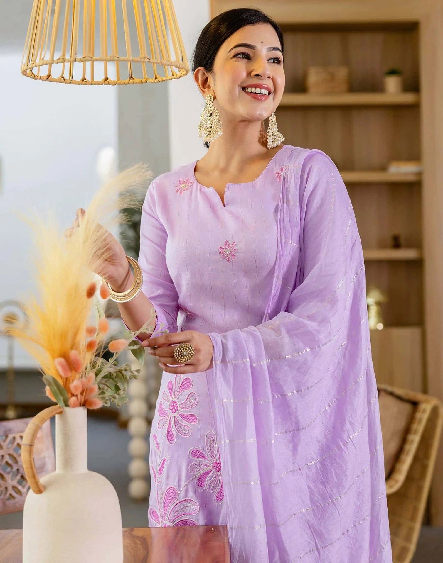 Rayon Embroidery Work and Woven Stripe Straight Kurta with Pant & Dupatta