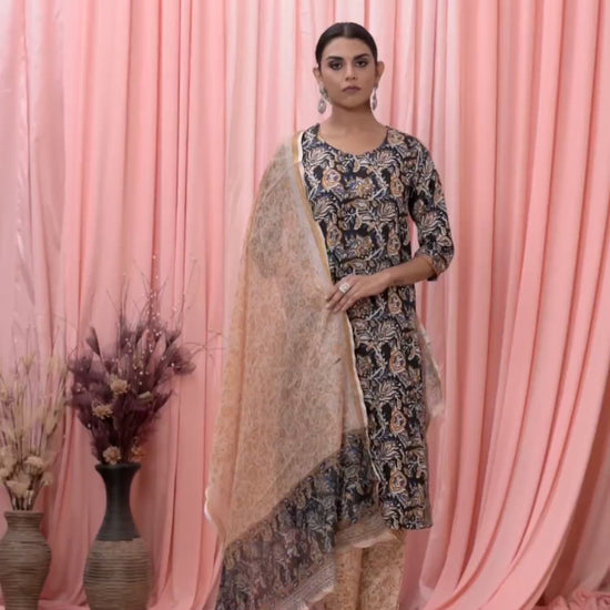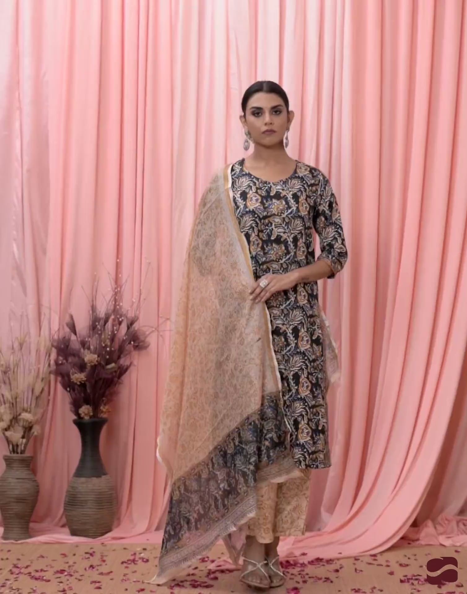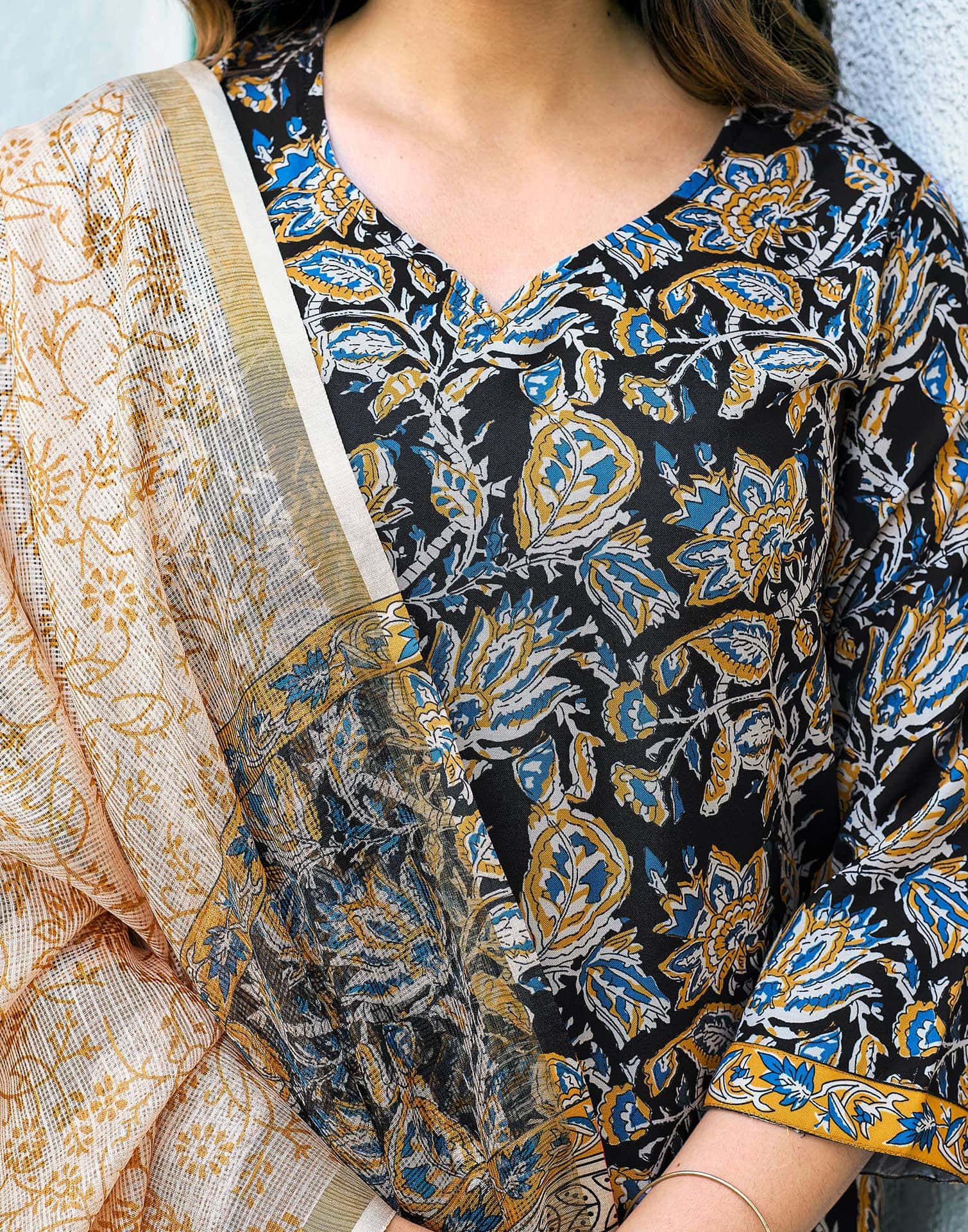 Refresh your ethnic collection with this Rayon Blend kurta set in Black. Highlighted by Floral Printed and styled with a V Neck, the kurta blends comfort with tradition. Teamed with Pant With Pocket and dupatta, this outfit is perfect for Casual Wear. It guarantees comfortable wear, lightweight fabric, and the ease of an everyday ethnic wear. Traditional Outfit, Graceful Silhouette, Semi-formal Wear.