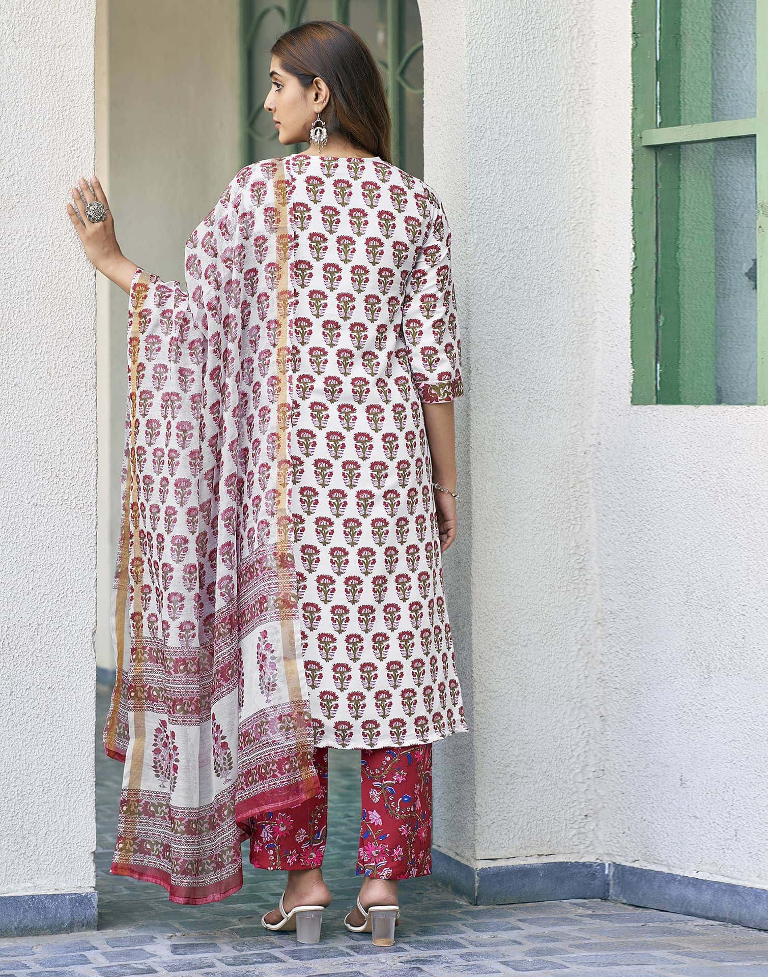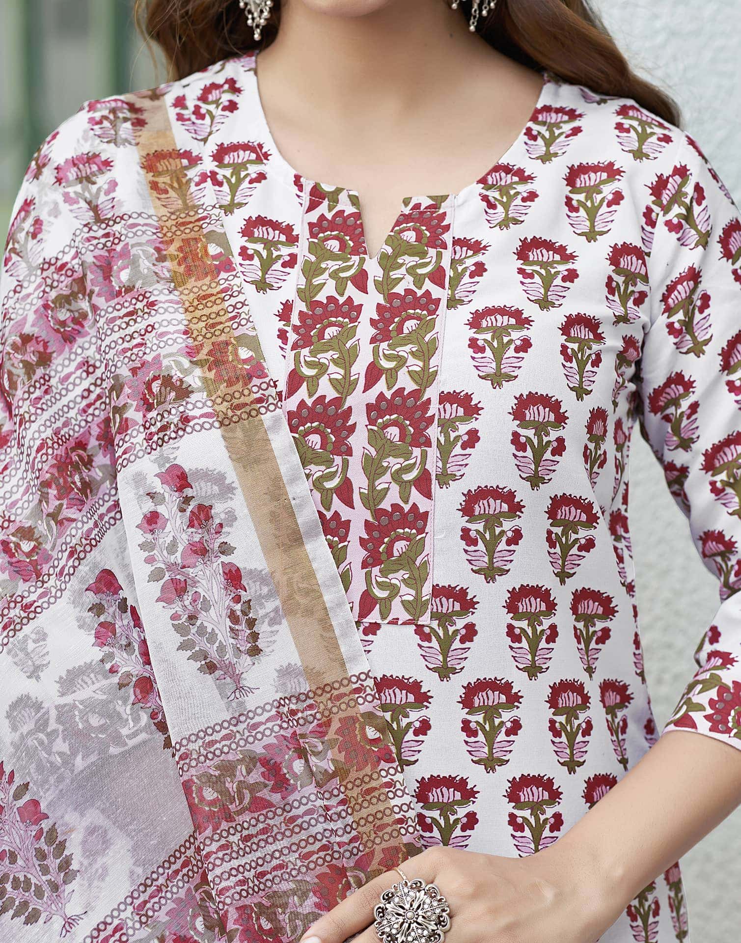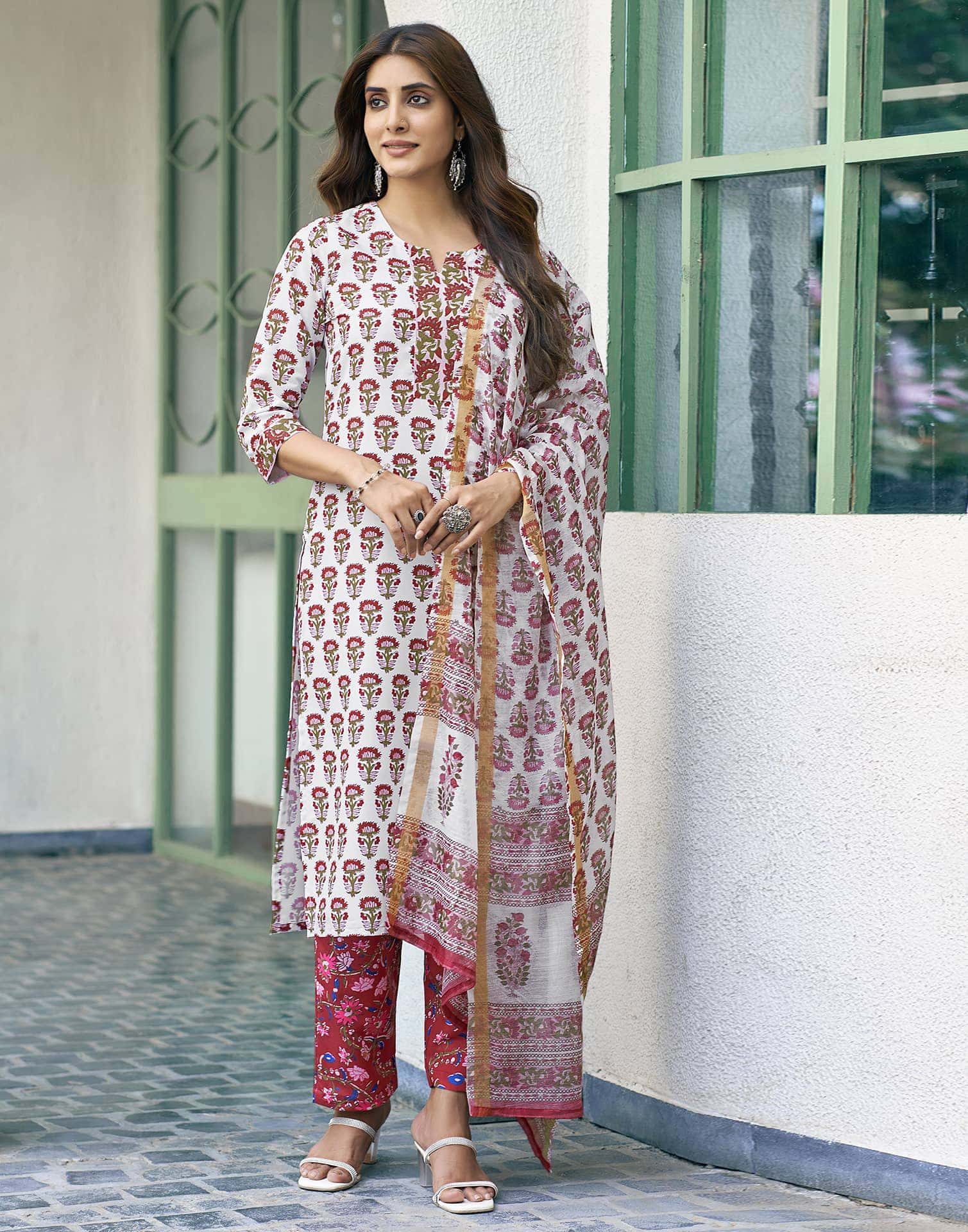 This White Rayon Blend kurta set with Floral Printed is crafted for women who love Indian wear with a modern twist. The kurta’s V Neck and graceful cut enhance its style, while Pant With Pocket and dupatta complete the ensemble. Designed for Casual Wear, it promises high-quality fabric, all-day comfort, and lasting appeal. Easy to Maintain, Soft & Breathable Fabric, Complete Kurta Set.