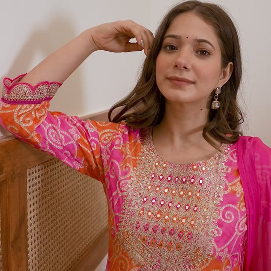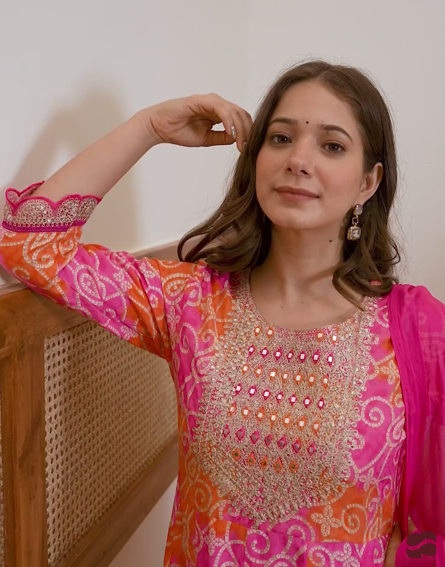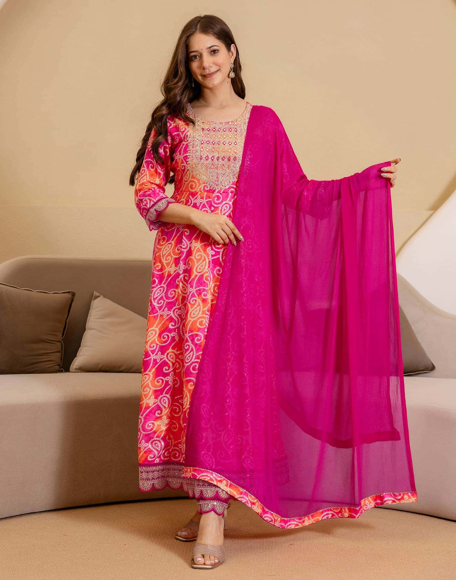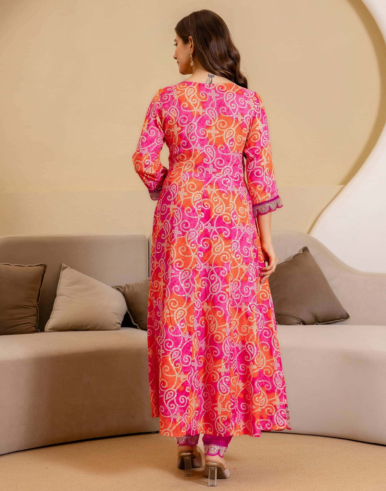 Crafted in Rayon with exquisite Bandhani Printed, this Pink kurta set is an essential for your ethnic wardrobe. The kurta comes with a Round Neck, paired with Pant With Pocket and dupatta for a complete look. Ideal for Casual Wear, it ensures ease of movement and premium fabric. A perfect choice for festive wear and traditional outfit lovers. Breathable Kurta, Soft & Breathable Fabric, Comfortable Wear.