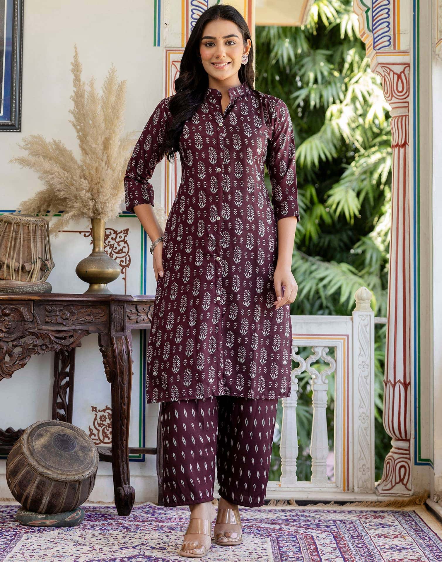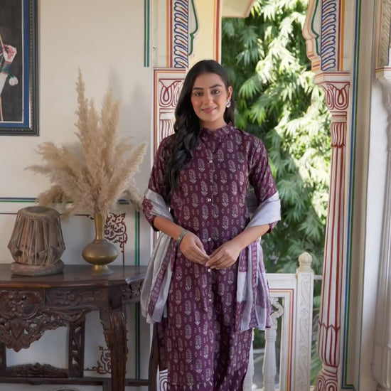 Crafted in Rayon with exquisite Printed, this Wine kurta set is an essential for your ethnic wardrobe. The kurta comes with a Mandarin Collar, paired with Pant With Pocket and dupatta for a complete look. Ideal for Casual Wear, it ensures ease of movement and premium fabric. A perfect choice for festive wear and traditional outfit lovers. Kurta with Pant & Dupatta, Lightweight Fabric, High-quality Fabric.