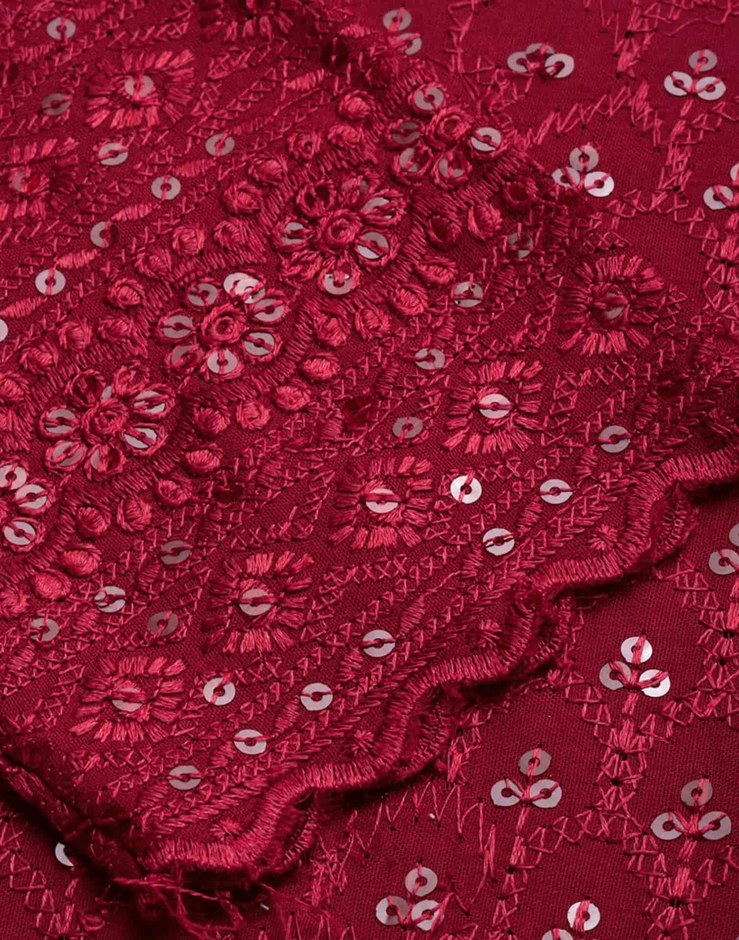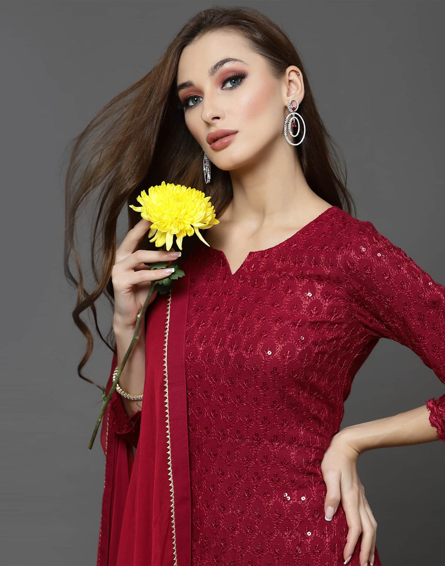 Experience the beauty of tradition with this Maroon Rayon kurta set. Adorned with Sequence Embroidery and styled with a V-Neck, the kurta exudes sophistication. Complemented with Pant and an elegant dupatta, this complete outfit is ideal for Festive Wear. Crafted in India with lightweight fabric, it ensures ease of movement and effortless elegance. Casual Wear, Lightweight Fabric, Complete Kurta Set.