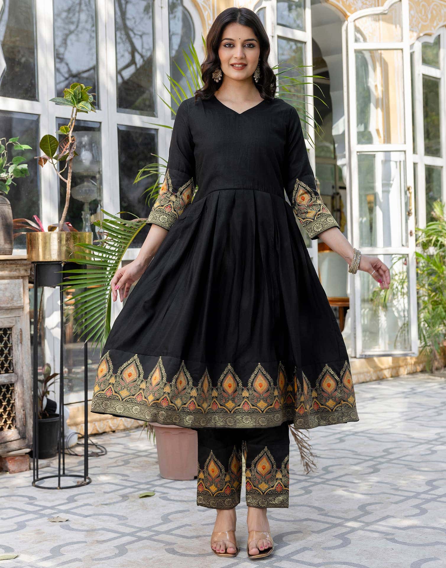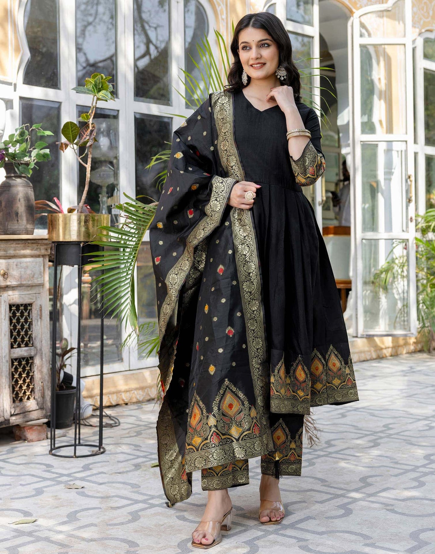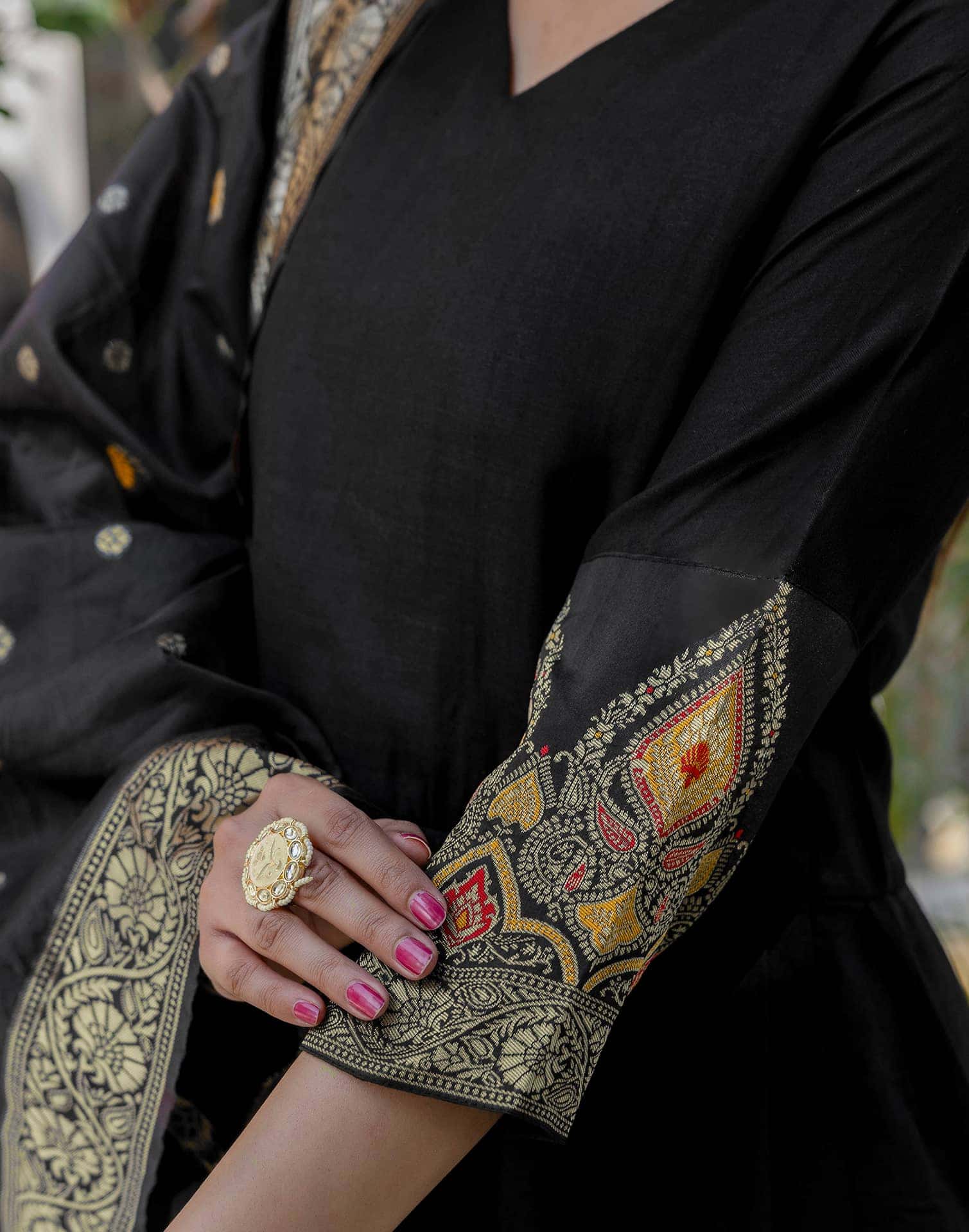 Step into sophistication with this Black Rayon kurta set adorned with Weaving. The kurta features a V Neck for a refined look, paired with Pant and dupatta. Perfect for Semi-formal Wear, it delivers all-day comfort, premium fabric, and effortless style. Ease of Movement, All-day Comfort, Easy to Maintain.