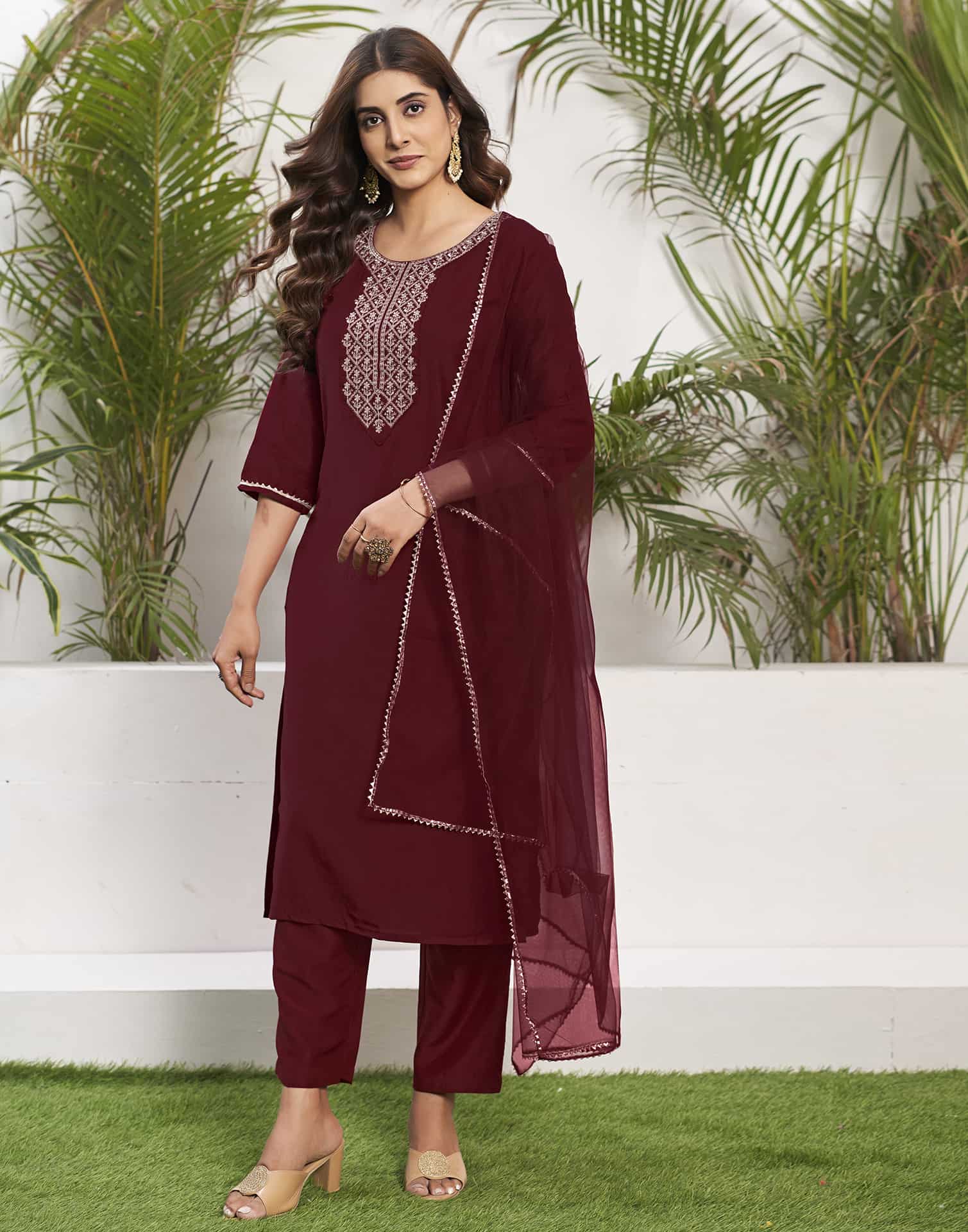 Crafted in Silk Blend with exquisite Embroidered, this Red kurta set is an essential for your ethnic wardrobe. The kurta comes with a Round Neck, paired with Pant and dupatta for a complete look. Ideal for Festive Wear, it ensures ease of movement and high-quality fabric. A perfect choice for festive wear and traditional outfit lovers. All-day Comfort, Festive Wear, Breathable Kurta.