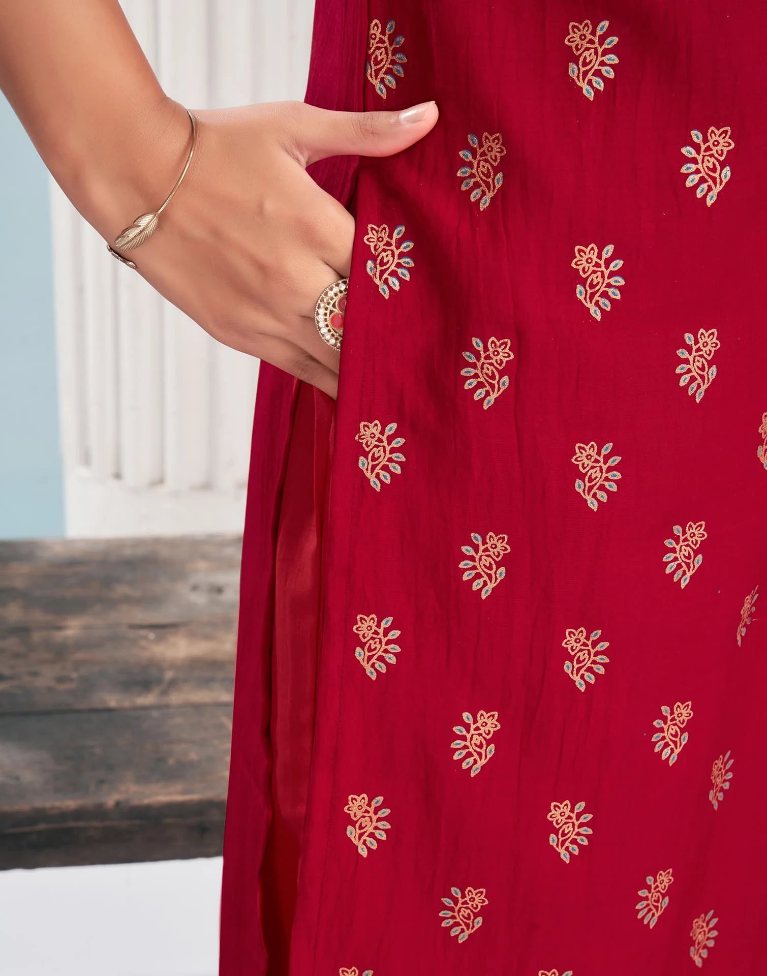 Silk Blend Dyed, Foil Print and Lace Straight Kurta with Pant & Dupatta