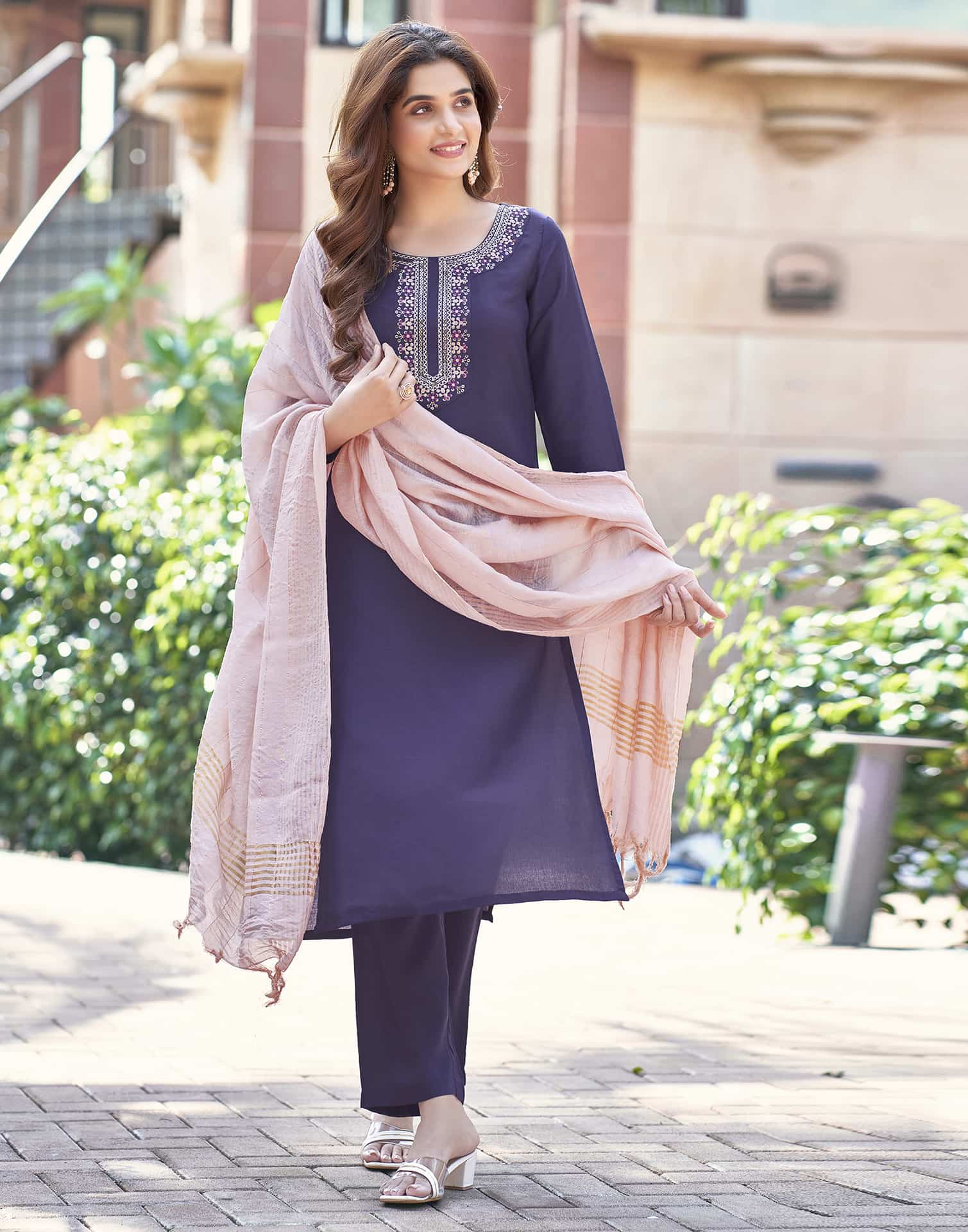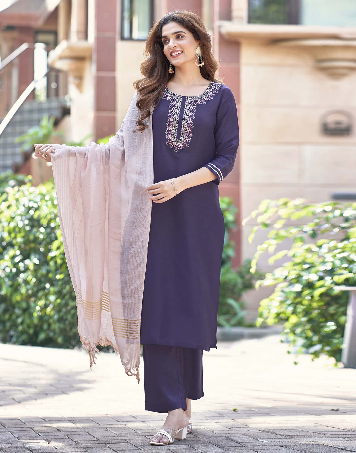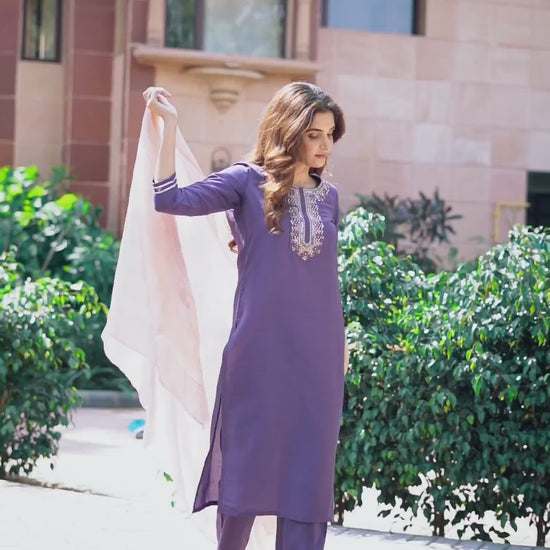 Elevate your ethnic wardrobe with this Silk Blend kurta set in Purple. Designed with Solid and a Round Neck, the kurta offers a comfortable fit and stylish finish. The set includes Pant and a dupatta, completing the look. Suitable for Festive Wear, it combines soft & breathable fabric, comfortable wear, and modern design. Soft & Breathable Fabric, Graceful Silhouette, Festive Wear.