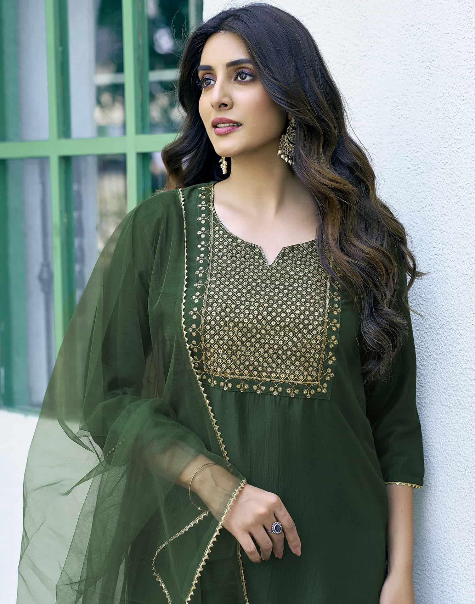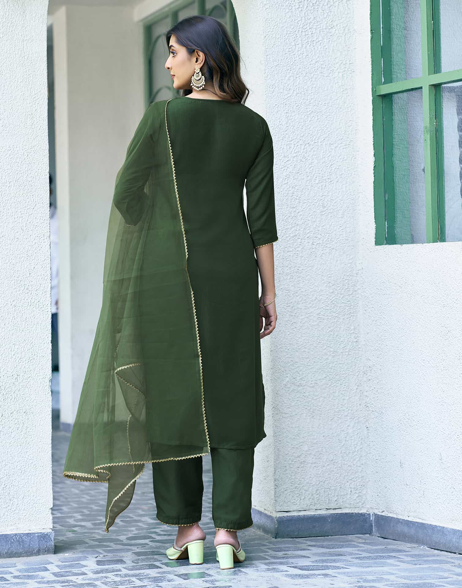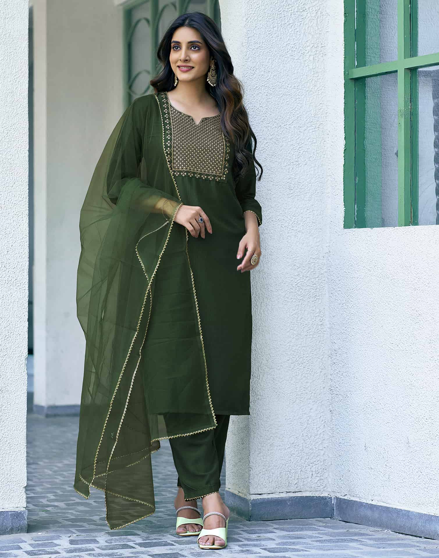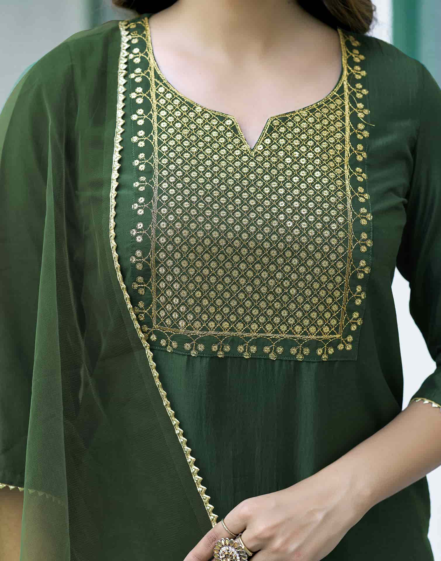 Crafted in Silk Blend with exquisite Solid, this Green kurta set is an essential for your ethnic wardrobe. The kurta comes with a V-Neck, paired with Pant and dupatta for a complete look. Ideal for Festive Wear, it ensures comfortable wear and premium fabric. A perfect choice for festive wear and traditional outfit lovers. Easy to Maintain, Kurta with Pant & Dupatta, Graceful Silhouette.