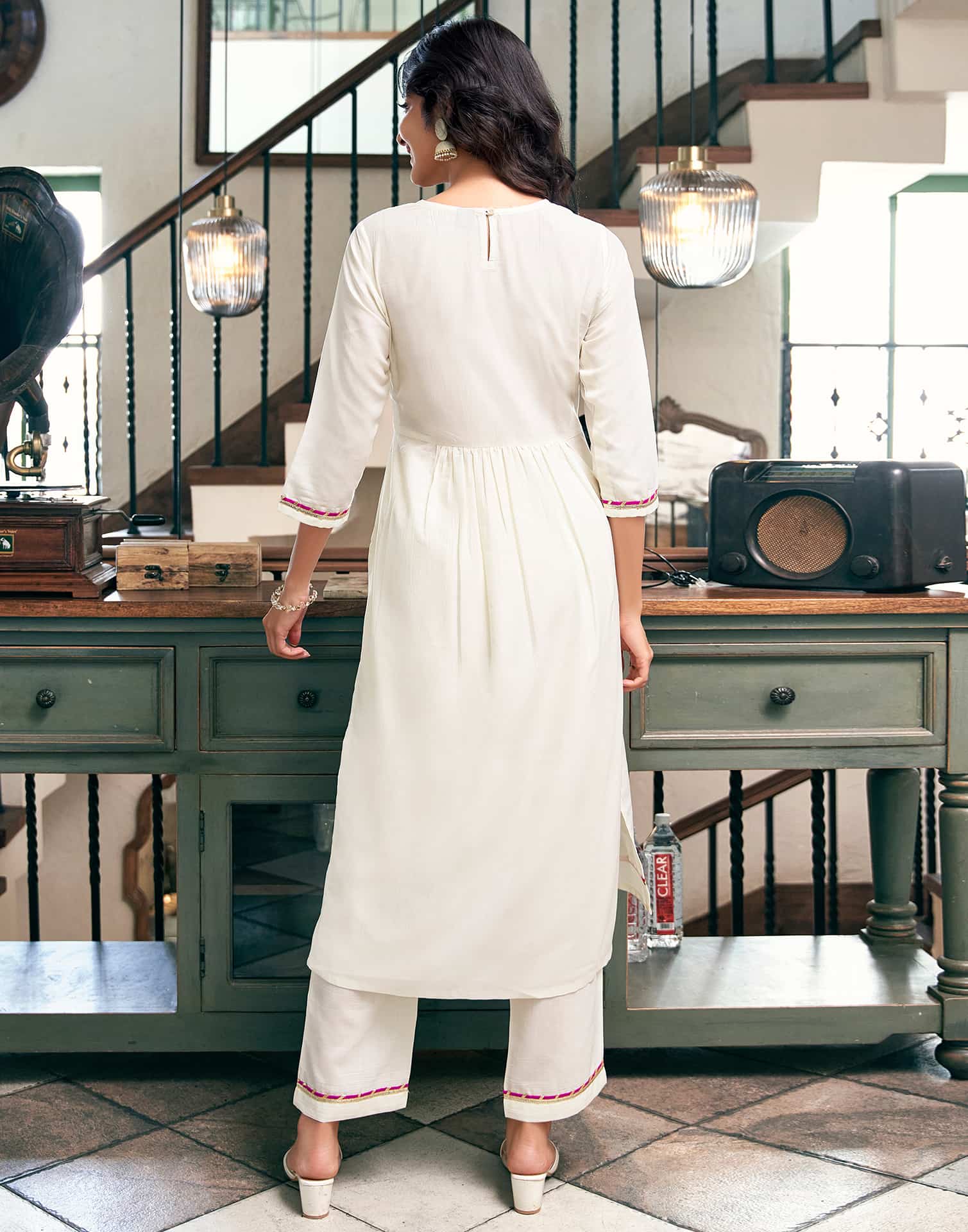 Step into sophistication with this Beige Silk Blend kurta set adorned with Embroidered. The kurta features a Round Neck for a refined look, paired with Palazzo and dupatta. Perfect for Festive Wear, it delivers all-day comfort, lightweight fabric, and effortless style. Easy to Maintain, Breathable Kurta, Matching Bottoms.
