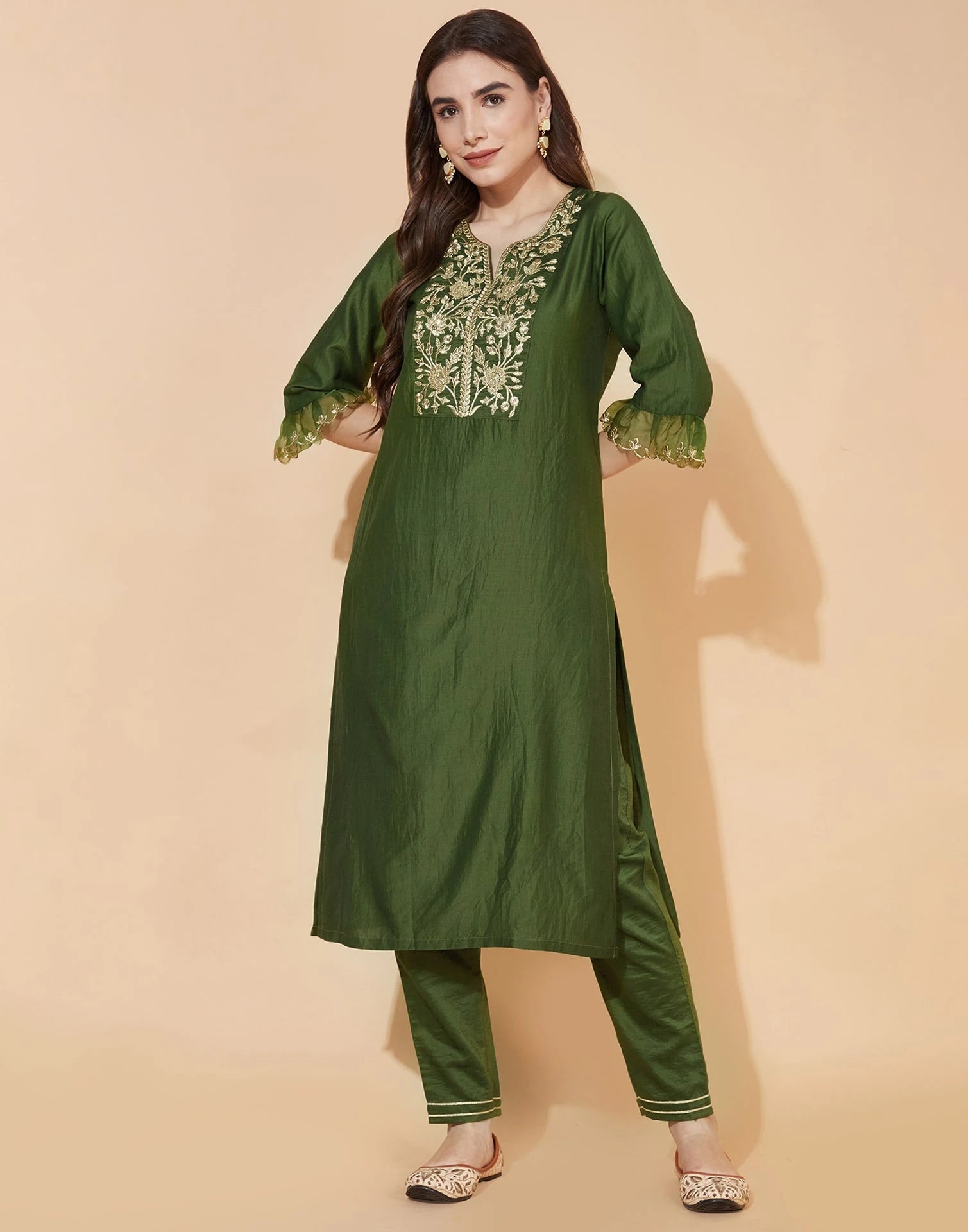 Silk Blend Embroidered Straight Kurta with Pant & Dupatta