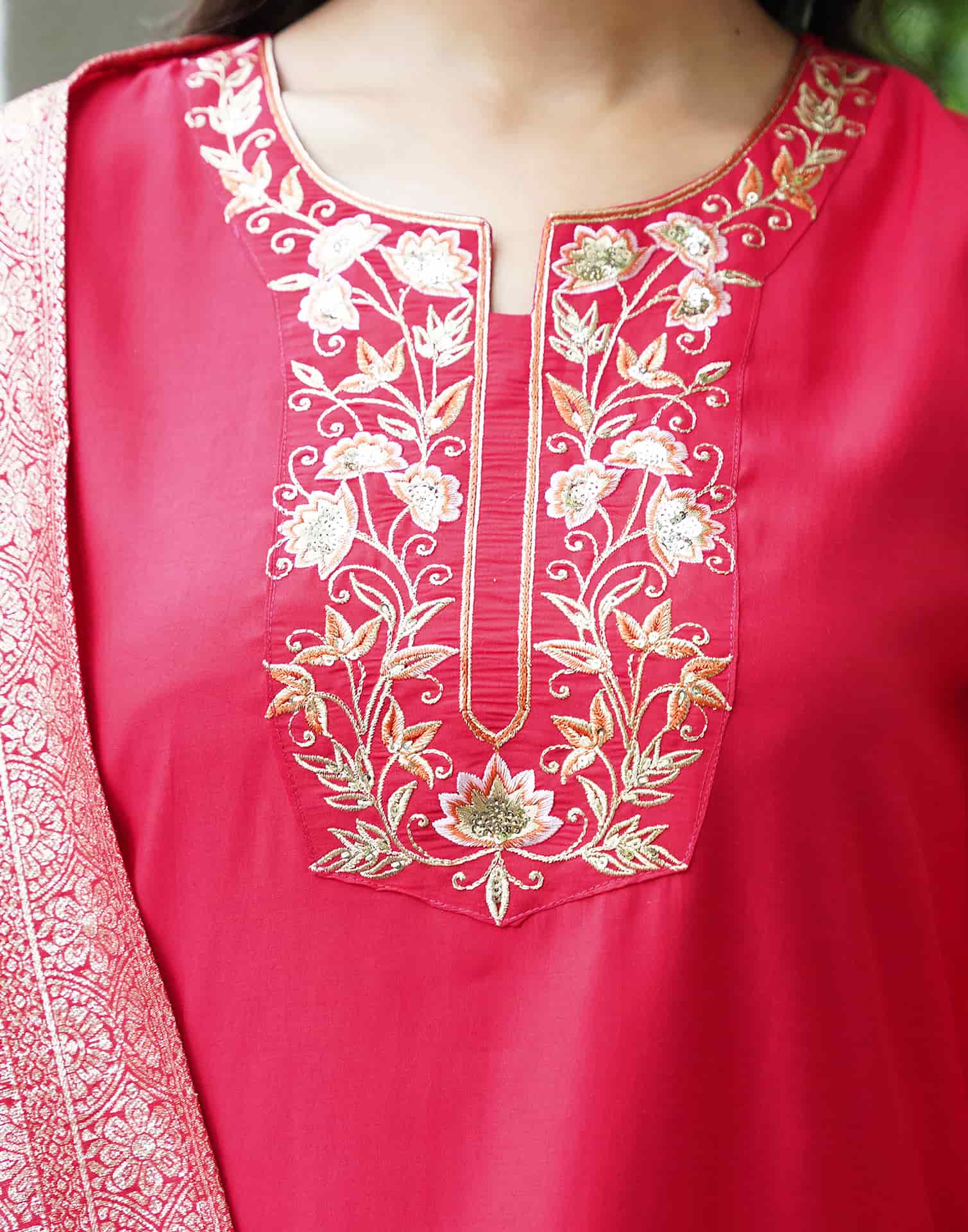 Refresh your ethnic collection with this Silk Blend kurta set in Pink. Highlighted by Embroidered and styled with a Sweetheart Neck, the kurta blends comfort with tradition. Teamed with Pant and dupatta, this outfit is perfect for Festive Wear. It guarantees ease of movement, lightweight fabric, and the ease of an everyday ethnic wear. Ease of Movement, Kurta with Pant & Dupatta, All-day Comfort.