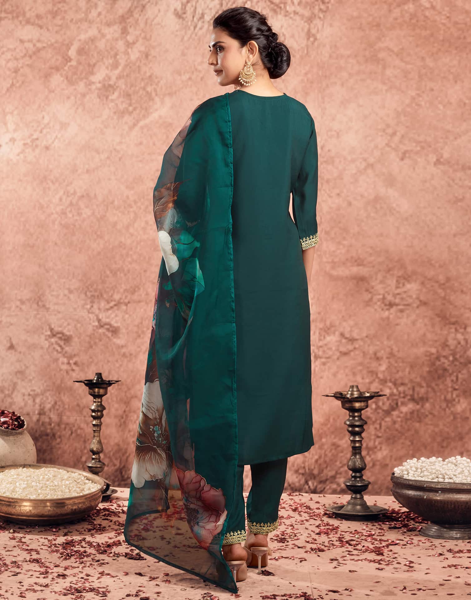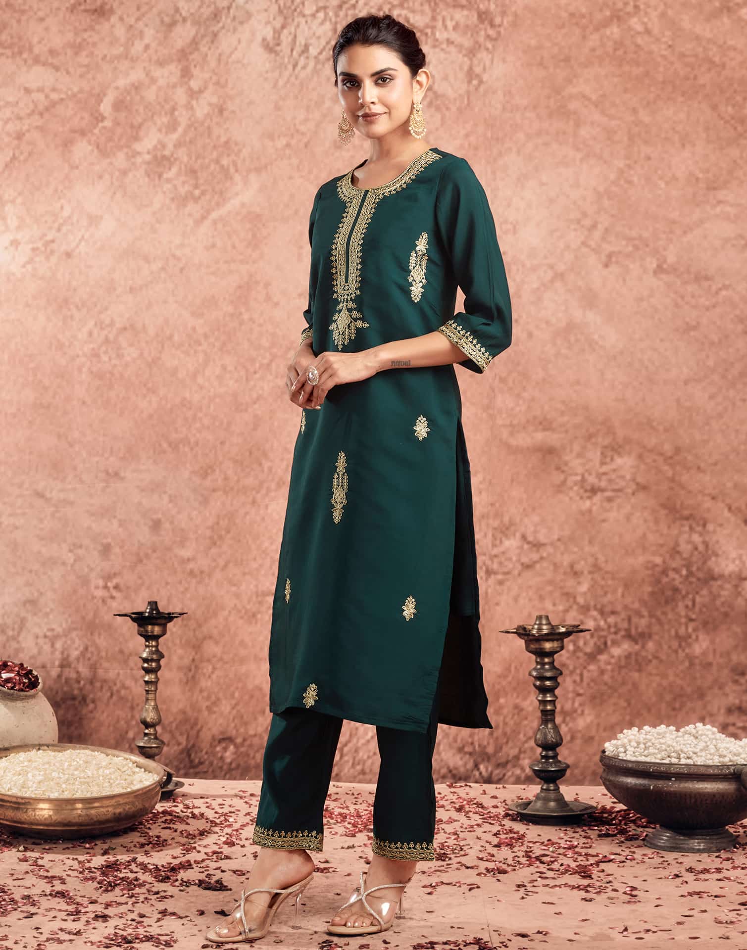 Bring elegance to every occasion with this Green Silk Blend kurta set. Featuring Embroidered on the kurta and a Round Neck, it radiates traditional charm. Styled with Pant and dupatta, this outfit is ideal for Festive Wear. Its high-quality fabric ensures breathability and ease of movement, while the dupatta adds a touch of grace. Matching Bottoms, Soft & Breathable Fabric, Lightweight Fabric.