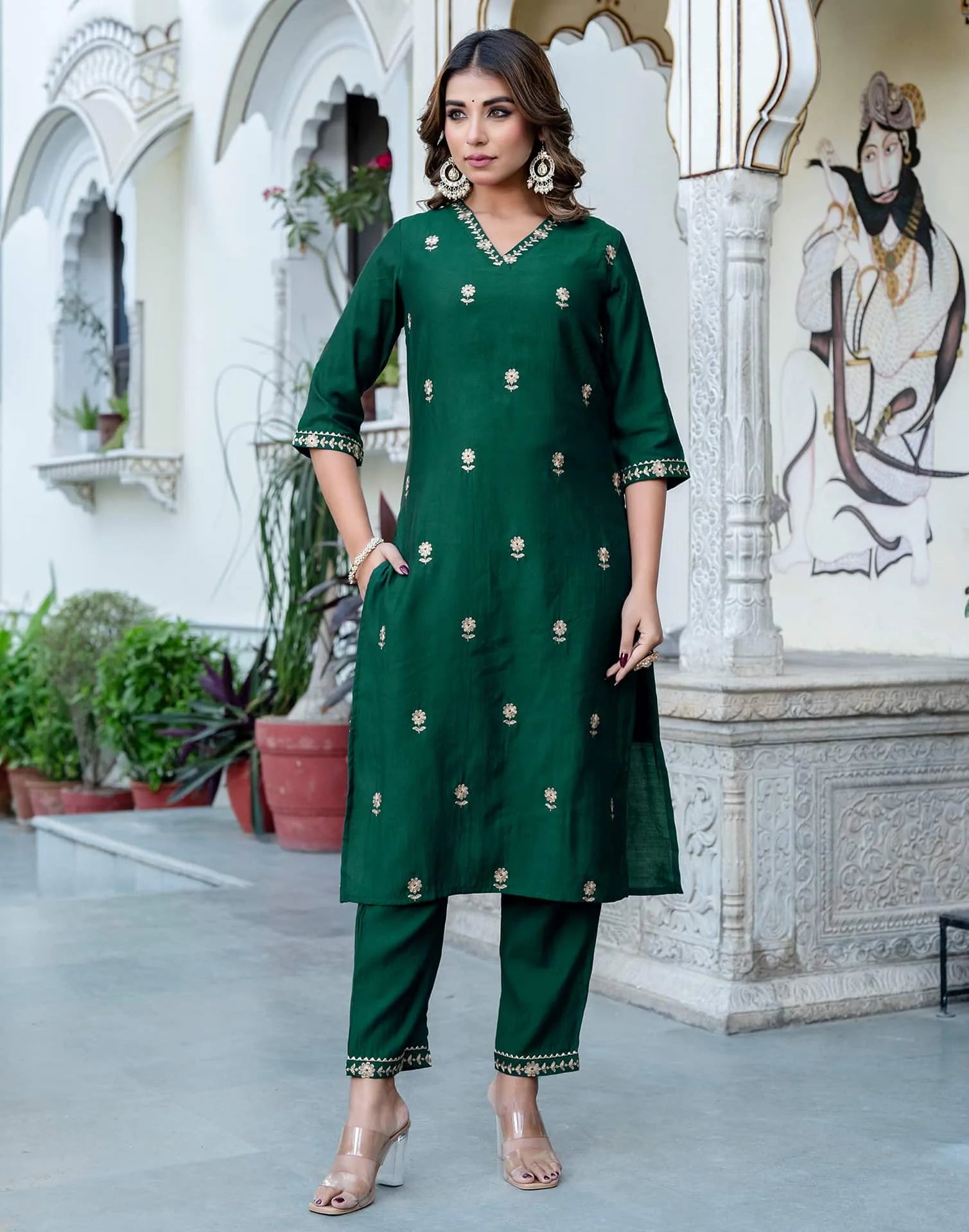 Silk Blend Embroidered Straight Kurta with Pant & Dupatta