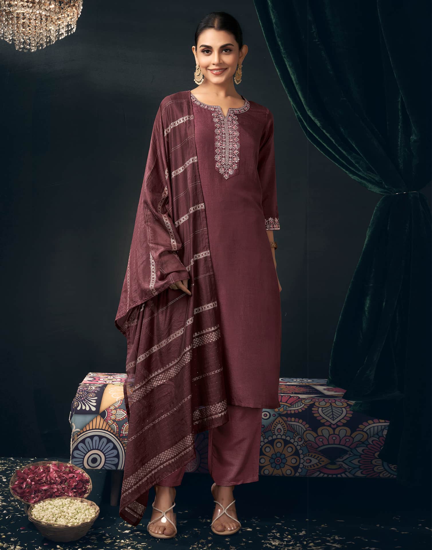Experience the beauty of tradition with this Brown Silk Blend kurta set. Adorned with Embroidered and styled with a V-Neck, the kurta exudes sophistication. Complemented with Pant and an elegant dupatta, this complete outfit is ideal for Festive Wear. Crafted in India with soft & breathable fabric, it ensures all-day comfort and effortless elegance. Comfortable Wear, Premium Fabric, Traditional Occasion Outfit.