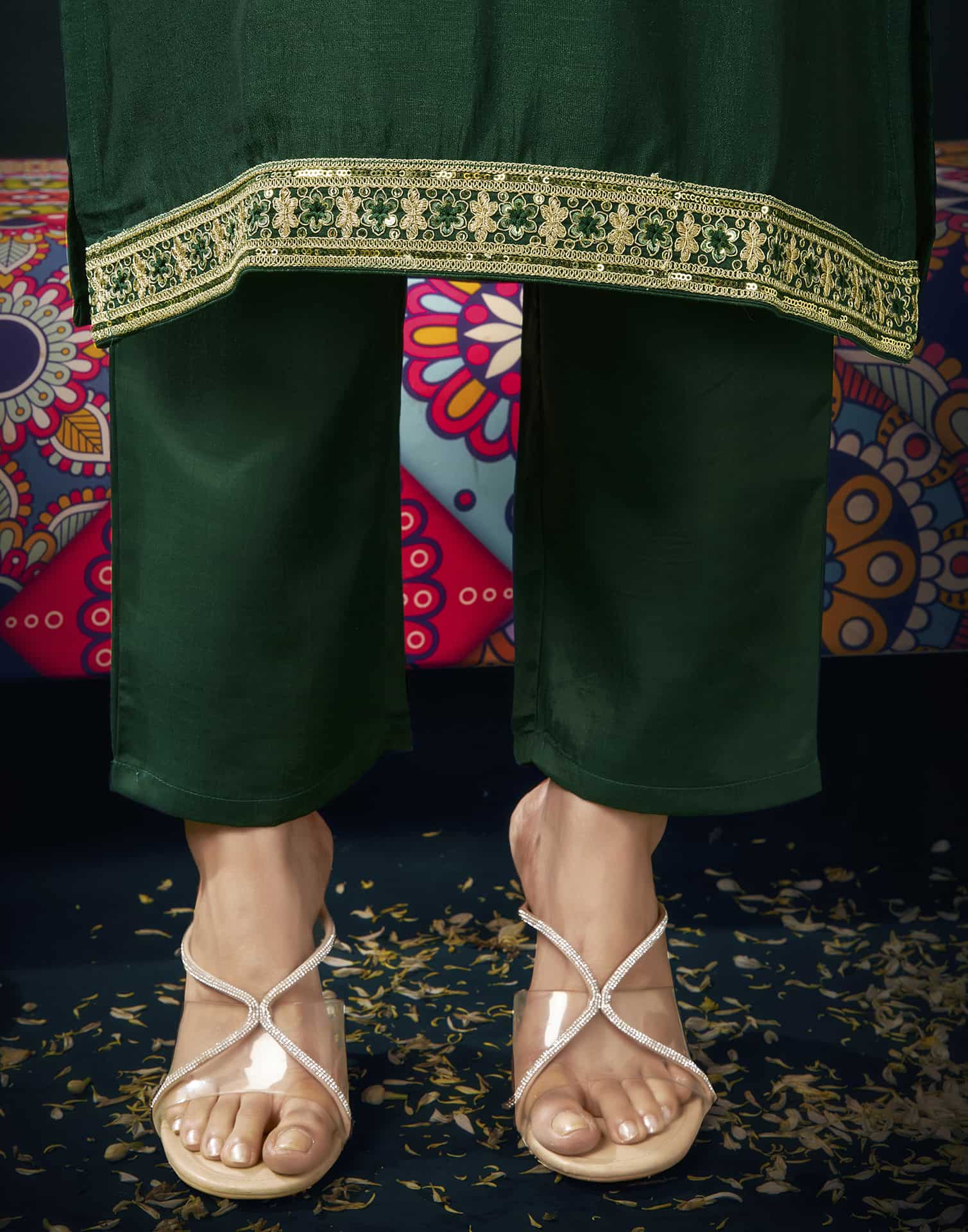 Bring elegance to every occasion with this Green Silk Blend kurta set. Featuring Embroidered on the kurta and a Round Neck, it radiates traditional charm. Styled with Pant and dupatta, this outfit is ideal for Festive Wear. Its premium fabric ensures breathability and all-day comfort, while the dupatta adds a touch of grace. Traditional Occasion Outfit, Elegant Dupatta, Easy to Maintain.