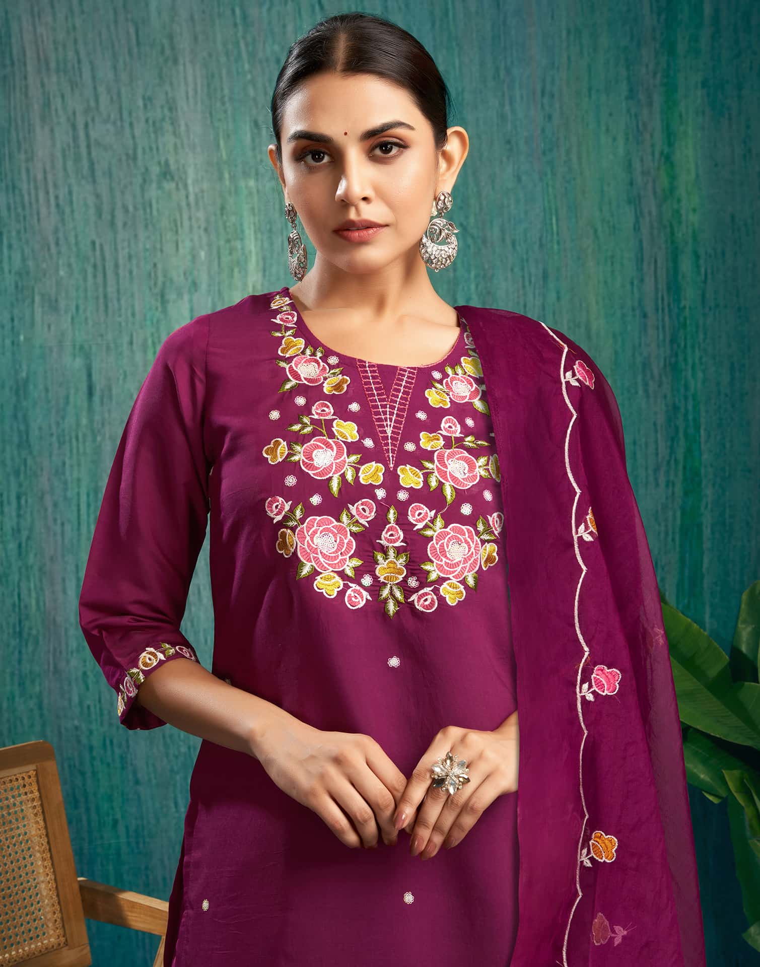 Silk Blend Embroidered Straight Kurta with Pant & Dupatta