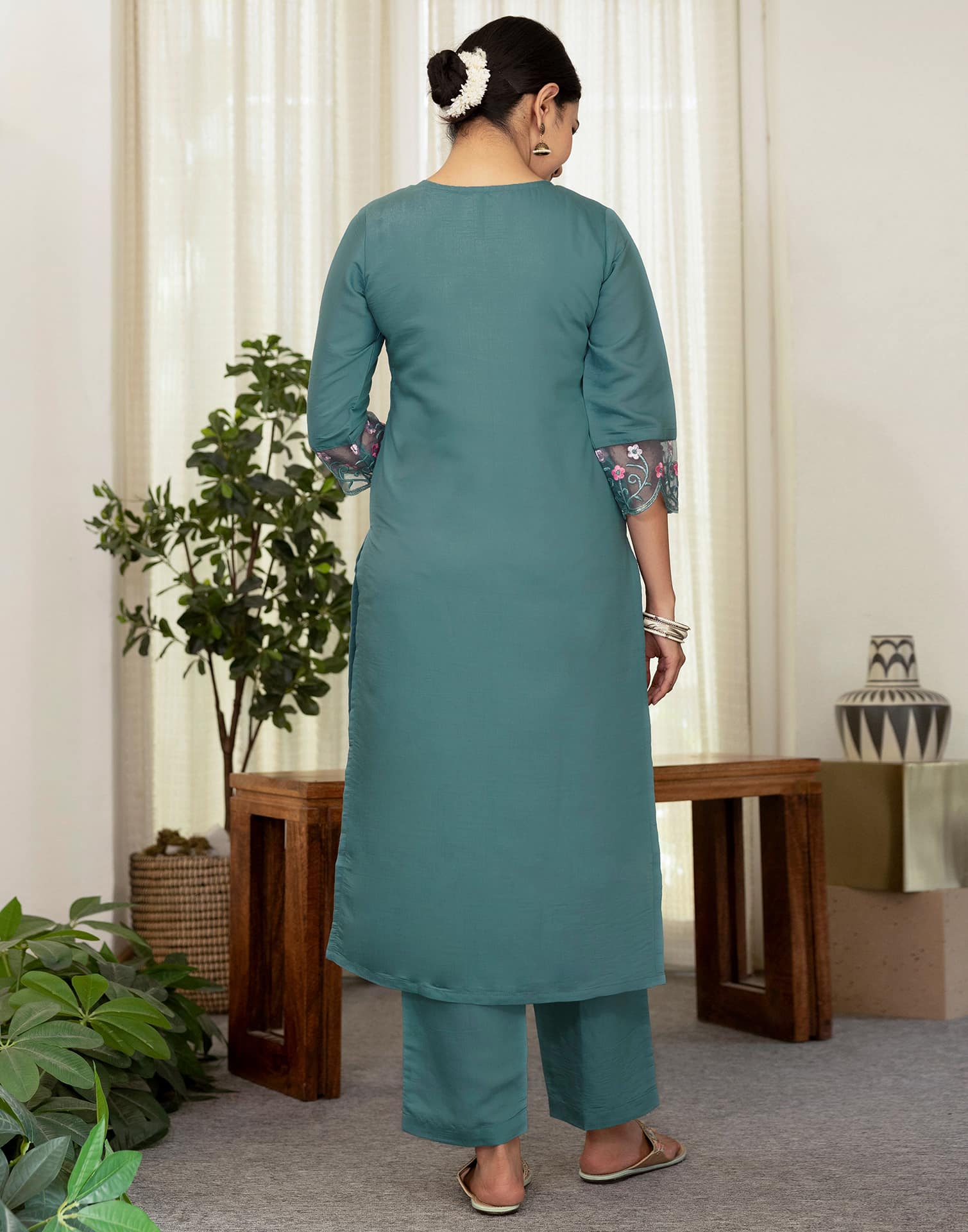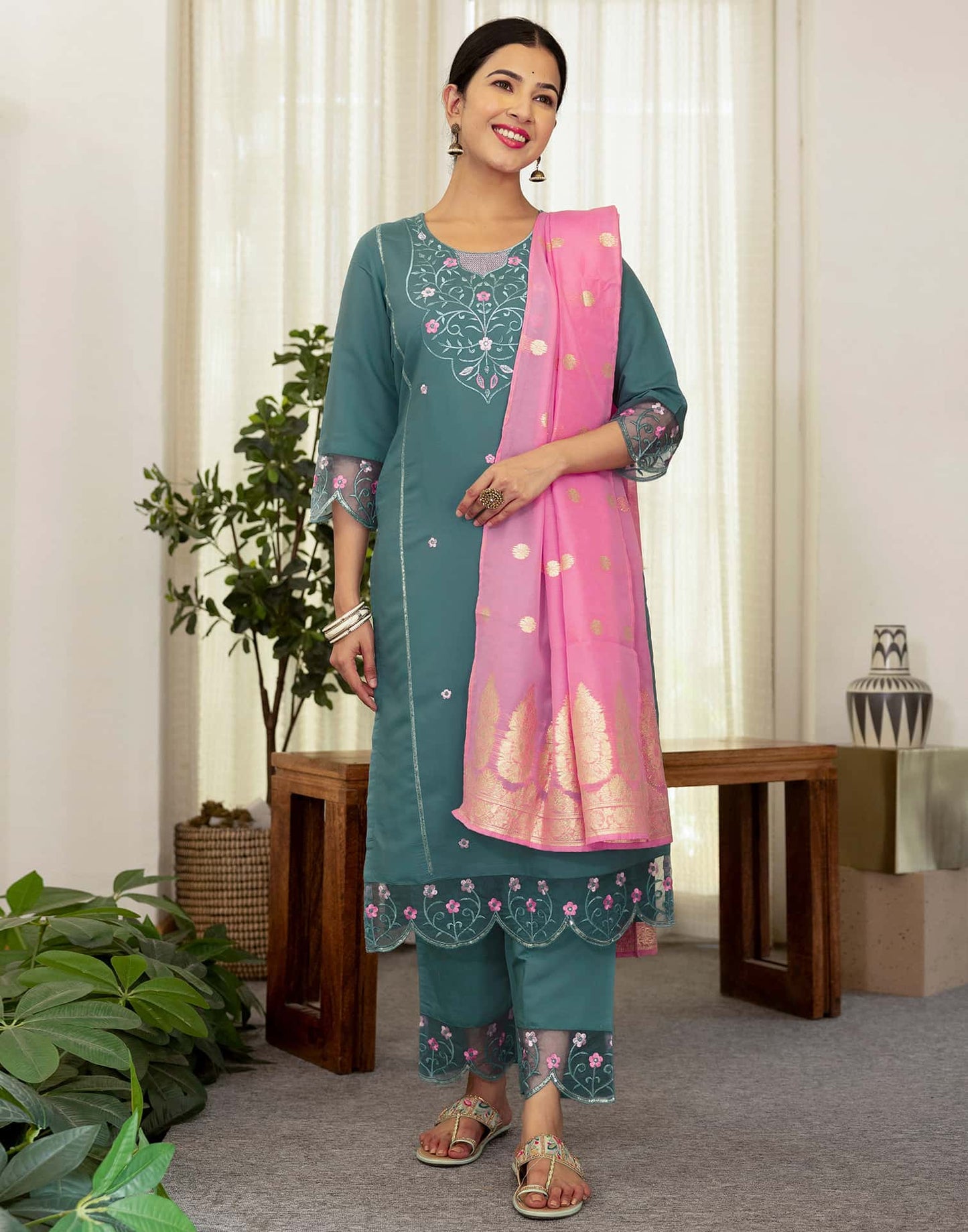 Silk Blend Embroidered Straight Kurta with Pant & Dupatta