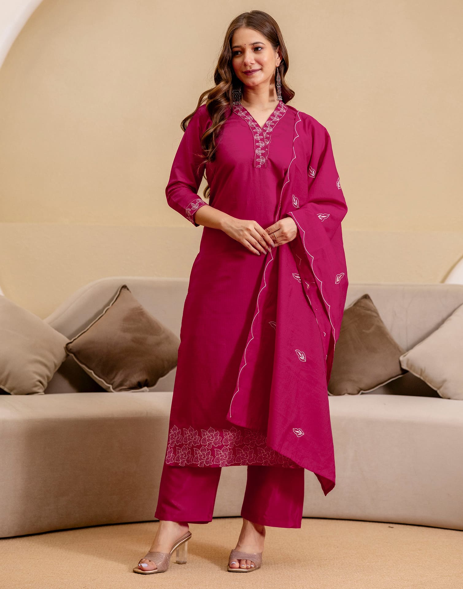 Silk Blend Embroidered Straight Kurta with Pant & Dupatta