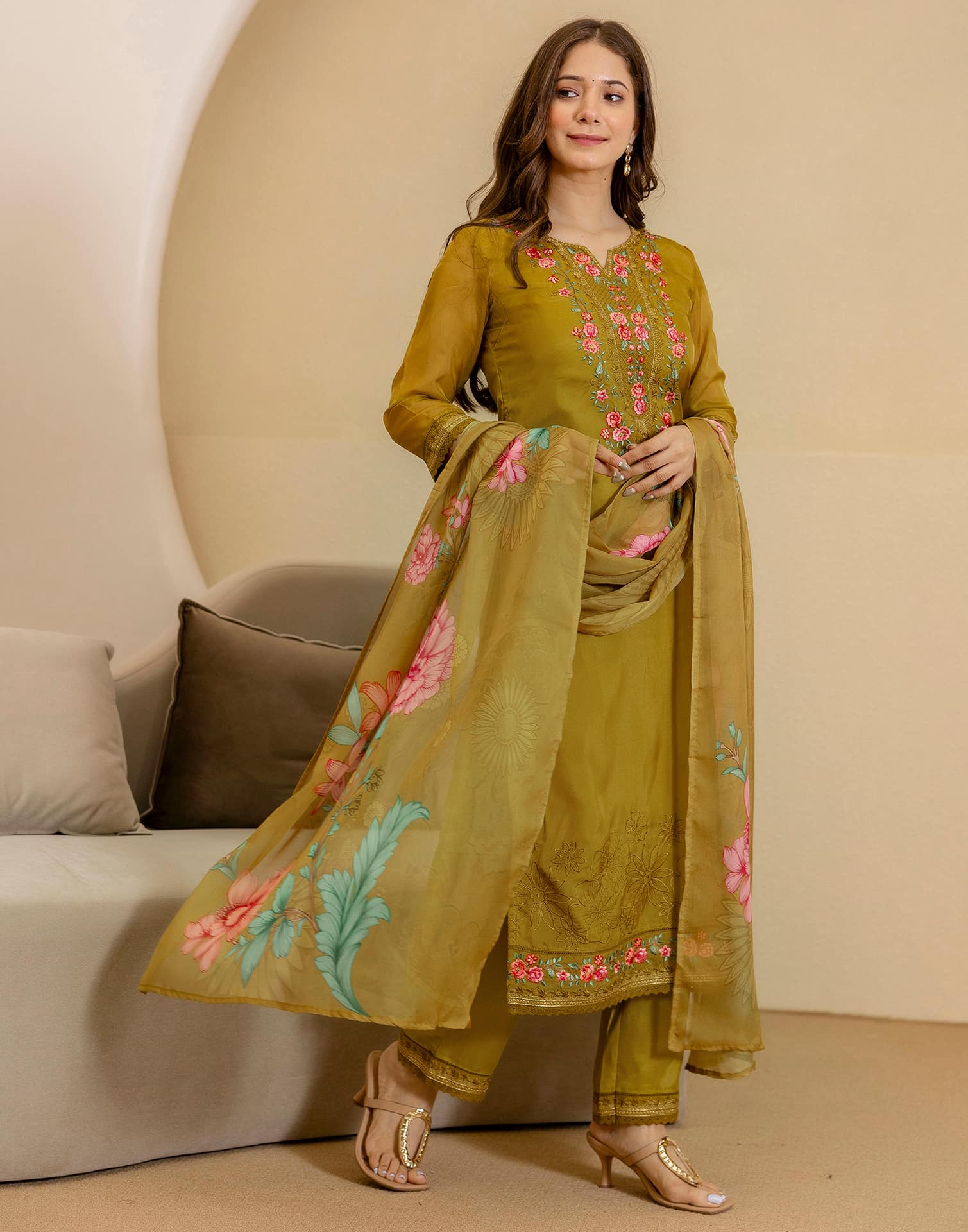 Crafted in Silk Blend with exquisite Embroidered, this Green kurta set is an essential for your ethnic wardrobe. The kurta comes with a V-Neck, paired with Pant and dupatta for a complete look. Ideal for Festive Wear, it ensures ease of movement and lightweight fabric. A perfect choice for festive wear and traditional outfit lovers. All-day Comfort, Semi-formal Wear, Kurta with Pant & Dupatta.