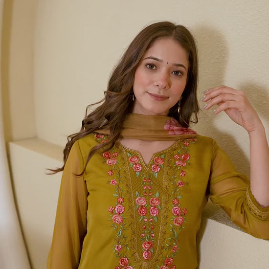 Silk Blend Embroidered Straight Kurta with Pant & Dupatta