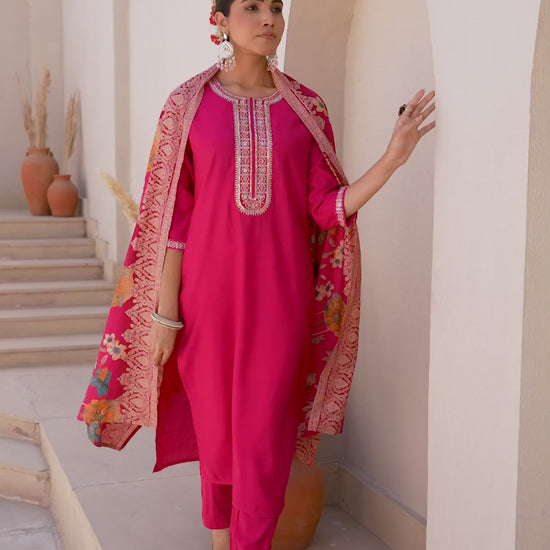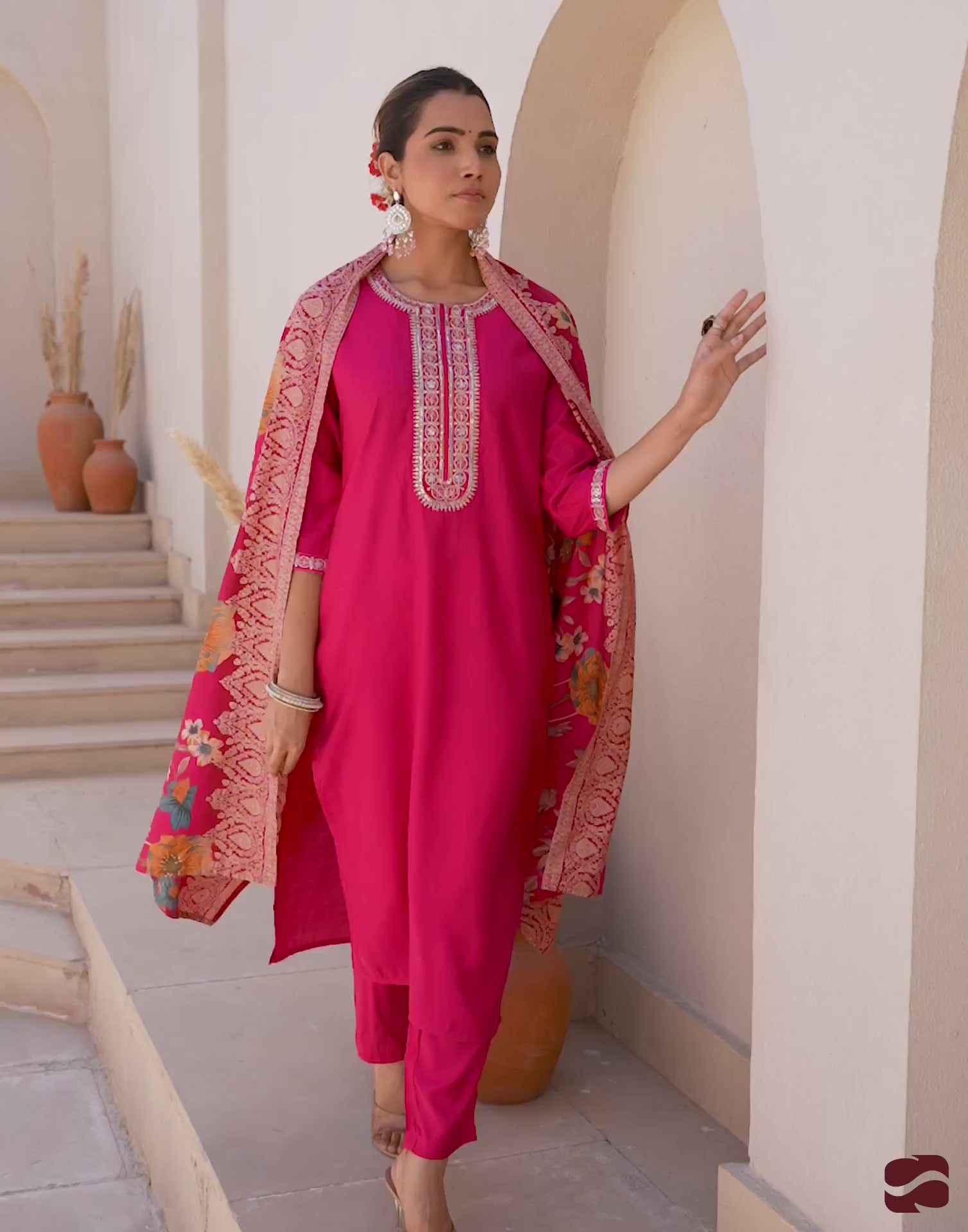 Experience the beauty of tradition with this Pink Silk Blend kurta set. Adorned with Embroidered and styled with a Round Neck, the kurta exudes sophistication. Complemented with Pant and an elegant dupatta, this complete outfit is ideal for Festive Wear. Crafted in India with high-quality fabric, it ensures ease of movement and effortless elegance. Casual Wear, Ethnic Wear for Women, Matching Bottoms.