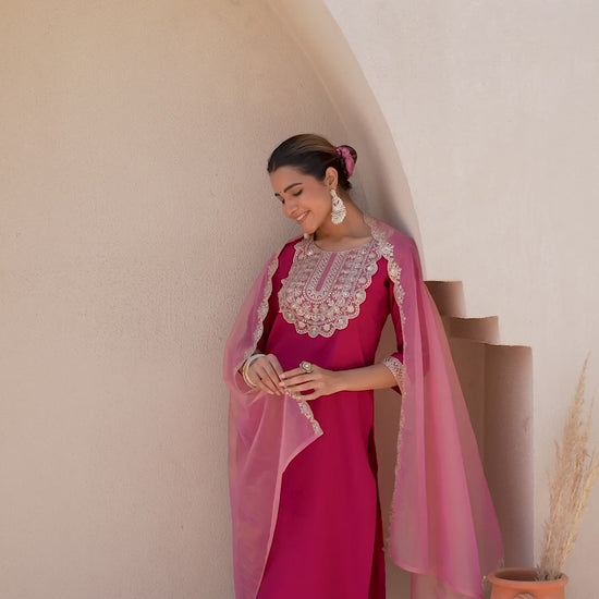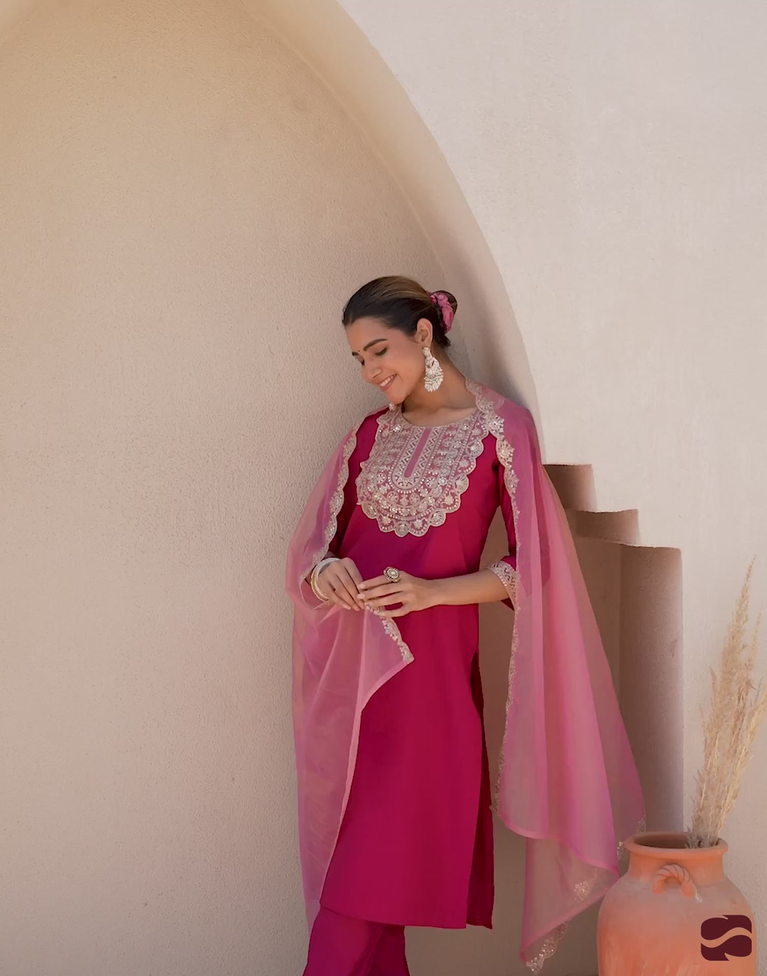 Crafted in Silk Blend with exquisite Embroidered, this Pink kurta set is an essential for your ethnic wardrobe. The kurta comes with a Round Neck, paired with Pant and dupatta for a complete look. Ideal for Festive Wear, it ensures ease of movement and soft & breathable fabric. A perfect choice for festive wear and traditional outfit lovers. High-quality Fabric, Comfortable Wear, Matching Bottoms.
