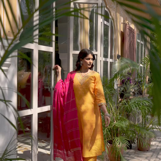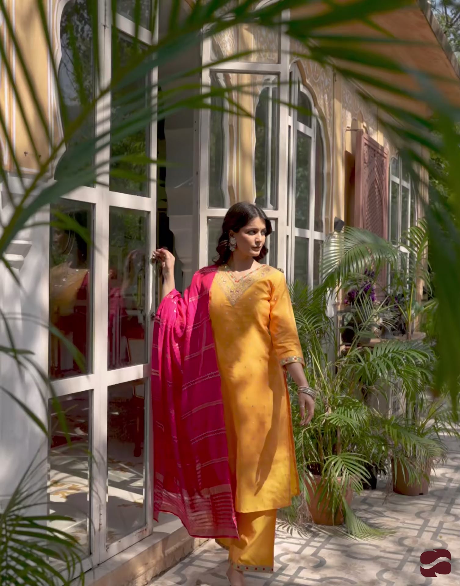 Silk Blend Embroidery and Sequins Work, Weaving, Lace Straight Kurta with Pant & Dupatta