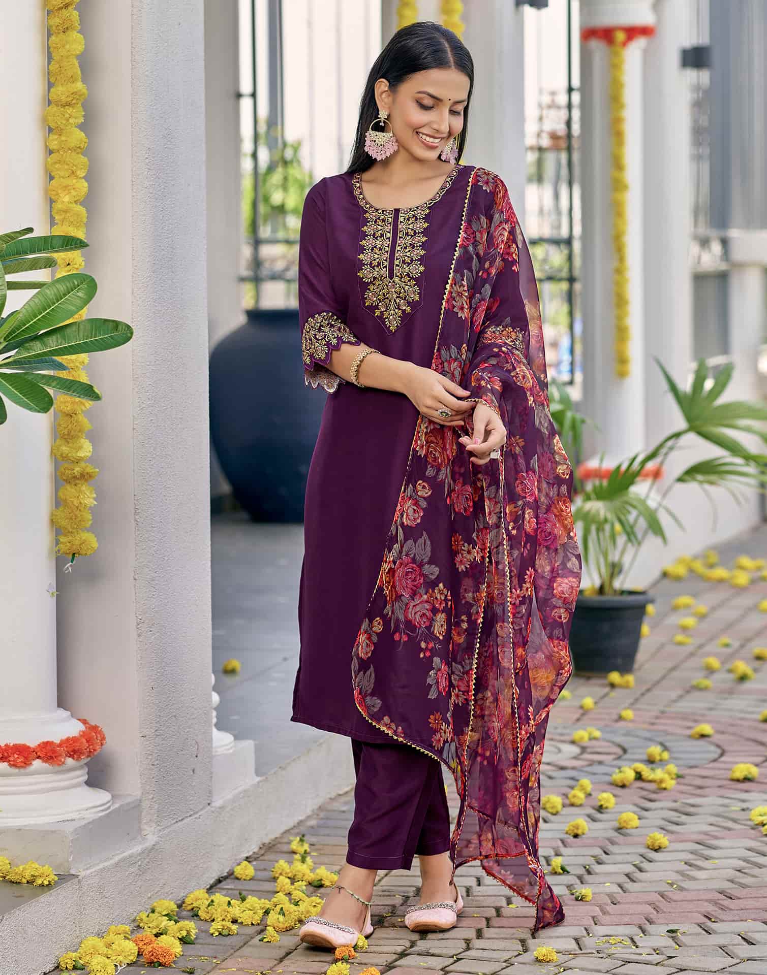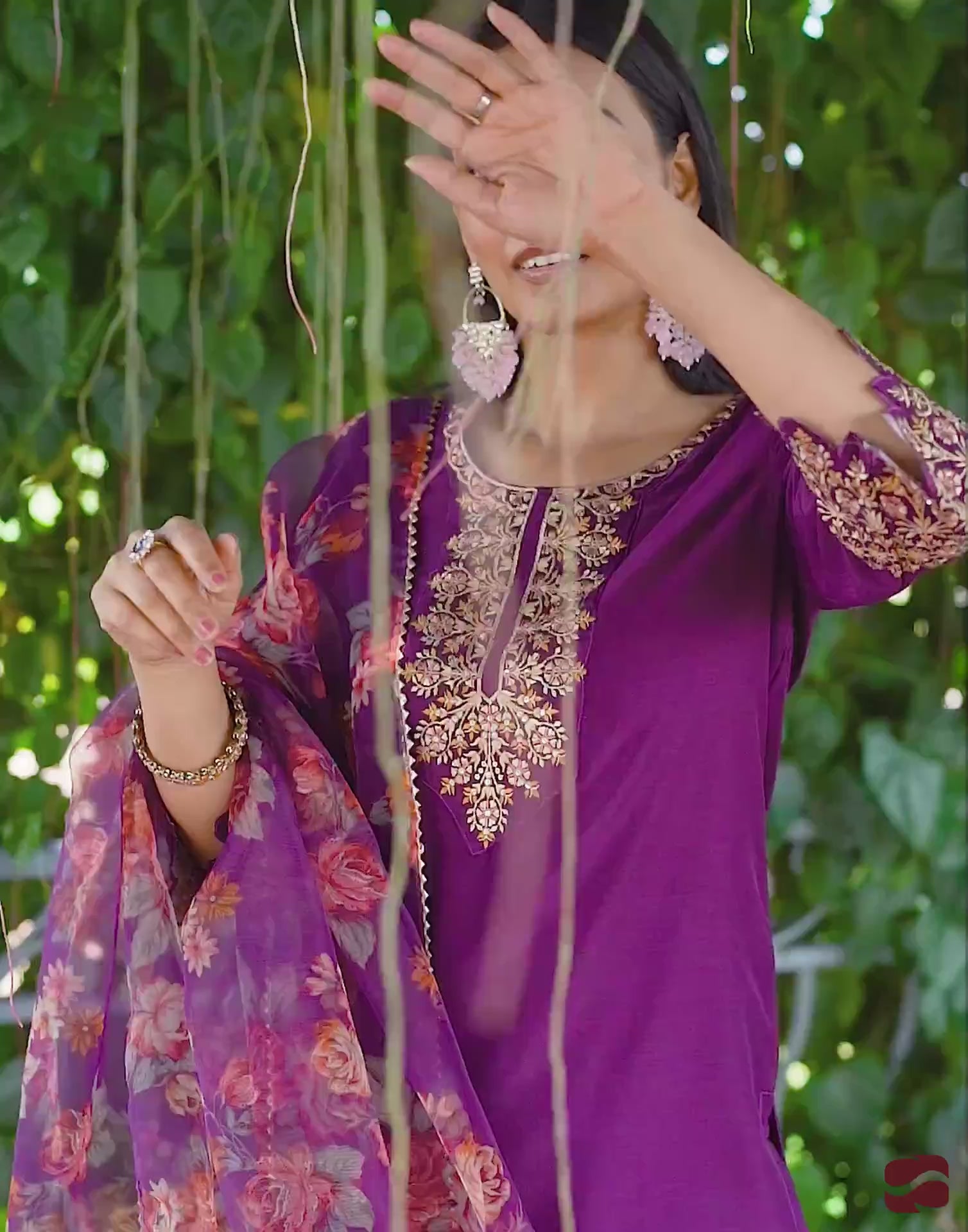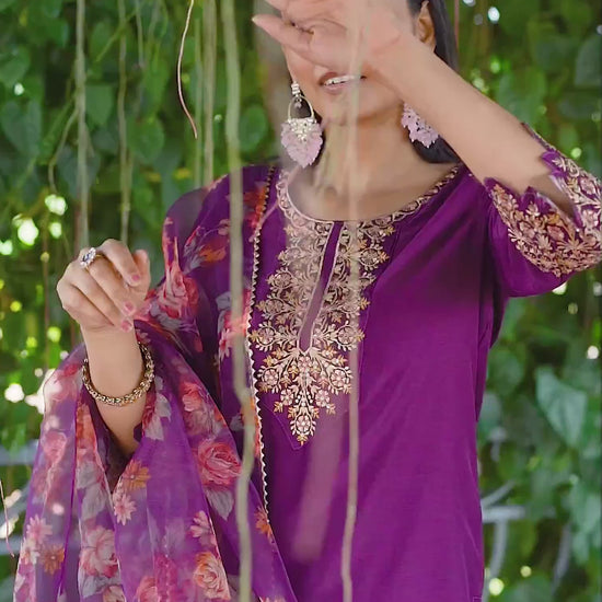 Elevate your ethnic wardrobe with this Silk Blend kurta set in Purple. Designed with Solid and a Round Neck, the kurta offers a comfortable fit and stylish finish. The set includes Pant and a dupatta, completing the look. Suitable for Festive Wear, it combines premium fabric, ease of movement, and modern design. Semi-formal Wear, Graceful Silhouette, Matching Bottoms.
