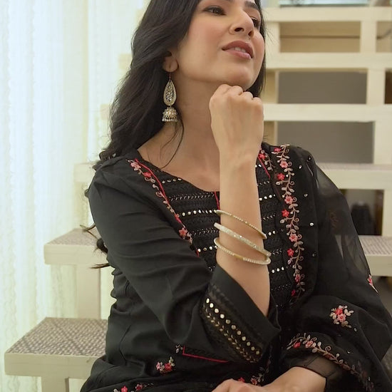Crafted in Silk Blend with exquisite Embroidered, this Black kurta set is an essential for your ethnic wardrobe. The kurta comes with a Round Neck, paired with Pant and dupatta for a complete look. Ideal for Festive Wear, it ensures ease of movement and lightweight fabric. A perfect choice for festive wear and traditional outfit lovers. Matching Bottoms, Family Function Wear, Traditional Occasion Outfit.