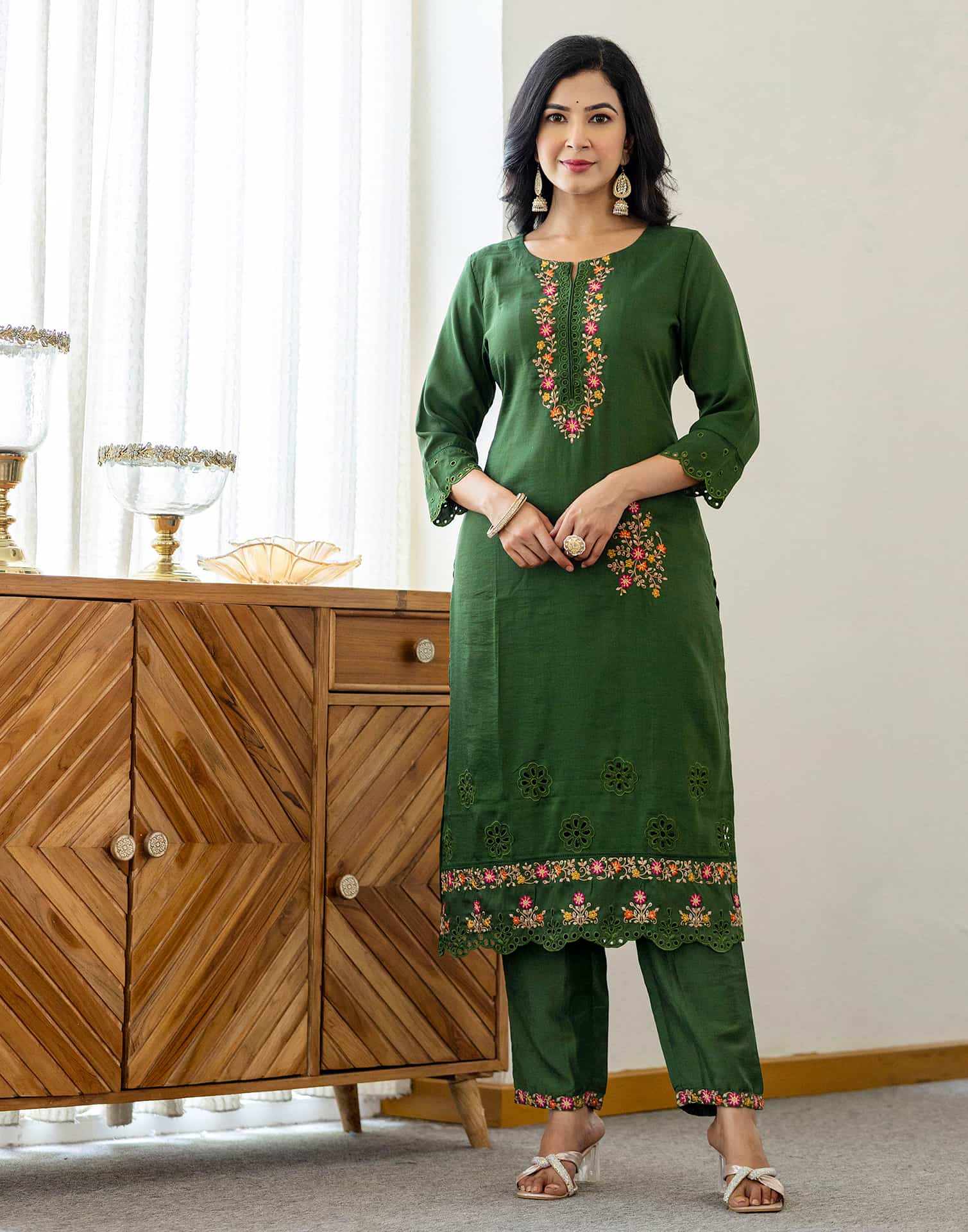 Silk Blend Embroidery, Sequins Work and Embroidery Lace Straight Kurta with Pant & Dupatta