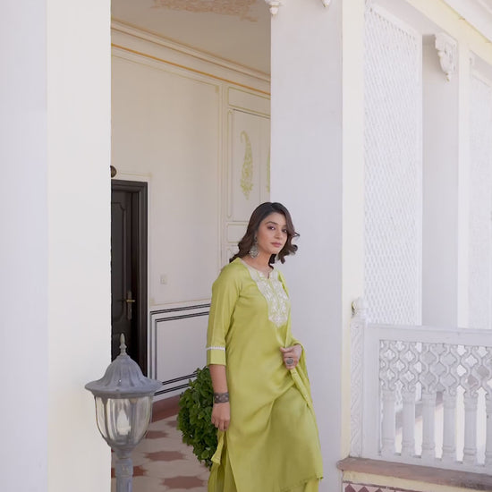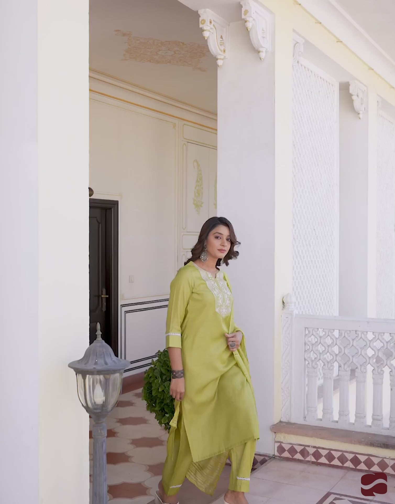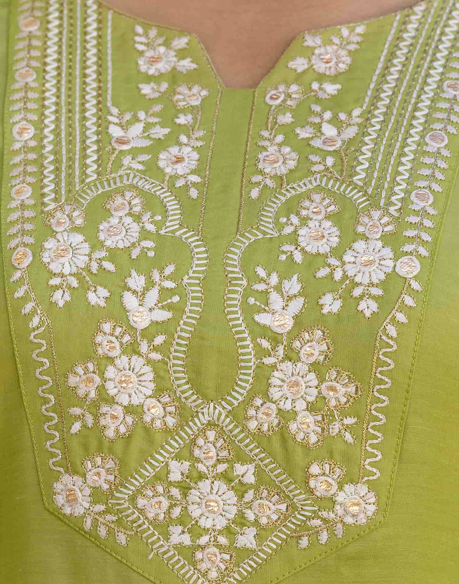 Experience the beauty of tradition with this Green Silk Blend kurta set. Adorned with Embroidered and styled with a Keyhole Neck, the kurta exudes sophistication. Complemented with Pant and an elegant dupatta, this complete outfit is ideal for Festive Wear. Crafted in India with soft & breathable fabric, it ensures ease of movement and effortless elegance. Breathable Kurta, Ethnic Wear for Women, Matching Bottoms.