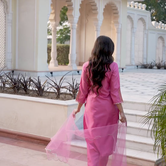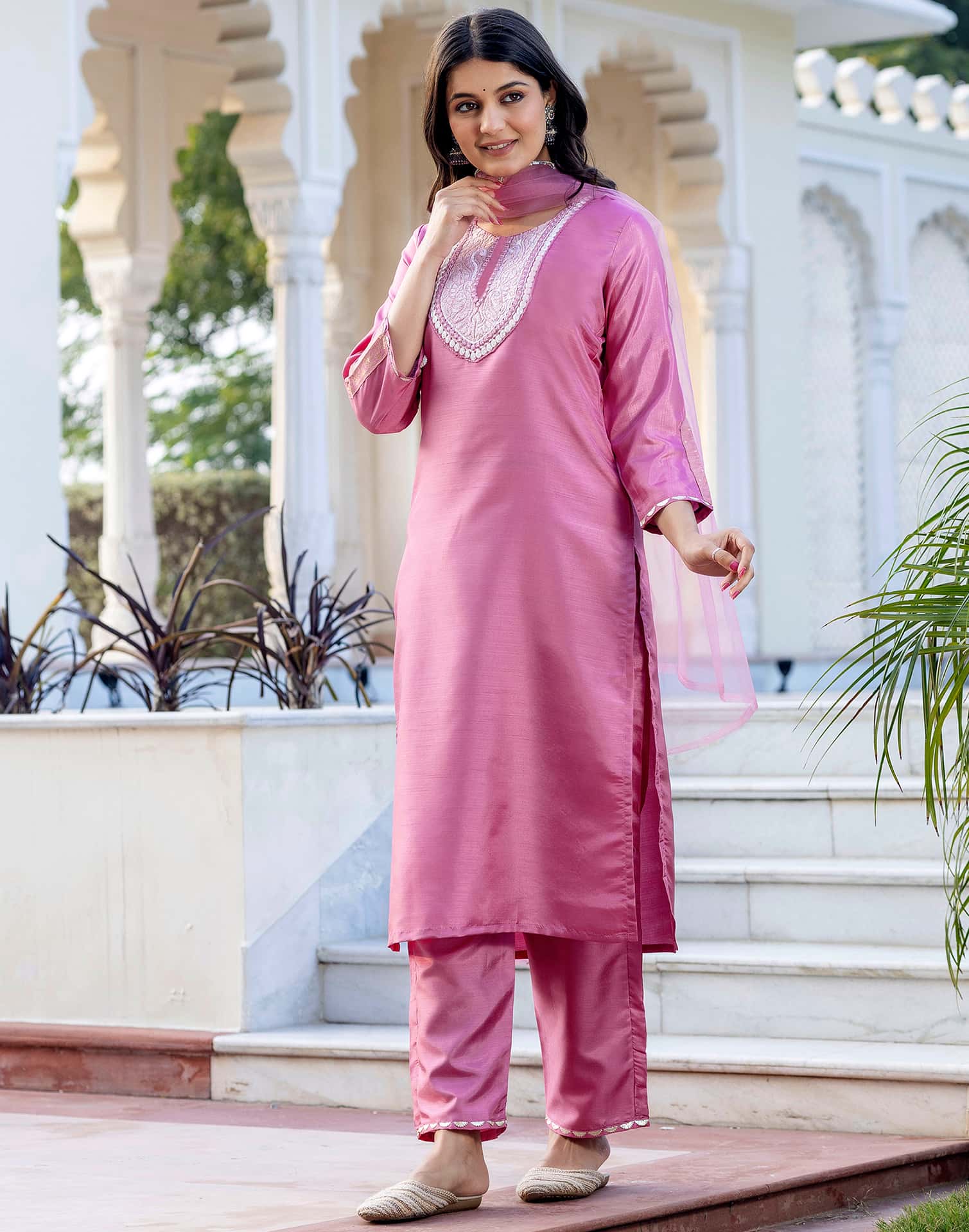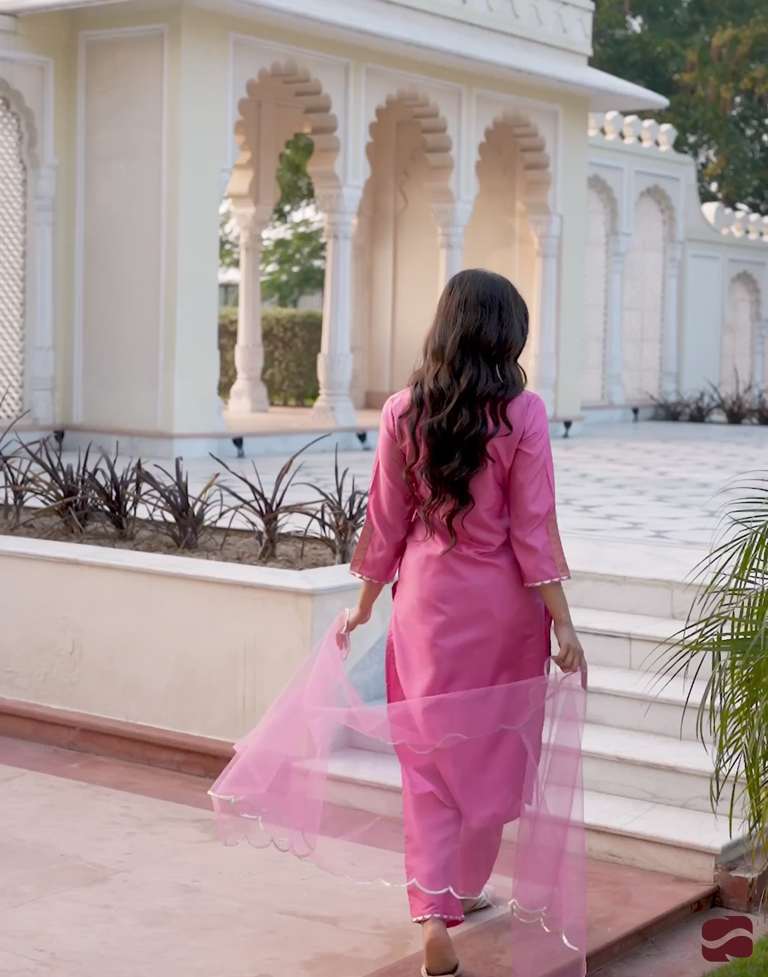This Pink Silk Blend kurta set is beautifully designed with Solid. The kurta features a Round Neck and a graceful silhouette for an elegant appeal. It is paired with Pant and a matching dupatta, making it a complete kurta set. Perfect for Festive Wear, this ethnic wear for women offers lightweight fabric, ease of movement, and timeless charm. Indian Wear, Ethnic Wear for Women, Ease of Movement.