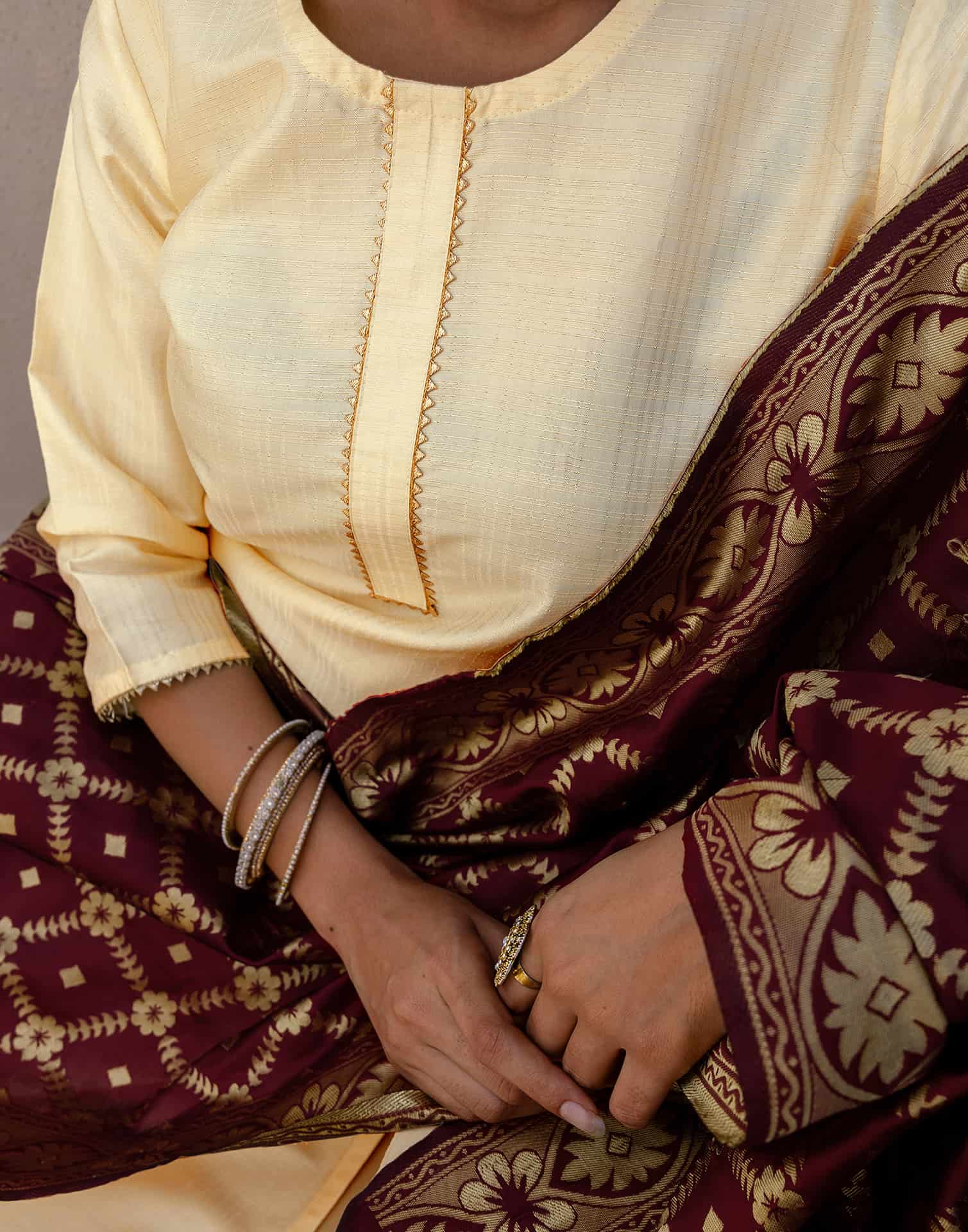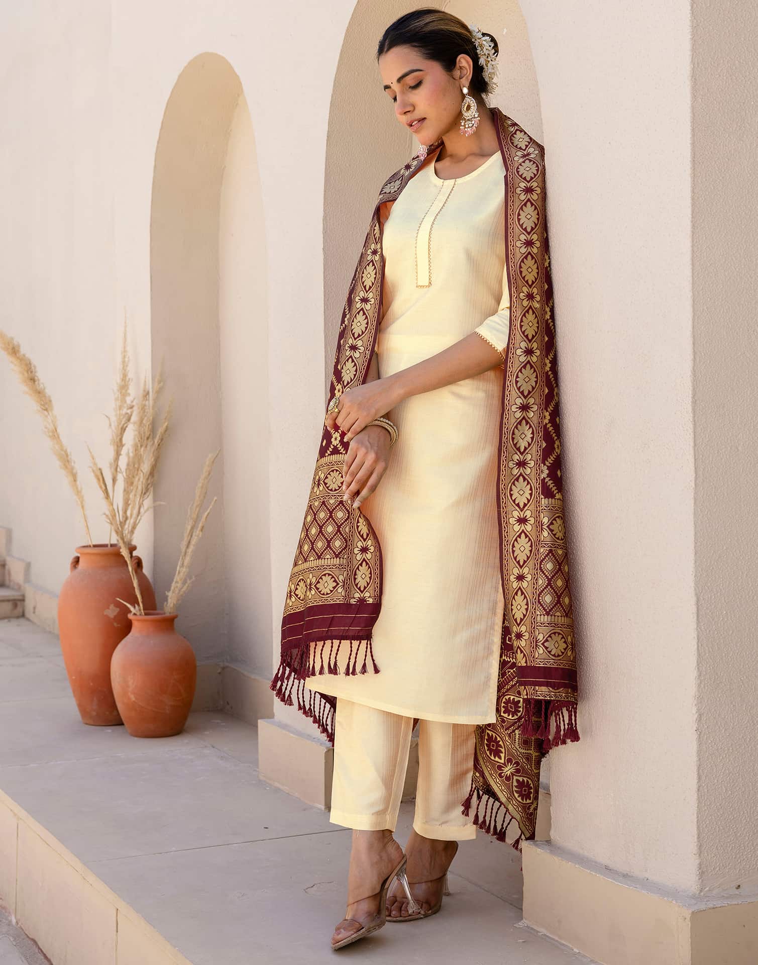 This Beige Silk Blend kurta set with Solid is crafted for women who love Indian wear with a modern twist. The kurta’s Round Neck and graceful cut enhance its style, while Pant and dupatta complete the ensemble. Designed for Festive Wear, it promises soft & breathable fabric, comfortable wear, and lasting appeal. Casual Wear, Comfortable Wear, Traditional Outfit.