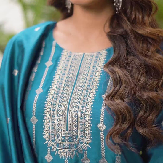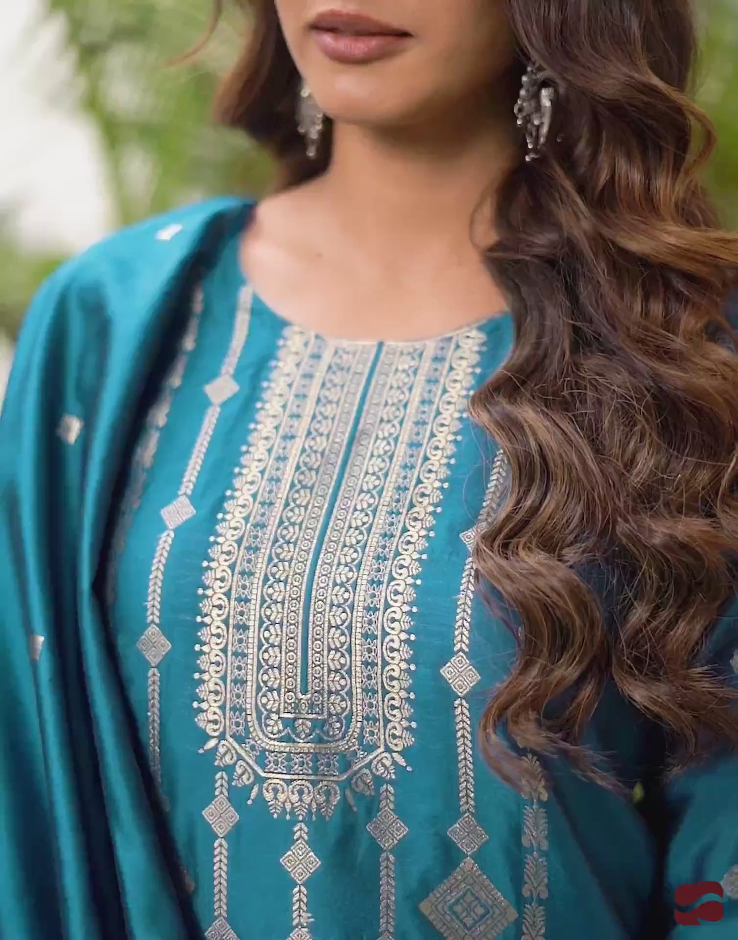Silk Blend Jacquard Work Straight Kurta with Pant & Dupatta