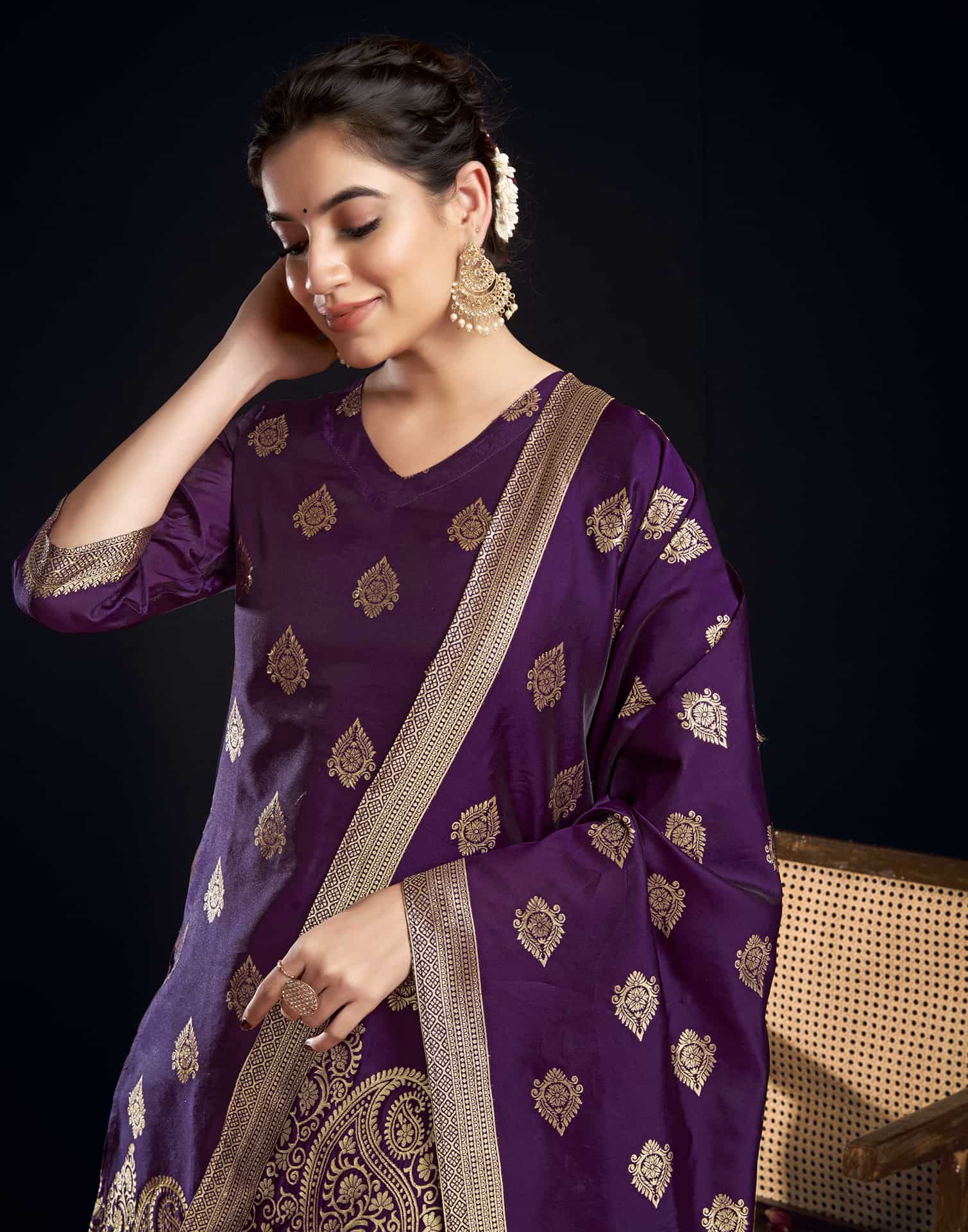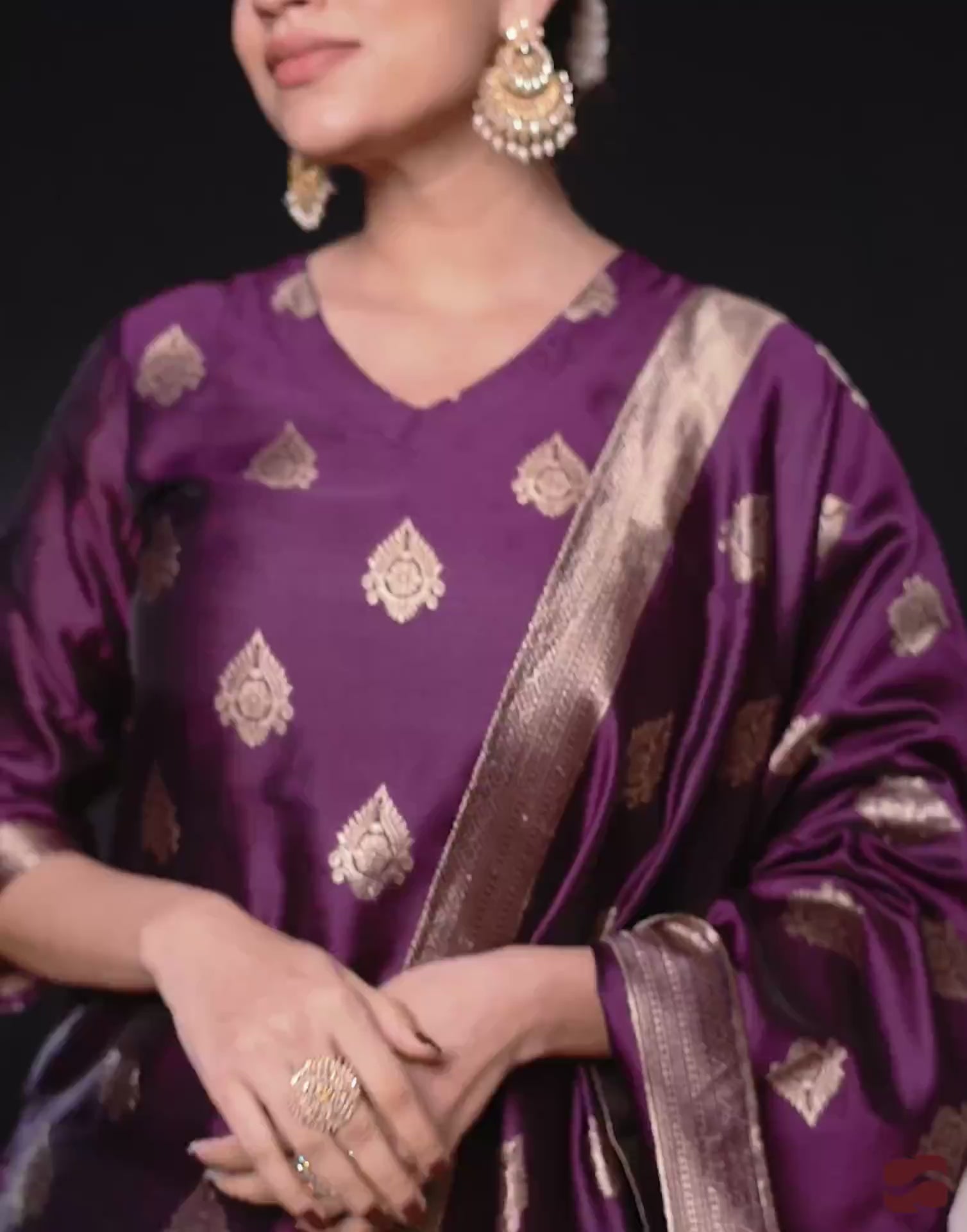 Bring elegance to every occasion with this Purple Silk Blend kurta set. Featuring Printed on the kurta and a V-Neck, it radiates traditional charm. Styled with Pant and dupatta, this outfit is ideal for Traditional Occasion Outfit. Its premium fabric ensures breathability and comfortable wear, while the dupatta adds a touch of grace. Matching Bottoms, All-day Comfort, Semi-formal Wear.