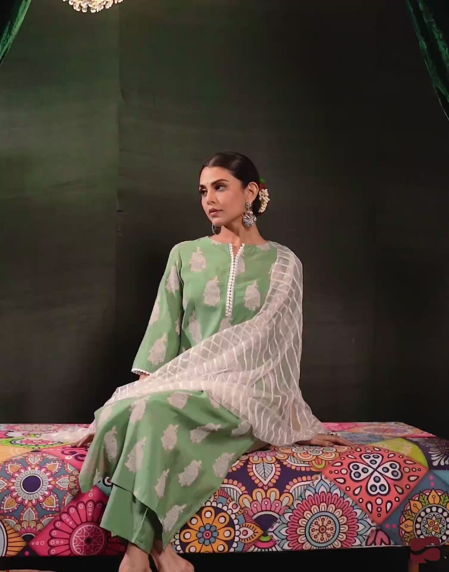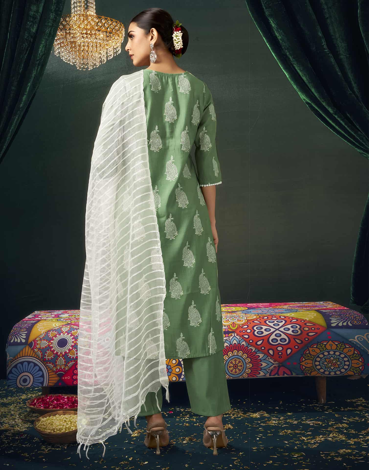 This Green Silk Blend kurta set with Printed is crafted for women who love Indian wear with a modern twist. The kurta’s V-Neck and graceful cut enhance its style, while Pant and dupatta complete the ensemble. Designed for Traditional Occasion Outfit, it promises soft & breathable fabric, ease of movement, and lasting appeal. Family Function Wear, Ethnic Wear for Women, Elegant Dupatta.