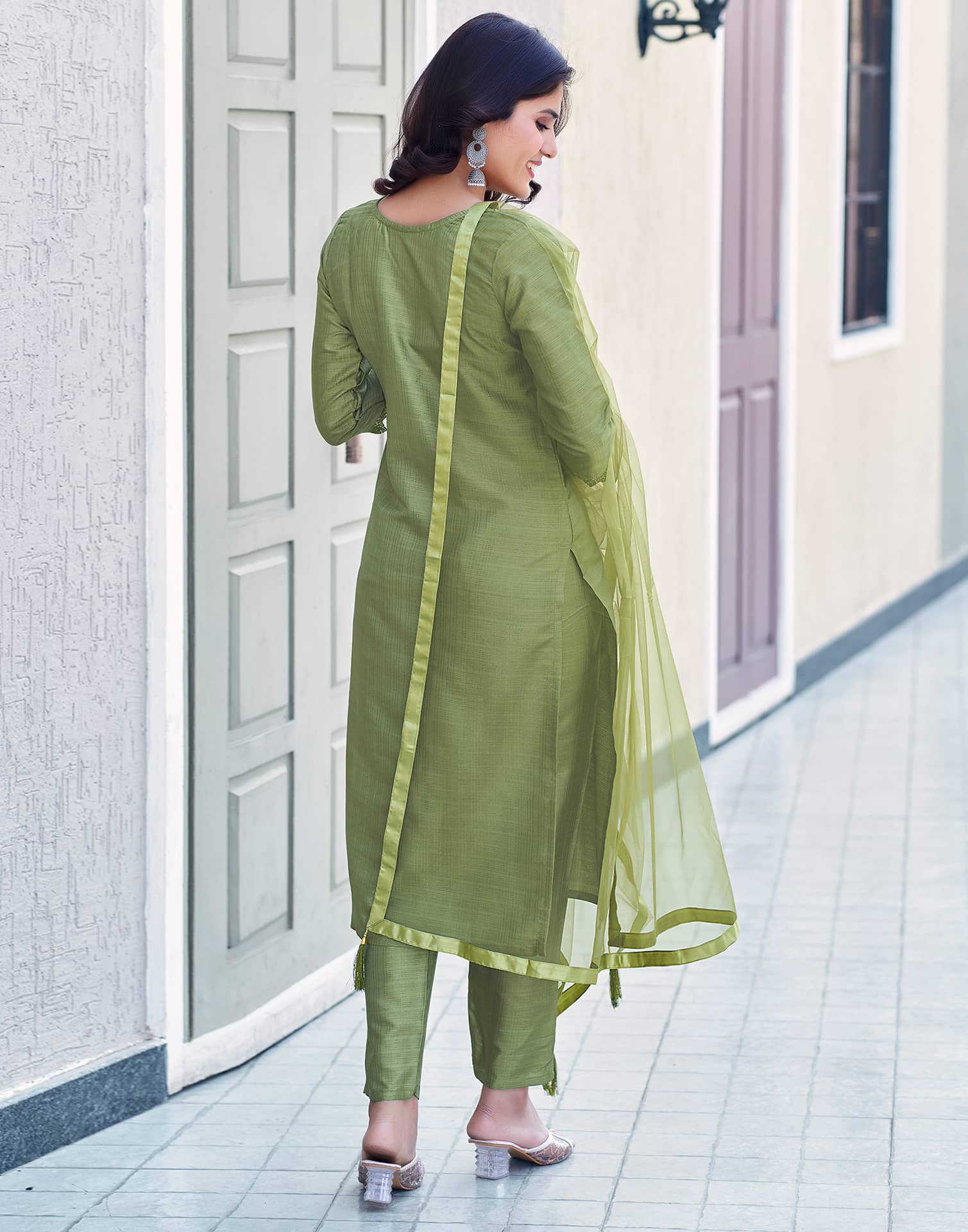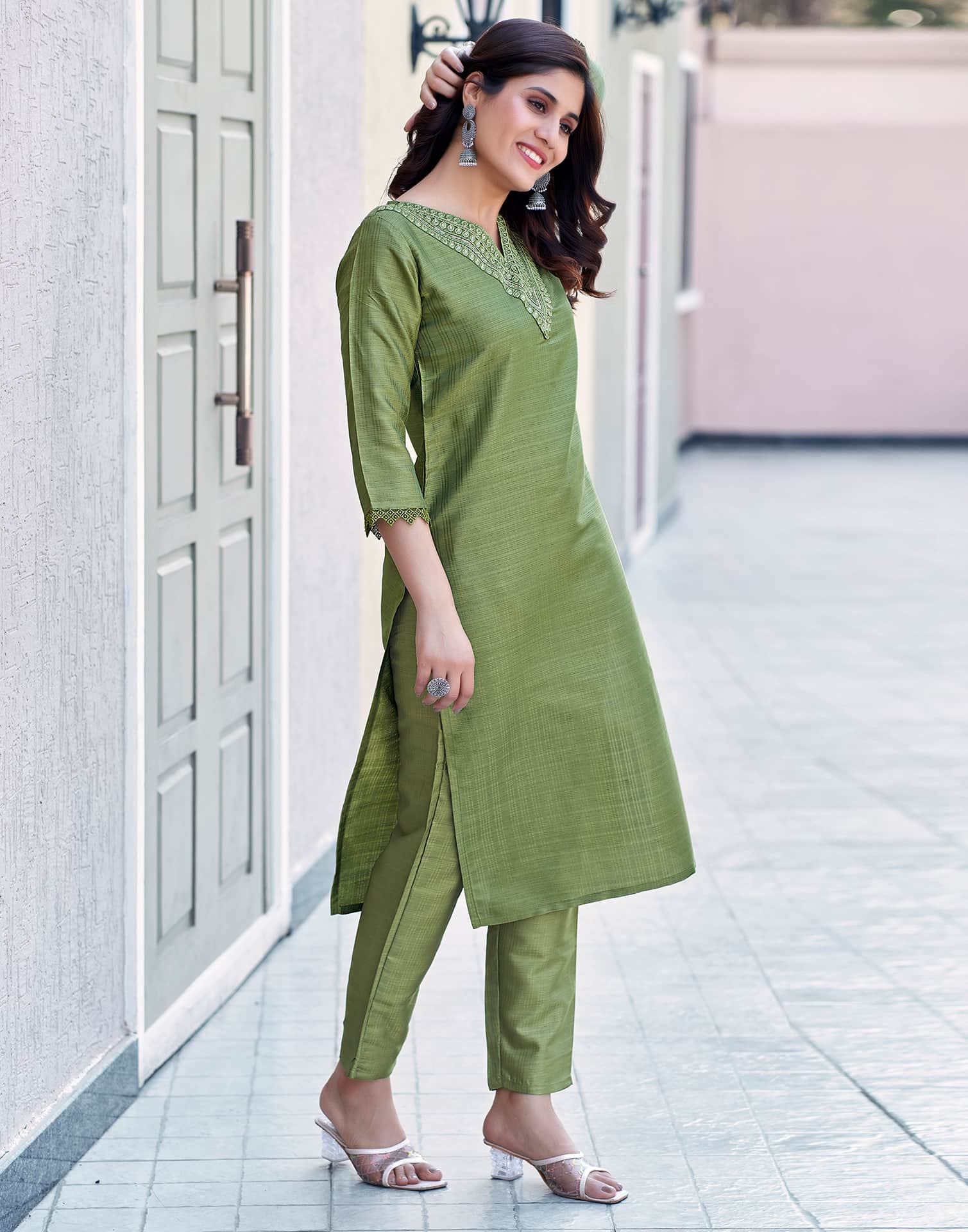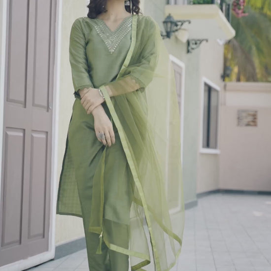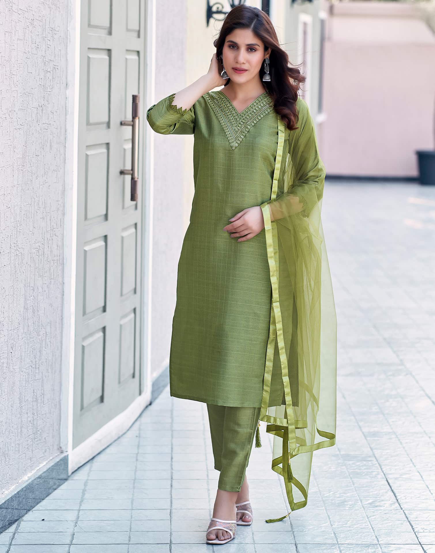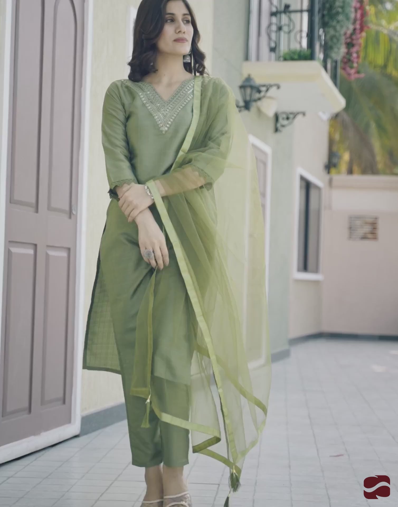 This Green Silk Blend kurta set with Embroidered is crafted for women who love Indian wear with a modern twist. The kurta’s V-Neck and graceful cut enhance its style, while Pant and dupatta complete the ensemble. Designed for Festive Wear, it promises high-quality fabric, all-day comfort, and lasting appeal. Family Function Wear, Semi-formal Wear, Indian Wear.