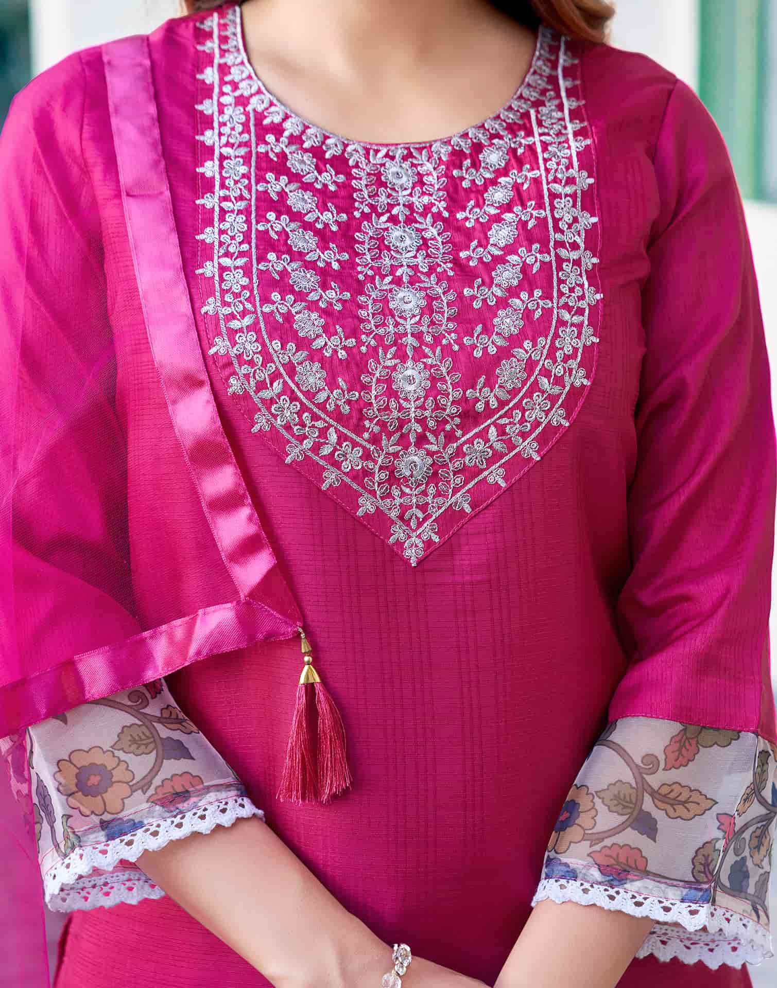 Bring elegance to every occasion with this Pink Silk Blend kurta set. Featuring Embroidered on the kurta and a Round Neck, it radiates traditional charm. Styled with Pant and dupatta, this outfit is ideal for Festive Wear. Its lightweight fabric ensures breathability and comfortable wear, while the dupatta adds a touch of grace. Elegant Dupatta, Casual Wear, Traditional Occasion Outfit.