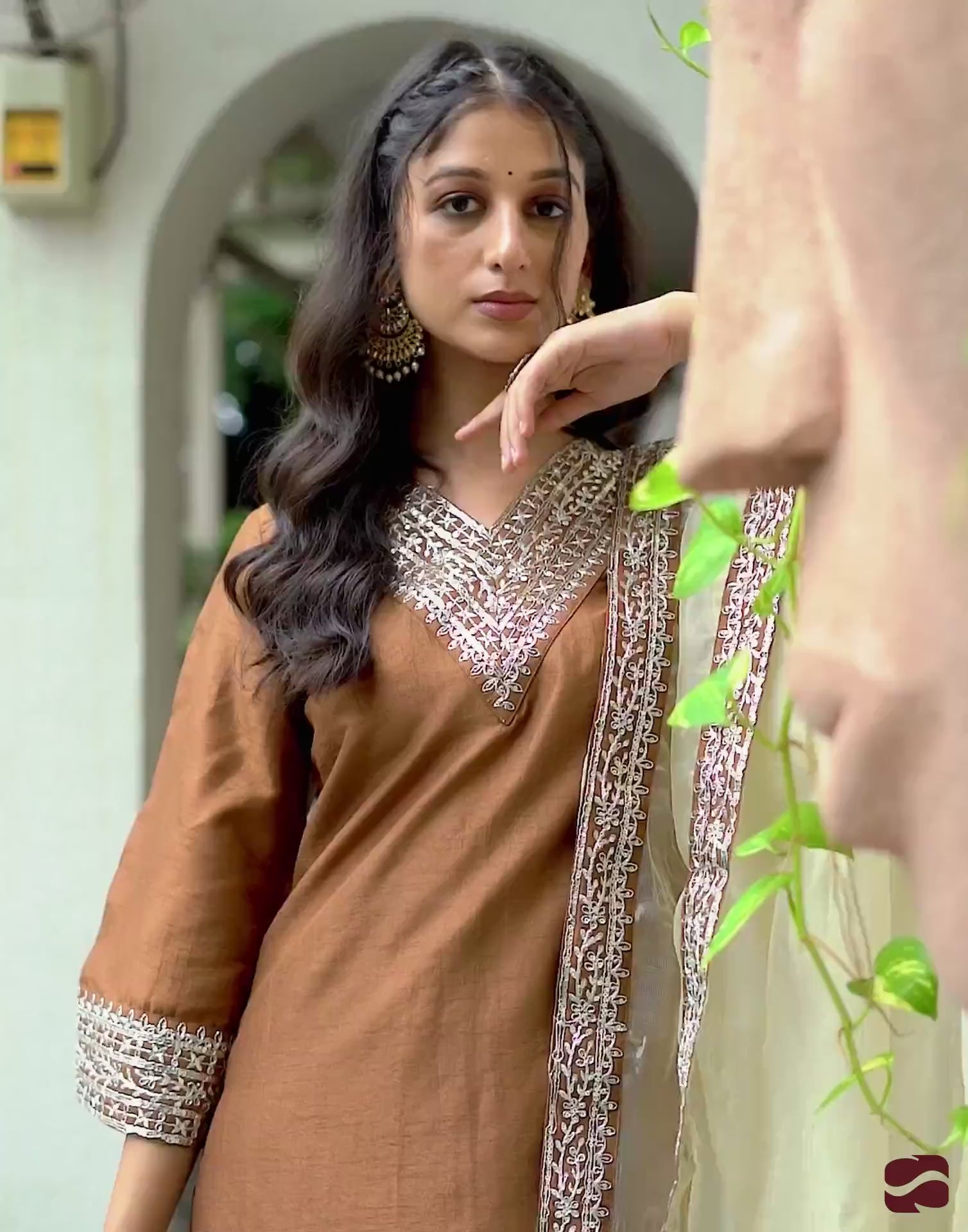 Silk Blend Sequins Embroidery Lace Straight Kurta with Pant & Dupatta