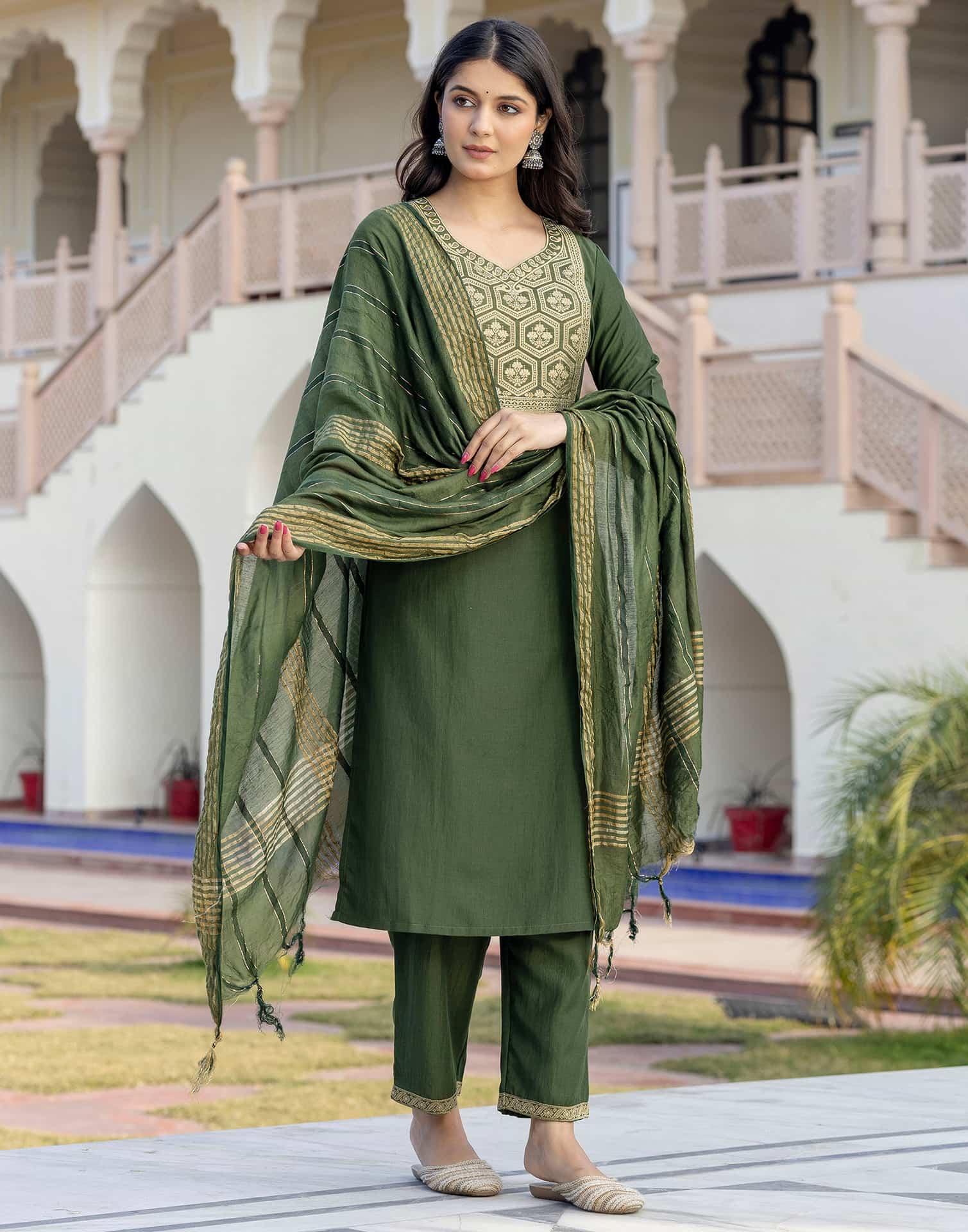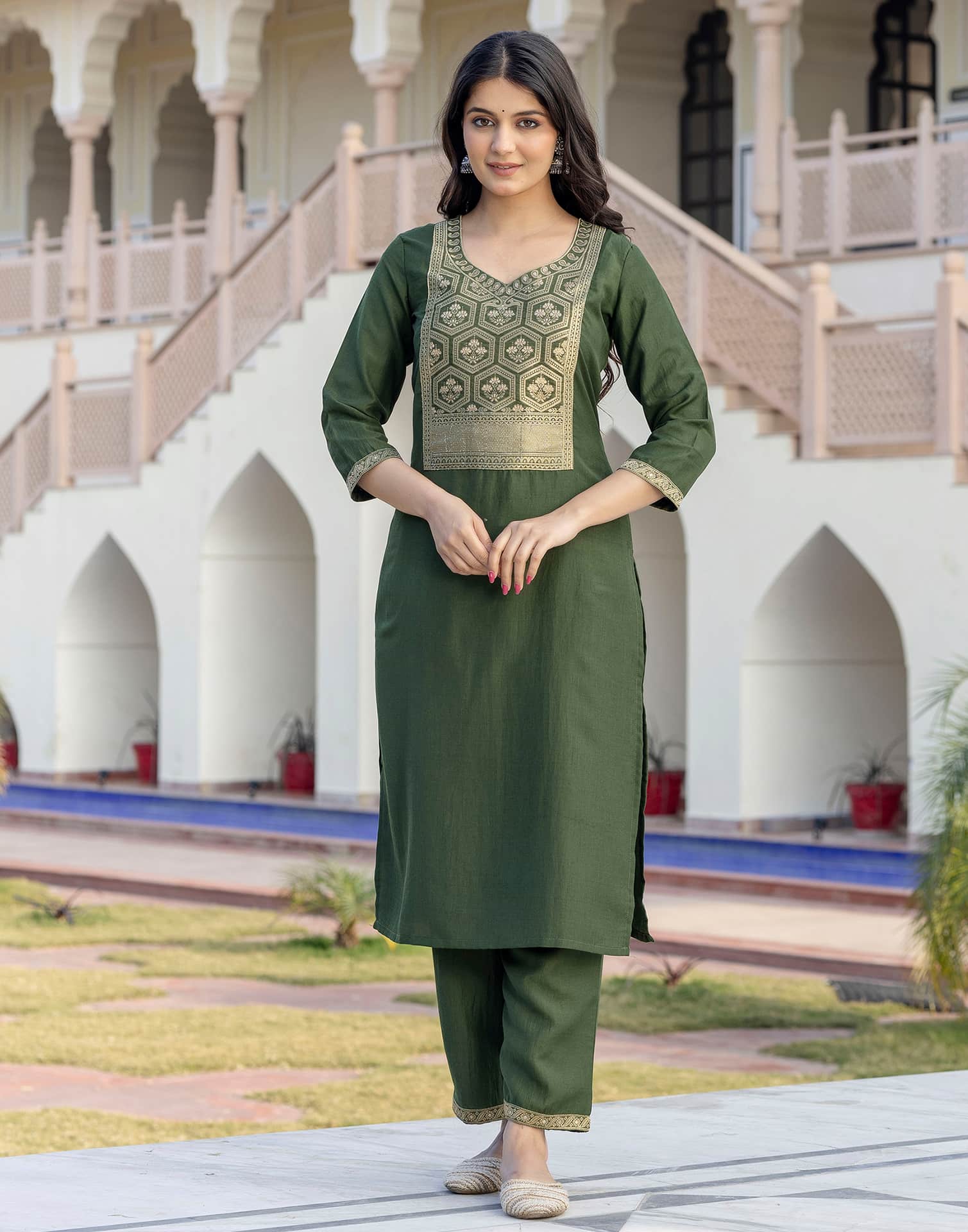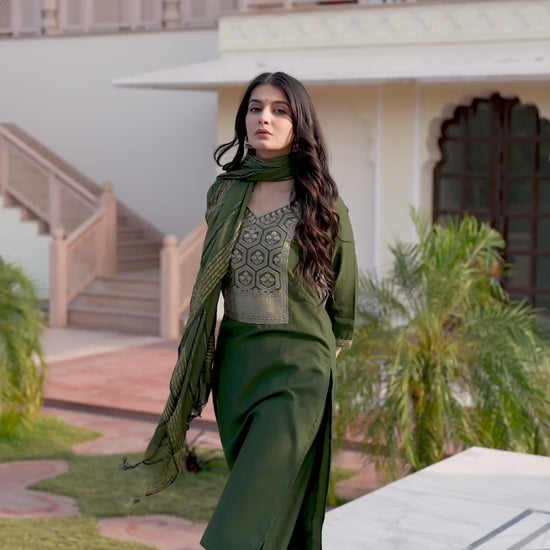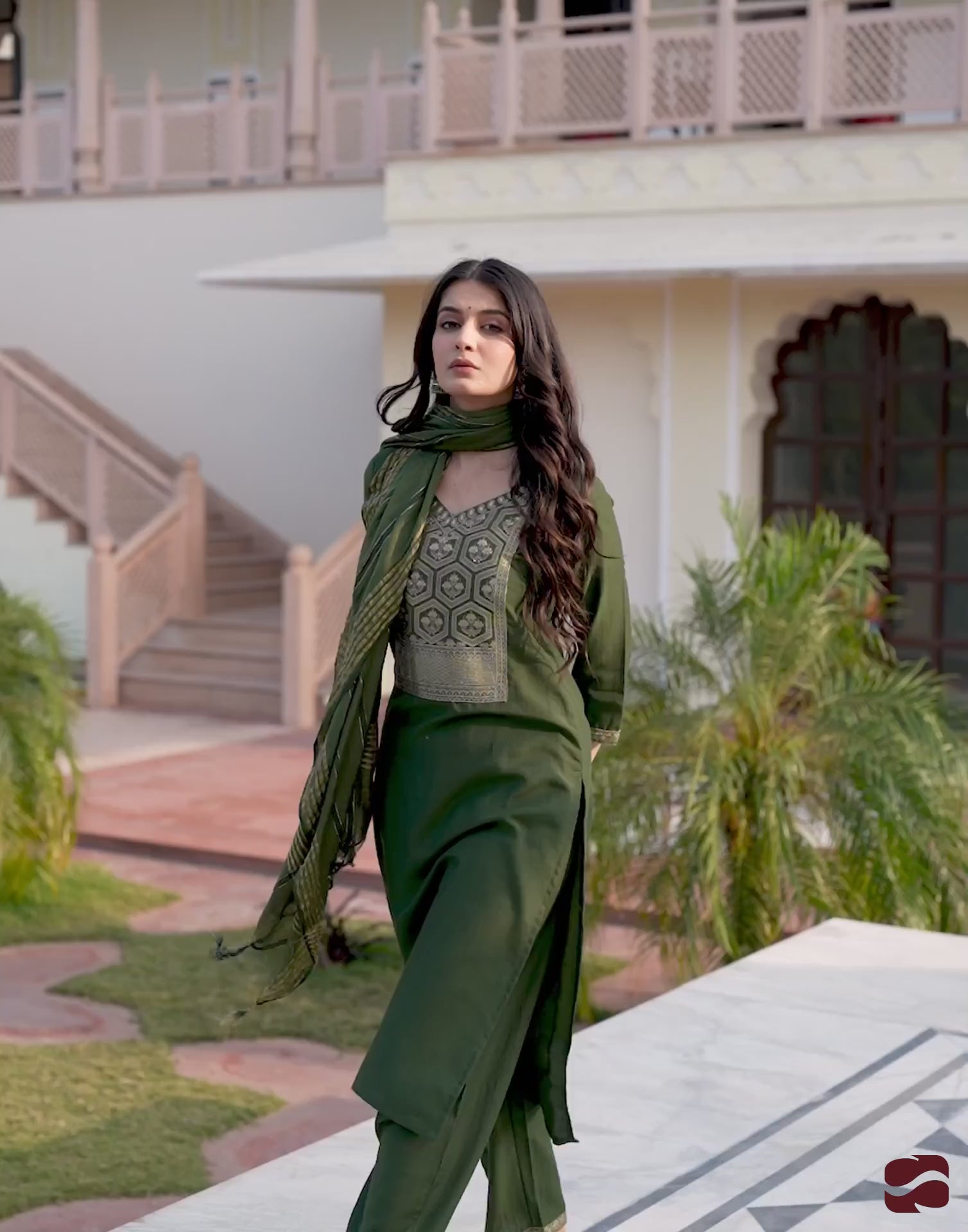Elevate your ethnic wardrobe with this Silk Blend kurta set in Green. Designed with Woven Design and a Boat Neck, the kurta offers a comfortable fit and stylish finish. The set includes Pant and a dupatta, completing the look. Suitable for Festive Wear, it combines soft & breathable fabric, all-day comfort, and modern design. Comfortable Fit, Lightweight Fabric, Semi-formal Wear.