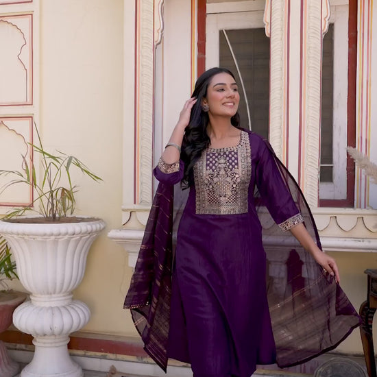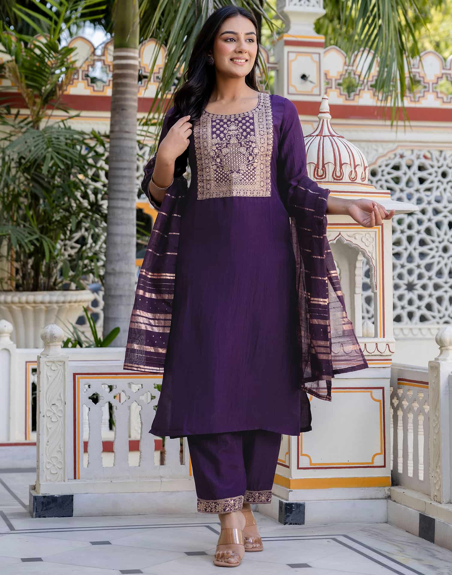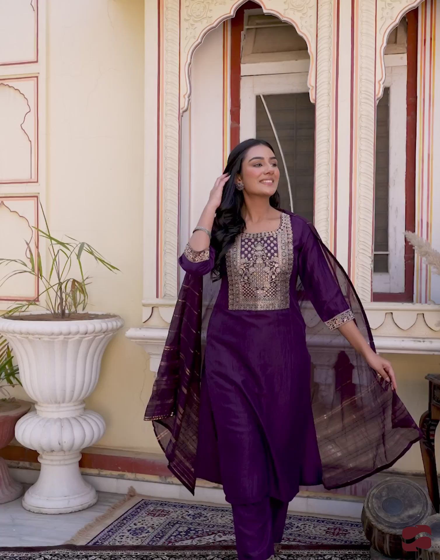 Experience the beauty of tradition with this Purple Silk Blend kurta set. Adorned with Woven Design and styled with a Round Neck, the kurta exudes sophistication. Complemented with Pant and an elegant dupatta, this complete outfit is ideal for Festive Wear. Crafted in India with premium fabric, it ensures all-day comfort and effortless elegance. Elegant Dupatta, Indian Wear, Casual Wear.